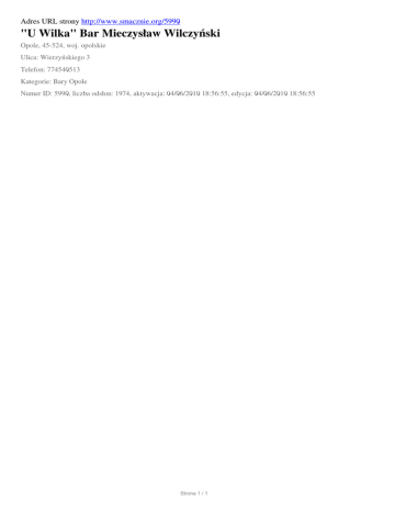 Adres URL strony http://www.smacznie.org/5990 "U Wilka" Bar Mieczysław Wilczyński Opole, 45-524, woj. opolskie Ulica: Wierzyńskiego 3 Telefon: 774540513 Kategorie: Bary Opole Numer ID: 5990, liczba odsłon: 1974, aktywacja: 04/06/2010 18:56:55, edycja: 04/06/2010 18:56:55 Strona 1 / 1