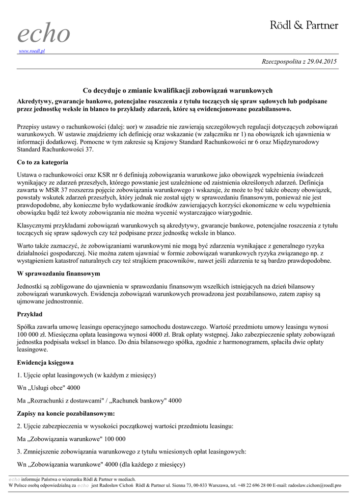 echo www.roedl.pl Rzeczpospolita z 29.04.2015 Co decyduje o zmianie kwalifikacji zobowiązań warunkowych Akredytywy, gwarancje bankowe, potencjalne roszczenia z tytułu toczących się spraw sądowych lub podpisane przez jednostkę weksle in blanco to przykłady zdarzeń, które są ewidencjonowane pozabilansowo. Przepisy ustawy o rachunkowości (dalej: uor) w zasadzie nie zawierają szczegółowych regulacji dotyczących zobowiązań warunkowych. W ustawie znajdziemy ich definicję oraz wskazanie (w załączniku nr 1) na obowiązek ich ujawnienia w informacji dodatkowej. Pomocne w tym zakresie są Krajowy Standard Rachunkowości nr 6 oraz Międzynarodowy Standard Rachunkowości 37. Co to za kategoria Ustawa o rachunkowości oraz KSR nr 6 definiują zobowiązania warunkowe jako obowiązek wypełnienia świadczeń wynikający ze zdarzeń przeszłych, którego powstanie jest uzależnione od zaistnienia określonych zdarzeń. Definicja zawarta w MSR 37 rozszerza pojęcie zobowiązania warunkowego i wskazuje, że może to być także obecny obowiązek, powstały wskutek zdarzeń przeszłych, który jednak nie został ujęty w sprawozdaniu finansowym, ponieważ nie jest prawdopodobne, aby konieczne było wydatkowanie środków zawierających korzyści ekonomiczne w celu wypełnienia obowiązku bądź też kwoty zobowiązania nie można wycenić wystarczająco wiarygodnie. Klasycznymi przykładami zobowiązań warunkowych są akredytywy, gwarancje bankowe, potencjalne roszczenia z tytułu toczących się spraw sądowych czy też podpisane przez jednostkę weksle in blanco. Warto także zaznaczyć, że zobowiązaniami warunkowymi nie mogą być zdarzenia wynikające z generalnego ryzyka działalności gospodarczej. Nie można zatem ujawniać w formie zobowiązań warunkowych ryzyka związanego np. z wystąpieniem katastrof naturalnych czy też strajkiem pracowników, nawet jeśli zdarzenia te są bardzo prawdopodobne. W sprawozdaniu finansowym Jednostki są zobligowane do ujawnienia w sprawozdaniu finansowym wszelkich istniejących na dzień bilansowy zobowiązań warunkowych. Ewidencja zobowiązań warunkowych prowadzona jest pozabilansowo, zatem zapisy są ujmowane jednostronnie. Przykład Spółka zawarła umowę leasingu operacyjnego samochodu dostawczego. Wartość przedmiotu umowy leasingu wynosi 100 000 zł. Miesięczna opłata leasingowa wynosi 4000 zł. Brak opłaty wstępnej. Jako zabezpieczenie spłaty zobowiązań jednostka podpisała weksel in blanco. Do dnia bilansowego spółka, zgodnie z harmonogramem, spłaciła dwie opłaty leasingowe. Ewidencja księgowa 1. Ujęcie opłat leasingowych (w każdym z miesięcy) Wn „Usługi obce" 4000 Ma „Rozrachunki z dostawcami" / „Rachunek bankowy" 4000 Zapisy na koncie pozabilansowym: 2. Ujęcie zabezpieczenia w wysokości początkowej wartości przedmiotu leasingu: Ma „Zobowiązania warunkowe" 100 000 3. Zmniejszenie zobowiązania warunkowego z tytułu wniesionych opłat leasingowych: Wn „Zobowiązania warunkowe" 4000 (dla każdego z miesięcy) echo informuje Państwa o wizerunku Rödl & Partner w mediach. W Polsce osobą odpowiedzialną za echo jest Radosław Cichoń Rödl & Partner ul. Sienna 73, 00-833 Warszawa, tel. +48 22 696 28 00 E-mail: [email protected] Ujawnienie zobowiązań warunkowych na dzień bilansowy w informacji dodatkowej: Zobowiązania warunkowe: 92 000 Ważne prawdopodobieństwo Zgodnie z definicją ustawy o rachunkowości rezerwy to zobowiązania, których kwoty lub termin wymagalności nie są pewne. W praktyce podstawą rozróżnienia rezerw oraz zobowiązań warunkowych jest oszacowany poziom prawdopodobieństwa konieczności spełnienia danego świadczenia. Jeżeli prawdopodobieństwo, że jednostka będzie musiała spełnić świadczenie, jest większe niż to, że do takiego świadczenia nie będzie zobligowana, powinna utworzyć rezerwę. Jeżeli proporcje będą się kształtowały odwrotnie, należy ujawnić zobowiązanie warunkowe. Uwaga! Zarówno KRS nr 6, jak i MSR 37 wskazują, że nie ujawnia się zobowiązań warunkowych, jeżeli możliwość wypływu korzyści ekonomicznych z jednostki jest znikoma. Przy podejmowaniu decyzji o utworzeniu rezerwy bądź ujawnieniu zobowiązania warunkowego należy wziąć pod uwagę także możliwość wiarygodnego szacunku kwoty potencjalnego zobowiązania. Może się zdarzyć, że chociaż prawdopodobieństwo spełnienia świadczenia jest znaczące, jednostka nie będzie mogła utworzyć rezerwy w związku z brakiem wiarygodnego szacunku jego wartości. W takiej sytuacji jednostka ujawni zobowiązanie warunkowe w formie opisowej. Przykładem takiego zobowiązania może być sytuacja, w której wartość rezerwy z tytułu kary umownej nie może zostać wiarygodnie oszacowana. Ocena na dzień bilansowy Jak wskazuje KSR nr 6, z uwagi na ewentualne zmiany okoliczności towarzyszących podejmowaniu decyzji o ujawnieniu zobowiązania warunkowego jednostka powinna oceniać zobowiązania warunkowe nie rzadziej niż na dzień bilansowy w celu ustalenia, czy wypływ korzyści ekonomicznych stał się prawdopodobny. Jeśli stanie się prawdopodobne, że wypływ środków będzie konieczny w związku z pozycją potraktowaną jako zobowiązanie warunkowe, to w takiej sytuacji trzeba utworzyć rezerwę. Należy wykazać ją w księgach i sprawozdaniu finansowym tego okresu, w którym nastąpiła zmiana prawdopodobieństwa. W praktyce oznacza to, że jednostka zaprzestaje ujawniania zobowiązań warunkowych w razie utworzenia rezerw na podstawie tego samego zdarzenia, ale po ponownym zweryfikowaniu kryteriów. Poza wspomnianym przypadkiem KSR nr 6 wskazuje jeszcze dwie sytuacje, w których jednostka zaprzestaje ujawniania zobowiązań warunkowych. Dzieje się tak wtedy, gdy powstaje zobowiązanie wynikające z okoliczności, dla których ujawniono zobowiązanie warunkowe, oraz gdy taki obowiązek lub jego możliwość powstania ustaną. Zarówno KSR 6, jak i MSR 37 posługu