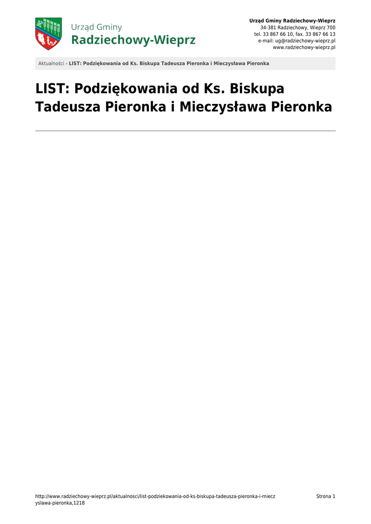 LIST: Podziękowania od Ks. Biskupa Tadeusza Pieronka i