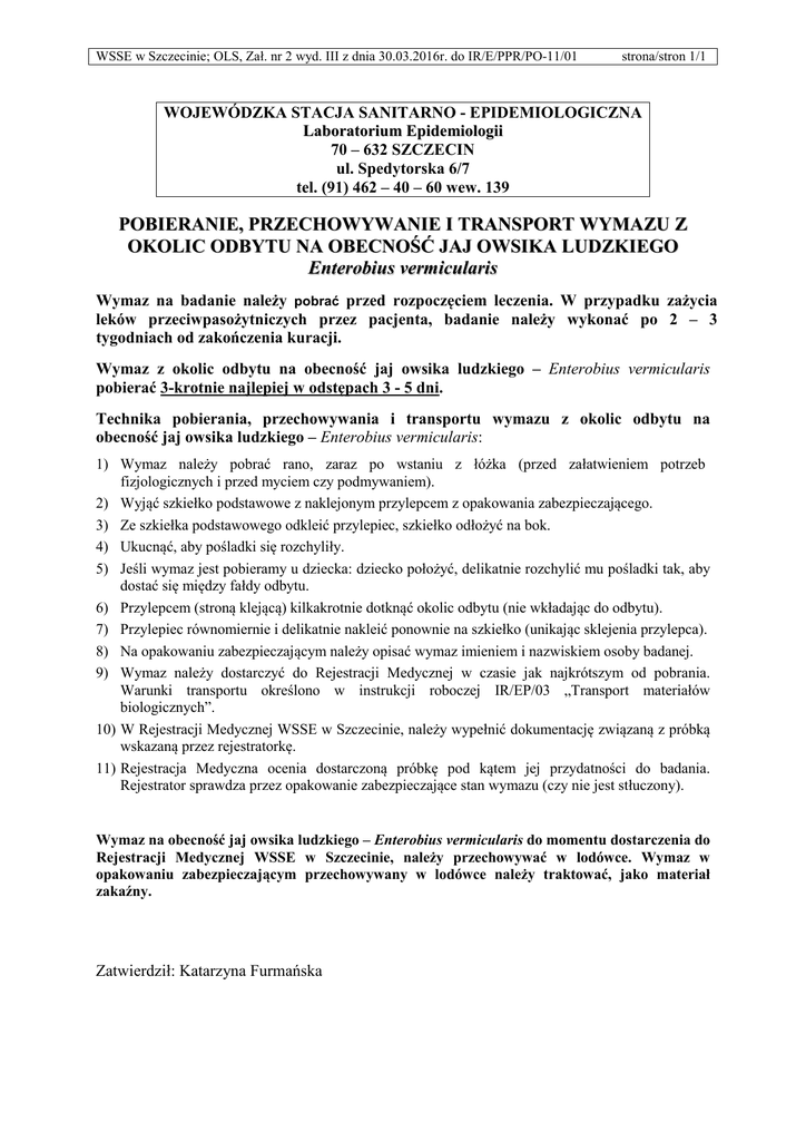 WSSE w Szczecinie; OLS, Zał. nr 2 wyd. III z dnia 30.03.2016r. do IR/E/PPR/PO-11/01 strona/stron 1/1 WOJEWÓDZKA STACJA SANITARNO - EPIDEMIOLOGICZNA Laboratorium Epidemiologii 70 – 632 SZCZECIN ul. Spedytorska 6/7 tel. (91) 462 – 40 – 60 wew. 139 POBIERANIE, PRZECHOWYWANIE I TRANSPORT WYMAZU Z OKOLIC ODBYTU NA OBECNOŚĆ JAJ OWSIKA LUDZKIEGO Enterobius vermicularis Wymaz na badanie należy pobrać przed rozpoczęciem leczenia. W przypadku zażycia leków przeciwpasożytniczych przez pacjenta, badanie należy wykonać po 2 – 3 tygodniach od zakończenia kuracji. Wymaz z okolic odbytu na obecność jaj owsika ludzkiego – Enterobius vermicularis pobierać 3-krotnie najlepiej w odstępach 3 - 5 dni. Technika pobierania, przechowywania i transportu wymazu z okolic odbytu na obecność jaj owsika ludzkiego – Enterobius vermicularis: 1) Wymaz należy pobrać rano, zaraz po wstaniu z łóżka (przed załatwieniem potrzeb fizjologicznych i przed myciem czy podmywaniem). 2) Wyjąć szkiełko podstawowe z naklejonym przylepcem z opakowania zabezpieczającego. 3) Ze szkiełka podstawowego odkleić przylepiec, szkiełko odłożyć na bok. 4) Ukucnąć, aby pośladki się rozchyliły. 5) Jeśli wymaz jest pobieramy u dziecka: dziecko położyć, delikatnie rozchylić mu pośladki tak, aby dostać się między fałdy odbytu. 6) Przylepcem (stroną klejącą) kilkakrotnie dotknąć okolic odbytu (nie wkładając do odbytu). 7) Przylepiec równomiernie i delikatnie nakleić ponownie na szkiełko (unikając sklejenia przylepca). 8) Na opakowaniu zabezpieczającym należy opisać wymaz imieniem i nazwiskiem osoby badanej. 9) Wymaz należy dostarczyć do Rejestracji Medycznej w czasie jak najkrótszym od pobrania. Warunki transportu określono w instrukcji roboczej IR/EP/03 „Transport materiałów biologicznych”. 10) W Rejestracji Medycznej WSSE w Szczecinie, należy wypełnić dokumentację związaną z próbką wskazaną przez rejestratorkę. 11) Rejestracja Medyczna ocenia dostarczoną próbkę pod kątem jej przydatności do badania. Rejestrator sprawdza przez opakowanie zabezpieczające stan wymazu (czy nie jest stłuczony). Wymaz na obecność jaj owsika ludzkiego – Enterobius vermicularis do momentu dostarczenia do Rejestracji Medycznej WSSE w Szczecinie, należy przechowywać w lodówce. Wymaz w opakowaniu zabezpieczającym przechowywany w lodówce należy traktować, jako materiał zakaźny. Zatwierdził: Katarzyna Furmańska