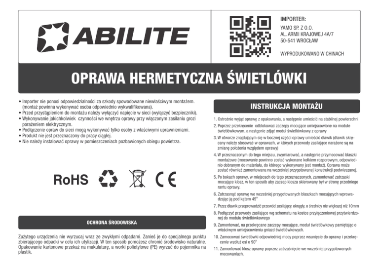 IMPORTER: YAMO SP. Z O.O. AL. ARMII KRAJOWEJ 4A/7 50-541 WROCŁAW WYPRODUKOWANO W CHINACH OPRAWA HERMETYCZNA ŚWIETLÓWKI • Importer nie ponosi odpowiedzialności za szkody spowodowane niewłaściwym montażem. (montaż powinna wykonywać osoba odpowiednio wykwalifikowana). • Przed przystąpieniem do montażu należy wyłączyć napięcie w sieci (wyłączyć bezpieczniki). • Wykonywanie jakichkolwiek czynności we wnętrzu oprawy przy włączonym zasilaniu grozi porażeniem elektrycznym. • Podłączenie opraw do sieci mogą wykonywać tylko osoby z właściwymi uprawnieniami. • Produkt nie jest przeznaczony do pracy ciągłej. • Nie należy instalować oprawy w pomieszczeniach pozbawionych obiegu powietrza. INSTRUKCJA MONTAŻU 1. Ostrożnie wyjąć oprawę z opakowania, a następnie umieścić na stabilnej powierzchni 2. Poprzez przekręcenie odblokować zaczepy mocujące umiejscowione na module świetlówkowym, a następnie zdjąć moduł świetlówkowy z oprawy 3. W otworze znajdującym się w bocznej części oprawy umieścić dławik (dławik skręcany należy stosować w oprawach, w których przewody zasilające narażone są na zmianę położenia względem oprawy) 4. W przeznaczonym do tego miejscu, zwymiarować, a następnie przymocować blaszki montażowe (mocowanie powinno zostać wykonane kołkiem rozporowym, odpowiednio dobranym do materiału, do którego wykonywany jest montaż). Oprawa może zostać również zamontowana na wcześniej przygotowanej konstrukcji podwieszanej. 5. Po bokach oprawy, w miejscach do tego przeznaczonych, zamontować zatrzaski mocujące klosz, w ten sposób aby zaczep klosza skierowany był w stronę przedniego rantu oprawy. 6. Zatrzasnąć oprawę we wcześniej przygotowanych blaszkach mocujących wprowadzając ją pod kątem 45o 7. Przez dławik przeprowadzić przewód zasilający, okrągły, o średnicy nie większej niż 10mm OCHRONA ŚRODOWISKA Zużytego urządzenia nie wyrzucaj wraz ze zwykłymi odpadami. Zanieś je do specjalnego punktu zbierającego odpadki w celu ich utylizacji. W ten sposób pomożesz chronić środowisko naturalne. Opakowanie kartonowe przekaż na makulaturę, a worki polietylowe (PE) wyrzuć do pojemnika na plastik. 8. Podłączyć przewody zasilające wg schematu na kostce przyłączeniowej przytwierdzonej do modułu świetlówkowego 9. Zamontować, na przekręcane zaczepy mocujące, moduł świetlówkowy pamiętając o właściwym umiejscowieniu gniazd świetlówkowych. 10. Zamocować świetlówki odpowiedniej mocy poprzez wsunięcie do oprawy i przekręcenie wzdłuż osi o 90o 11. Zamontować klosz oprawy poprzez zatrzaśnięcie we wcześniej przygotowanych mocowaniach.