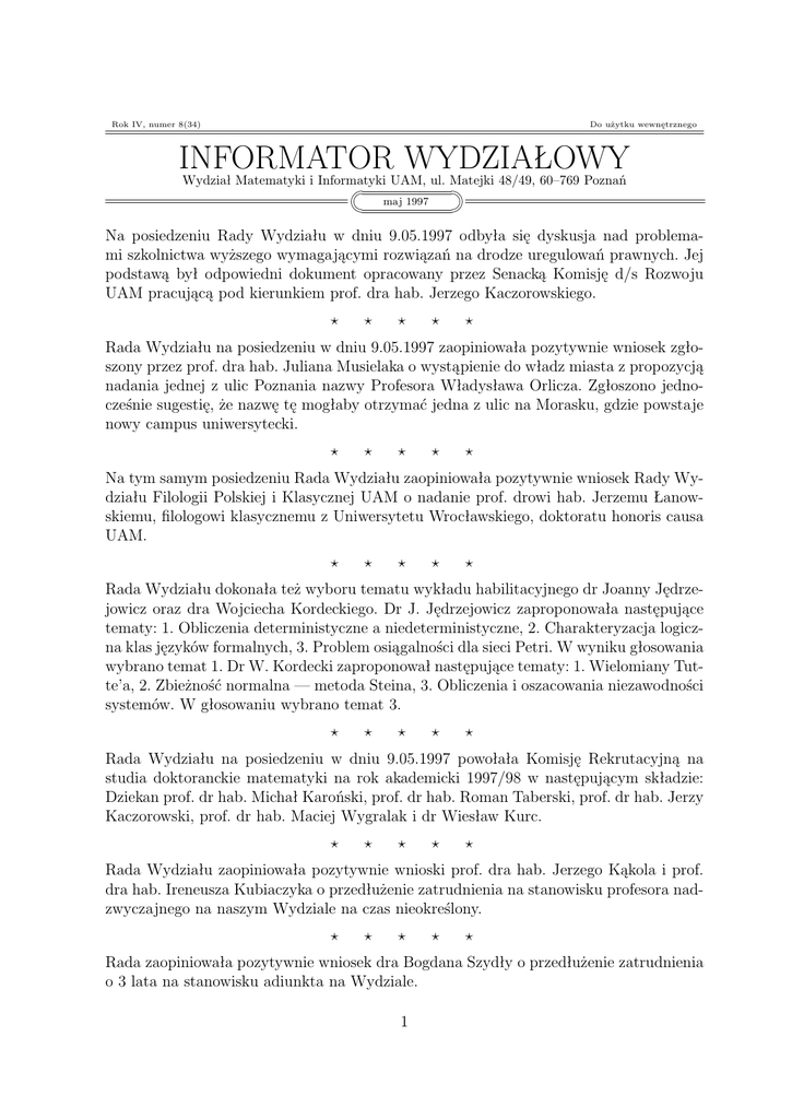 Rok IV, numer 8(34) Do użytku wewnętrznego INFORMATOR WYDZIAŁOWY Wydział Matematyki i Informatyki UAM, ul. Matejki 48/49, 60–769 Poznań maj 1997 Na posiedzeniu Rady Wydziału w dniu 9.05.1997 odbyła się dyskusja nad problemami szkolnictwa wyższego wymagającymi rozwiązań na drodze uregulowań prawnych. Jej podstawą był odpowiedni dokument opracowany przez Senacką Komisję d/s Rozwoju UAM pracującą pod kierunkiem prof. dra hab. Jerzego Kaczorowskiego. ? ? ? ? ? Rada Wydziału na posiedzeniu w dniu 9.05.1997 zaopiniowała pozytywnie wniosek zgłoszony przez prof. dra hab. Juliana Musielaka o wystąpienie do władz miasta z propozycją nadania jednej z ulic Poznania nazwy Profesora Władysława Orlicza. Zgłoszono jednocześnie sugestię, że nazwę tę mogłaby otrzymać jedna z ulic na Morasku, gdzie powstaje nowy campus uniwersytecki. ? ? ? ? ? Na tym samym posiedzeniu Rada Wydziału zaopiniowała pozytywnie wniosek Rady Wydziału Filologii Polskiej i Klasycznej UAM o nadanie prof. drowi hab. Jerzemu Łanowskiemu, filologowi klasycznemu z Uniwersytetu Wrocławskiego, doktoratu honoris causa UAM. ? ? ? ? ? Rada Wydziału dokonała też wyboru tematu wykładu habilitacyjnego dr Joanny Jędrzejowicz oraz dra Wojciecha Kordeckiego. Dr J. Jędrzejowicz zaproponowała następujące tematy: 1. Obliczenia deterministyczne a niedeterministyczne, 2. Charakteryzacja logiczna klas języków formalnych, 3. Problem osiągalności dla sieci Petri. W wyniku głosowania wybrano temat 1. Dr W. Kordecki zaproponował następujące tematy: 1. Wielomiany Tutte’a, 2. Zbieżność normalna — metoda Steina, 3. Obliczenia i oszacowania niezawodności systemów. W głosowaniu wybrano temat 3. ? ? ? ? ? Rada Wydziału na posiedzeniu w dniu 9.05.1997 powołała Komisję Rekrutacyjną na studia doktoranckie matematyki na rok akademicki 1997/98 w następującym składzie: Dziekan prof. dr hab. Michał Karoński, prof. dr hab. Roman Taberski, prof. dr hab. Jerzy Kaczorowski, prof. dr hab. Maciej Wygralak i dr Wiesław Kurc. ? ? ? ? ? Rada Wydziału zaopiniowała pozytywnie wnioski prof. dra hab. Jerzego Kąkola i prof. dra hab. Ireneusza Kubiaczyka o przedłużenie zatrudnienia na stanowisku profesora nadzwyczajnego na naszym Wydziale na czas nieokreślony. ? ? ? ? ? Rada zaopiniowała pozytywnie wniosek dra Bogdana Szydły o przedłużenie zatrudnienia o 3 lata na stanowisku adiunkta na Wydziale. 1 ? ? ? ? ? Rada zaopiniowała również pozytywnie wniosek dra Yoichi Uetake o przedłużenie zatrudnienia na stanowisku adiunkta na 3 lata (cały etat) oraz wniosek dra Krzysztofa Bucholca o przedłużenie zatrudnienia na takim samym stanowisku (1/2 etatu) na 1 rok. ? ? ? ? ? Rada Wydziału zaopiniowała pozytywnie wniosek prof. dra hab. Dobiesława Bobrowskiego i wniosek prof. dra hab. Romana Taberskiego o zatrudnienie w roku akademickim 1997/98 na naszym Wydziale na stanowiskach profesora zwyczajnego (w pełnym wymiarze — do 31.12.1997 i w niepełnym wymiarze — od 1.01.1998). ? ? ? ? ? Rada Wydziału zaopiniowała pozytywnie wnioski prof. dr hab. Wandy Nowak, prof. dra hab. Włodzimierza Stasia, dr Anny Boruckiej-Cieślewicz i dr Mirosławy Mikosz o zatrudnienie na naszym Wydziale w niepełnym wymiarze czasu pracy w roku akademickim 1997/98. ? ? ? ? ? Rada zaopiniowała pozytywnie wnioski prof. dra hab. Tadeusza Batoga i prof. dr hab. Juliana Musielaka o obniżenie pensum dydaktycznego do 120 godzin. ? ? ? ? ? Rada Wydziału zaopiniowała pozytywnie także wniosek dra Macieja Kandulskiego z Zakładu Teorii Obliczeń o przyznanie stypendium habilitacyjnego. Z historii . . . 50 lat temu, 2.03.1947 roku urodził się w Leningradzie Jurij Władymirowicz Matijasewicz. Matematyczne uznanie przyniosło mu rozwiązanie w roku 1970 dziesiątego problemu Hilberta brzmiącego następująco: „Niech dane będzie równanie diofantyczne o pewnej liczbie niewiadomych i o współczynnikach całkowitych. Znaleźć metodę, za pomocą której w skończonej liczbie kroków można rozstrzygnąć, czy ma ono rozwiązanie w liczbach całkowitych, czy nie ma.” Matijasewicz pokazał, że każda relacja rekurencyjnie przeliczalna na zbiorze liczb naturalnych jest diofantyczna, tzn. dla każdej relacji rekurencyjnie przeliczalnej R ⊆ Nn istnieje wielomian p(x1 , . . . , xn , y1 , . . . , yk ) o współczynnikach całkowitych taki, że R(x1 , . . . , xn ) ≡ ∃y1 . . . ∃yk [p(x1 , . . . , xn , y1 , . . . , yk ) = 0]. Matijasewicz udowodnił swoje twierdzenie wykorzystując pewne wcześniejsze wyniki M. Davisa, H. Putnama i J. Robinson. Twierdzenie Matijasewicza wraz z faktem, że istnieją relacje rekurencyjnie przeliczalne, które nie są rekurencyjne, prowadzi w konsekwencji do wniosku, że dziesiąty problem Hilberta ma rozwiązanie negatywne. R.M. 2 Centralna Komisja do Spraw Tytułu Naukowego i Stopni Naukowych zatwierdziła stopień doktora habilitowanego nauk matematycznych w zakresie matematyki nadany przez naszą Radę Wydziału drowi Tomaszowi Kubiakowi. ? ? ? ? ? Centralna Komisja rozpatrzyła też pozytywnie odwołanie dra Andrzeja Cegielskiego (z Politechniki Zielonogórskiej) i zatwierdziła stopień doktora habilitowanego nauk matematycznych w zakresie matematyki nadany mu przez naszą Radę Wydziału. ? ? ? ? ? Prodziekan doc. dr hab. Magdalena Jaroszewska brała udział w 7th Annual Conference of the European Association of Deans of Science. Konferencja odbyła się na Uniwersytecie Wrocławskim w dniach 30.04–4.05.1997. Tematem konferencji było finansowanie nauki, zarządzanie w nauce, w szczególności na wydziałach matematyczno-przyrodniczych w uniwersytetach oraz rola kobiet w nauce i zarządzaniu wydziałami uczelnianymi. ? ? ? ? ? 13.02.1997 zmarł w Moskwie Mark Aleksandrowicz Krasnosielski (ur. 27.04.1920), autor m.in. monografii Convex Functions and Orlicz Spaces (oryginał rosyjski: 1958, tłumaczenie angielskie: 1961). ? ? ? ? ? Na Wydziale Matematyki i Informatyki działa Koło Nau