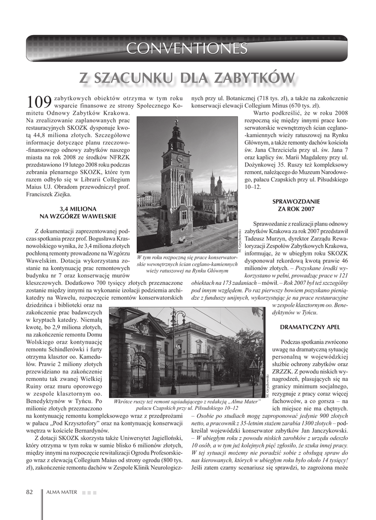 Z SZACUNKU DLA ZABYTKÓW 109 zabytkowych obiektów otrzyma w tym roku wsparcie finansowe ze strony Społecznego Komitetu Odnowy Zabytków Krakowa. Na zrealizowanie zaplanowanych prac restauracyjnych SKOZK dysponuje kwotą 44,8 miliona złotych. Szczegółowe informacje dotyczące planu rzeczowo-finansowego odnowy zabytków naszego miasta na rok 2008 ze środków NFRZK przedstawiono 19 lutego 2008 roku podczas zebrania plenarnego SKOZK, które tym razem odbyło się w Librarii Collegium Maius UJ. Obradom przewodniczył prof. Franciszek Ziejka. nych przy ul. Botanicznej (718 tys. zł), a także na zakończenie konserwacji elewacji Collegium Minus (670 tys. zł). Warto podkreślić, że w roku 2008 rozpoczną się między innymi prace konserwatorskie wewnętrznych ścian ceglano-kamiennych wieży ratuszowej na Rynku Głównym, a także remonty dachów kościoła św. Jana Chrzciciela przy ul. św. Jana 7 oraz kaplicy św. Marii Magdaleny przy ul. Dożynkowej 35. Ruszy też kompleksowy remont, należącego do Muzeum Narodowego, pałacu Czapskich przy ul. Piłsudskiego 10–12. SPRAWOZDANIE ZA ROK 2007 3,4 MILIONA NA WZGÓRZE WAWELSKIE M. Grychowski M. Grychowski Sprawozdanie z realizacji planu odnowy Z dokumentacji zaprezentowanej podzabytków Krakowa za rok 2007 przedstawił czas spotkania przez prof. Bogusława KrasTadeusz Murzyn, dyrektor Zarządu Rewanowolskiego wynika, że 3,4 miliona złotych loryzacji Zespołów Zabytkowych Krakowa, pochłoną remonty prowadzone na Wzgórzu informując, że w ubiegłym roku SKOZK W tym roku rozpoczną się prace konserwatorWawelskim. Dotacja wykorzystana zodysponował rekordową kwotą prawie 46 skie wewnętrznych ścian ceglano-kamiennych stanie na kontynuację prac remontowych milionów złotych. – Pozyskane środki wywieży ratuszowej na Rynku Głównym budynku nr 7 oraz konserwację murów korzystano w pełni, prowadząc prace w 121 kleszczowych. Dodatkowo 700 tysięcy złotych przeznaczone obiektach na 173 zadaniach – mówił. – Rok 2007 był też szczególny zostanie między innymi na wykonanie izolacji podziemia archi- pod innym względem. Po raz pierwszy bowiem pozyskano pieniąkatedry na Wawelu, rozpoczęcie remontów konserwatorskich dze z funduszy unijnych, wykorzystując je na prace restauracyjne dziedzińca i biblioteki oraz na w zespole klasztornym oo. Benedyktynów w Tyńcu. zakończenie prac badawczych w kryptach katedry. Niemałą DRAMATYCZNY APEL kwotę, bo 2,9 miliona złotych, na zakończenie remontu Domu Podczas spotkania zwrócono Wolskiego oraz kontynuację uwagę na dramatyczną sytuację remontu Schindlerówki i furty personalną w wojewódzkiej otrzyma klasztor oo. Kamedusłużbie ochrony zabytków oraz łów. Prawie 2 miliony złotych ZRZZK. Z powodu niskich wyprzewidziano na zakończenie nagrodzeń, plasujących się na remontu tak zwanej Wielkiej granicy minimum socjalnego, Ruiny oraz muru oporowego rezygnuje z pracy coraz więcej w zespole klasztornym oo. fachowców, a co gorsza – na Benedyktynów w Tyńcu. Po Wkrótce ruszy też remont sąsiadującego z redakcją „Alma Mater” pałacu Czapskich przy ul. Piłsudskiego 10–12 ich miejsce nie ma chętnych. milionie złotych przeznaczono na kontynuację remontu kompleksowego wraz z przedprożami – Osobie po studiach mogę zaproponować jedynie 900 złotych w pałacu „Pod Krzysztofory” oraz na kontynuację konserwacji netto, a pracownik z 35-letnim stażem zarabia 1300 złotych – podwnętrza w kościele Bernardynów. kreślał wojewódzki konserwator zabytków Jan Janczykowski. Z dotacji SKOZK skorzysta także Uniwersytet Jagielloński, – W ubiegłym roku z powodu niskich zarobków z urzędu odeszło który otrzyma w tym roku w sumie blisko 6 milionów złotych, 10 osób, a w tym już kolejnych pięć zgłosiło, że szuka innej pracy. między innymi na rozpoczęcie rewitalizacji Ogrodu Profesorskie- W tej sytuacji możemy nie poradzić sobie z obsługą spraw do go wraz z elewacją Collegium Maius od strony ogrodu (800 tys. nas kierowanych, których w ubiegłym roku było około 14 tysięcy! zł), zakończenie remontu dachów w Zespole Klinik Neurologicz- Jeśli zatem czarny scenariusz się sprawdzi, to zagrożona może 82 ALMA MATER być realizacja tegorocznych planów renowacyjnych. Członkowie SKOZK jednomyślnie orzekli, że do tego dopuścić nie można. Z uwagi więc na skalę problemu postanowili wystosować apel do wojewody małopolskiego oraz ministrów kultury i spraw wewnętrznych o pilne i pozytywne rozpatrzenie tej sprawy. PROJEKT „MOJA OJCZYZNA” Przewodniczący SKOZK prof. Franciszek Ziejka poinformował także o nowej i ważnej inicjatywie Komitetu, jaką jest projekt „Moja ojczyzna”, realizowany pod patronatem Prezydenta RP, we współpracy z Kurią Metropolitalną, Urzędem Marszałkowskim Województwa Małopolskiego, Zamkiem Królewskim na Wawelu oraz Komitetem Kopca Kościuszki. – Projekt przewiduje, że począwszy od kwietnia bieżącego roku, co tydzień będzie przyjeżdżać do Krakowa 50 uczniów z najuboższych rejonów naszego kraju, nie płacąc za to ani złotówki – podkreślał prof. Franciszek Ziejka. – Przewidujemy, że dzięki temu przedsięwzięciu do końca roku około 1400 uczniów z II klas gimnazjalnych z województw zachodniopomorskiego i warmińsko-mazurskiego po raz pierwszy zobaczy Kraków. Grupy młodzieży będą przebywać w naszym mieście cztery dni, podczas których odwiedzą Wawel oraz najpiękniejsze zakątki Krakowa, w tym kwartał uniwersytecki, a ponadto kopalnię soli w Wieliczce, Wadowice i Kalwarię Zebrzydowską. – Chodzi o to, by poprzez kontakt z zabytkami Krakowa i miejscami związanymi z życiem Jana Pawła II przybliżyć młodym ludziom naszą historię i kulturę narodową – akcentował profesor. – By nauczyć ich szacunku dla polskiej tradycji i dziedzictwa narodowego. Rita Pagacz-Moczarska CENTRUM BADAŃ HOLOKAUSTU NA UJ U A. Wojnar niwersytet jest od tego, żeby bada