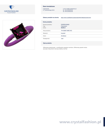 Powered by TCPDF (www.tcpdf.org) Dane kontaktowe Łódź 90-349 ul. Tymienieckiego 22/24 Zobacz produkt na stronie: e-mail: [email protected] tel. +48 42 648 05 60 fax +48 42 648 05 80 https://www.crystalfashion.pl/pl/produkt/44/2169/pierscionek.html Karta produktu Nazwa produktu: Typ: Cena: PIERŚCIONEK Pierścionki 95.00 zł Kod produktu: TH-53067.AME.VIO Materiał: kryształ Kolor: Amethyst Dostępność: Jest Opis produktu Silikonowy pierścionek, z możliwością regulacji rozmiaru. Silikonowy pasek można przyciąć nożyczkami tworząc idealny rozmiar.