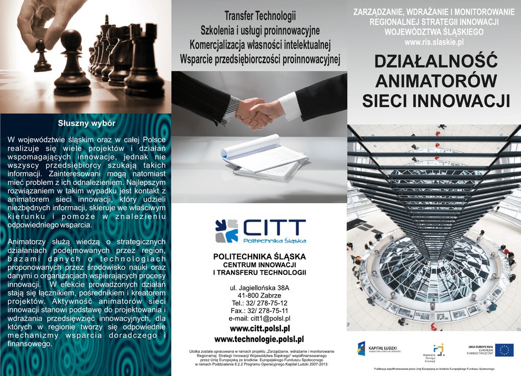 Transfer Technologii Szkolenia i usługi proinnowacyjne Komercjalizacja własności intelektualnej Wsparcie przedsiębiorczości proinnowacyjnej Słuszny wybór W województwie śląskim oraz w całej Polsce realizuje się wiele projektów i działań wspomagających innowacje, jednak nie wszyscy przedsiębiorcy szukają takich informacji. Zainteresowani mogą natomiast mieć problem z ich odnalezieniem. Najlepszym rozwiązaniem w takim wypadku jest kontakt z animatorem sieci innowacji, który udzieli niezbędnych informacji, skieruje we właściwym kierunku i pomoże w znalezieniu odpowiedniego wsparcia. Animatorzy służą wiedzą o strategicznych działaniach podejmowanych przez region, bazami danych o technologiach proponowanych przez środowisko nauki oraz danymi o organizacjach wspierających procesy innowacji. W efekcie prowadzonych działań stają się łącznikiem, pośrednikiem i kreatorem projektów. Aktywność animatorów sieci innowacji stanowi podstawę do projektowania i wdrażania przedsięwzięć innowacyjnych, dla których w regionie tworzy się odpowiednie mechanizmy wsparcia doradczego i finansowego. www.ris.slaskie.pl Sławomir OLKO tel. 669 001 709, [email protected] Subregion północny woj. śląskiego Obszar merytoryczny: Organizacja klastrów technologicznych Obszary technologiczne: technologie dla energetyki i górnictwa, technologie informacyjne i telekomunikacyjne, produkcja i przetwarzanie materiałów Cele działalności: - rozwój innowacji - budowa sieci współpracy - transfer technologii - pobudzanie kreatywności - rozwój przedsiębiorczości Środowisko pracy: - przedsiębiorstwa - samorządy - jednostki naukowe - uczelnie wyższe - instytucje otoczenia biznesu Zakres działań / oferowanej pomocy - identyfikacja potrzeb w zakresie nowoczesnych, innowacyjnych technologii dla przedsiębiorstw poprzez przeprowadzenie diagnozy potrzeb technologicznych Obszary technologiczne: technologie dla energetyki i górnictwa, technologie informacyjne i telekomunikacyjne, produkcja i przetwarzanie materiałów, przemysł maszynowy, samochodowy, lotniczy i górniczy Mirosław MATUSEK tel. 669 001 712 [email protected] Subregion centralny województwa śląskiego Obszar merytoryczny: Rozwój nowych produktów, uruchomienie nowej produkcji Obszary technologiczne: technologie informacyjne i telekomunikacyjne, produkcja i przetwarzanie materiałów, ochrona środowiska Piotr KORDEL tel. 669 003 493, [email protected] Subregion centralny/południowy województwa śląskiego Obszar merytoryczny: organizacja i zarządzanie sieciami międzyorganizacyjnymi Obszary technologiczne: technologie medyczne, technologie dla ochrony środowiska, przemysł maszynowy, samochodowy, lotniczy i górniczy - pozyskiwanie partnerów do współpracy z sektorów nauki i biznesu w zakresie innowacyjnych rozwiązań technologicznych i wymiany wiedzy - prezentacja informacji o możliwościach badawczych, opracowaniach know-how jednostek badawczych użytecznych w sferze biznesowej - promocja oferty jednostek badawczorozwojowych wśród przedsiębiorców - inicjowanie współpracy pomiędzy przedsiębiorcami