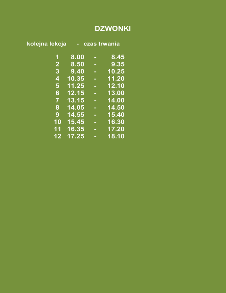 DZWONKI kolejna lekcja 1 2 3 4 5 6 7 8 9 10 11 12 - czas trwania 8.00 8.50 9.40 10.35 11.25 12.15 13.15 14.05 14.55 15.45 16.35 17.25 - 8.45 9.35 10.25 11.20 12.10 13.00 14.00 14.50 15.40 16.30 17.20 18.10