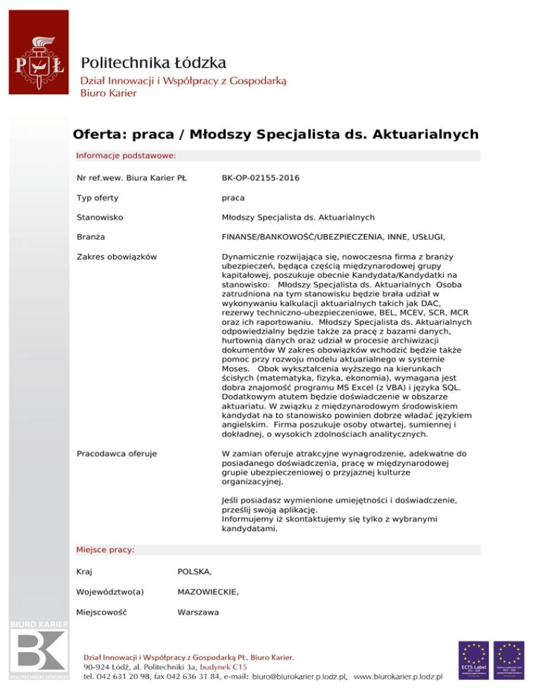 Oferta: praca / Młodszy Specjalista ds. Aktuarialnych Informacje podstawowe: Nr ref.wew. Biura Karier PŁ BK-OP-02155-2016 Typ oferty praca Stanowisko Młodszy Specjalista ds. Aktuarialnych Branża FINANSE/BANKOWOŚĆ/UBEZPIECZENIA, INNE, USŁUGI, Zakres obowiązków Dynamicznie rozwijająca się, nowoczesna firma z branży ubezpieczeń, będąca częścią międzynarodowej grupy kapitałowej, poszukuje obecnie Kandydata/Kandydatki na stanowisko: Młodszy Specjalista ds. Aktuarialnych Osoba zatrudniona na tym stanowisku będzie brała udział w wykonywaniu kalkulacji aktuarialnych takich jak DAC, rezerwy techniczno-ubezpieczeniowe, BEL, MCEV, SCR, MCR oraz ich raportowaniu. Młodszy Specjalista ds. Aktuarialnych odpowiedzialny będzie także za pracę z bazami danych, hurtownią danych oraz udział w procesie archiwizacji dokumentów W zakres obowiązków wchodzić będzie także pomoc przy rozwoju modelu aktuarialnego w systemie Moses. Obok wykształcenia wyższego na kierunkach ścisłych (matematyka, fizyka, ekonomia), wymagana jest dobra znajomość programu MS Excel (z VBA) i języka SQL. Dodatkowym atutem będzie doświadczenie w obszarze aktuariatu. W związku z międzynarodowym środowiskiem kandydat na to stanowisko powinien dobrze władać językiem angielskim. Firma poszukuje osoby otwartej, sumiennej i dokładnej, o wysokich zdolnościach analitycznych. Pracodawca oferuje W zamian oferuje atrakcyjne wynagrodzenie, adekwatne do posiadanego doświadczenia, pracę w międzynarodowej grupie ubezpieczeniowej o przyjaznej kulturze organizacyjnej. Jeśli posiadasz wymienione umiejętności i doświadczenie, prześlij swoją aplikację. Informujemy iż skontaktujemy się tylko z wybranymi kandydatami. Miejsce pracy: Kraj POLSKA, Województwo(a) MAZOWIECKIE, Miejscowość Warszawa Wymaganie odnośnie kandydata: Wymagana znajomość języków język - Angielski Preferowane kierunki - MATEMATYKA, znajomość Dobra Dane kontaktowe: Nazwa firmy/Pracodawcy Kraj Województwo Miasto Osoba kontaktowa Email HAYS Poland Sp. z o.o. POLSKA MAZOWIECKIE Warszawa Barbara Sapiołko [email protected] Sposób aplikacji: Aplikacje prosimy przesyłać na podany adres mailowy - [email protected] Data umieszczenia: Oferta ważna od 23-09-2016 do 30-09-2017 Politechnika Łódzka, jest wpisana pod numerem 2414 do rejestru podmiotów prowadzących agencje zatrudnienia.