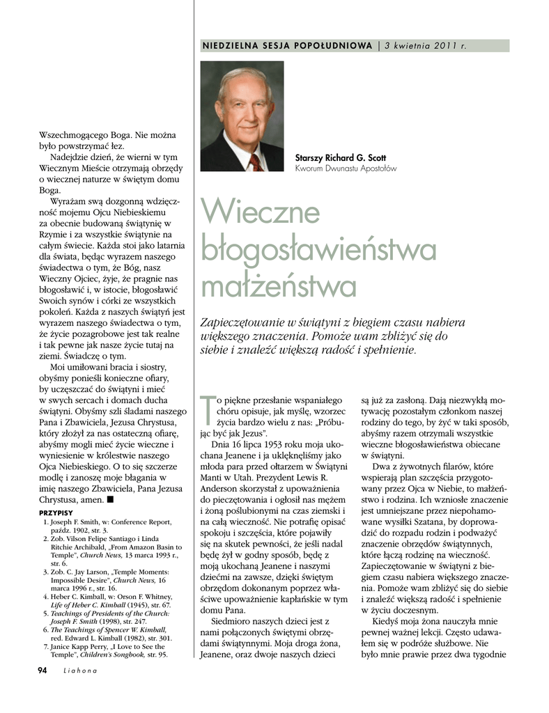 N I E D Z I E L N A S E S J A P O P O Ł U D N I O WA | 3 kw ie tnia 2 0 1 1 r. Wszechmogącego Boga. Nie można było powstrzymać łez. Nadejdzie dzień, że wierni w tym Wiecznym Mieście otrzymają obrzędy o wiecznej naturze w świętym domu Boga. Wyrażam swą dozgonną wdzięcz ność mojemu Ojcu Niebieskiemu za obecnie budowaną świątynię w Rzymie i za wszystkie świątynie na całym świecie. Każda stoi jako latarnia dla świata, będąc wyrazem naszego świadectwa o tym, że Bóg, nasz Wieczny Ojciec, żyje, że pragnie nas błogosławić i, w istocie, błogosławić Swoich synów i córki ze wszystkich pokoleń. Każda z naszych świątyń jest wyrazem naszego świadectwa o tym, że życie pozagrobowe jest tak realne i tak pewne jak nasze życie tutaj na ziemi. Świadczę o tym. Moi umiłowani bracia i siostry, obyśmy ponieśli konieczne ofiary, by uczęszczać do świątyni i mieć w swych sercach i domach ducha świątyni. Obyśmy szli śladami naszego Pana i Zbawiciela, Jezusa Chrystusa, który złożył za nas ostateczną ofiarę, abyśmy mogli mieć życie wieczne i wyniesienie w królestwie naszego Ojca Niebieskiego. O to się szczerze modlę i zanoszę moje błagania w imię naszego Zbawiciela, Pana Jezusa Chrystusa, amen. ◼ PRZYPISY 1. Joseph F. Smith, w: Conference Report, paźdz. 1902, str. 3. 2. Zob. Vilson Felipe Santiago i Linda Ritchie Archibald, „From Amazon Basin to Temple”, Church News, 13 marca 1993 r., str. 6. 3. Zob. C. Jay Larson, „Temple Moments: Impossible Desire”, Church News, 16 marca 1996 r., str. 16. 4. Heber C. Kimball, w: Orson F. Whitney, Life of Heber C. Kimball (1945), str. 67. 5. Teachings of Presidents of the Church: Joseph F. Smith (1998), str. 247. 6. The Teachings of Spencer W. Kimball, red. Edward L. Kimball (1982), str. 301. 7. Janice Kapp Perry, „I Love to See the Temple”, Children’s Songbook, str. 95. 94 Liahona Starszy Richard G. Scott Kworum Dwunastu Apostołów Wieczne błogosławieństwa małżeństwa Zapieczętowanie w świątyni z biegiem czasu nabiera większego znaczenia. Pomoże wam zbliżyć się do siebie i znaleźć większą radość i spełnienie. T o piękne przesłanie wspaniałego chóru opisuje, jak myślę, wzorzec życia bardzo wielu z nas: „Próbu jąc być jak Jezus”. Dnia 16 lipca 1953 roku moja uko chana Jeanene i ja uklęknęliśmy jako młoda para przed ołtarzem w Świątyni Manti w Utah. Prezydent Lewis R. Anderson skorzystał z upoważnienia do pieczętowania i ogłosił nas mężem i żoną poślubionymi na czas ziemski i na całą wieczność. Nie potrafię opisać spokoju i szczęścia, które pojawiły się na skutek pewności, że jeśli nadal będę żył w godny sposób, będę z moją ukochaną Jeanene i naszymi dziećmi na zawsze, dzięki świętym obrzędom dokonanym poprzez wła ściwe upoważnienie kapłańskie w tym domu Pana. Siedmioro naszych dzieci jest z nami połączonych świętymi obrzę dami świątynnymi. Moja droga żona, Jeanene, oraz dwoje naszych dzieci są już za zasłoną. Dają niezwykłą mo tywację pozostałym członkom naszej rodziny do tego, by żyć w taki sposób, abyśmy razem otrzymali wszystkie wieczne błogosławieństwa obiecane w świątyni. Dwa z żywotnych filarów, które wspierają plan szczęścia przygoto wany przez Ojca w Niebie, to małżeń stwo i rodzina. Ich wzniosłe znaczenie jest umniejszane przez niepohamo wane wysiłki Szatana, by doprowa dzić do rozpadu rodzin i podważyć znaczenie obrzędów świątynnych, które łączą rodzinę na wieczność. Zapieczętowanie w świątyni z bie giem czasu nabiera większego znacze nia. Pomoże wam zbliżyć się do siebie i znaleźć większą radość i spełnienie w życiu doczesnym. Kiedyś moja żona nauczyła mnie pewnej ważnej lekcji. Często udawa łem się w podróże służbowe. Nie było mnie prawie przez dwa tygodnie i wróciłem do domu w sobotni po ranek. Miałem cztery godziny przed udaniem się na kolejne spotkanie. Zauważyłem, że popsuła się nasza mała pralka, a moja żona ręcznie pie rze ubrania. Zacząłem ją naprawiać. Przechodząca Jeanene zapytała: „Rich, co ty robisz?” Powiedziałem: „Naprawiam pralkę, żebyś nie musiała prać ręcznie”. Odpowiedziała: „Przestań. Idź po bawić się z dziećmi”. Ja na to: „W każdej chwili mogę bawić się z dziećmi. Chcę ci pomóc”. Wtedy odpowiedziała: „Richard, proszę, idź pobawić się z dziećmi”. Kiedy powiedziała do mnie tak ka tegorycznym tonem, posłuchałem jej. Spędziłem z dziećmi cudowne chwile. Ganialiśmy się i turlaliśmy po jesiennych liściach. Później posze dłem na spotkanie. Prawdopodobnie zapomniałbym o tym doświadczeniu, gdyby nie lekcja, której chciała mnie nauczyć. Obudziłem się następnego ranka, około czwartej, kiedy poczułem dwie małe rączki zarzucone mi na szyję, pocałunek w policzek i słowa wyszep tane mi wprost do ucha, których nigdy nie zapomnę: „Kocham cię, tatusiu. Jesteś moim najlepszym przyjacielem”. Jeśli macie tego rodzaju doświad czenia w swojej rodzinie, doświad czacie jednej z niebiańskich radości tego życia. Jeśli jesteś młodym mężczyzną w odpowiednim wieku i nie masz żony, nie trać czasu na próżne działania. Idź dalej przez życie i skup się na zawarciu małżeństwa. Nie dryfuj przez ten okres swojego życia. Młodzi mężczyźni, służcie godnie na misji. Następnie niech najważniejszą rzeczą będzie znalezienie godnej wiecznej towarzyszki. Kiedy okaże się, że za czynacie interesować się jakąś młodą kobietą, pokażcie jej, że jesteście wyjątkową osobą, tak aby chciała poznać was lepiej. Zabierajcie ją w miejsca, które są godne zobaczenia. Wykażcie się pewną pomysłowością. Jeśli chcecie mieć wspaniałą żonę, musicie sprawić, że będzie widziała w was wspaniałego człowieka i poten cjalnego męża. Jeśli już kogoś odnalazłeś, możecie stworzyć niezwykle ws