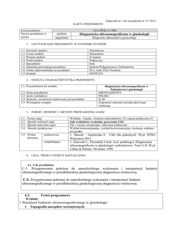Załącznik nr 1 do zarządzenia nr 12 /2012 KARTA PRZEDMIOTU Kod przedmiotu Nazwa przedmiotu w języku 12.6-3POŁ-5.3.PKI polskim angielskim Diagnostyka ultrasonograficzna w ginekologii Diagnostic ultrasound in gynecology 1. USYTUOWANIE PRZEDMIOTU W SYSTEMIE STUDIÓW Położnictwo Stacjonarne II stopień Praktyczny brak Instytut Pielęgniarstwa i Położnictwa Dr n. med. Piotr Niziurski 604393224 1.1. Kierunek studiów 1.2. Forma studiów 1.3. Poziom studiów 1.4. Profil studiów 1.5. Specjalność 1.6. Jednostka prowadząca przedmiot 1.8. Osoba odpowiedzialna za przedmiot 1.9. Kontakt 2. OGÓLNA CHARAKTERYSTYKA PRZEDMIOTU 2.1. Przynależność do modułu 2.2. Status przedmiotu 2.3. Język wykładowy 2.4. Semestry, na których realizowany jest przedmiot 2.5. Wymagania wstępne Diagnostyka ultrasonograficzna w Położnictwie i ginekologii OBOWIĄZKOWY POLSKI II, III Znajomość anatomii narządu płciowego żeńskiego 3. FORMY, SPOSOBY I METODY PROWADZENIA ZAJĘĆ Formy zajęć Sposób realizacji zajęć Sposób zaliczenia zajęć Metody dydaktyczne 3.1. 3.2. 3.3. 3.4. 3.5. Wykaz literatury podstawowa uzupełniająca Wykłady -15godz., Godziny niekontaktowe 10, zajęcia praktyczne 25 Sale wykładowe wydziału, pracownia USG Zal. z oceną/ zal pisemne, zaliczenie praktyczne Wykład konwencjonalny, wykład konwersatoryjny, dyskusja, studium przypadku 1. Dmoch – Gajzlerska E. USG dla położnych. Wyd. PZWL Warszawa 2014 1. Zalewski J., Floriański J (red. wyd. polskiego). Diagnostyka ultrasonograficzna w ginekologii i położnictwie. Tom I i II. Wyd. Urban & Partner. Wrocław 1999 4. CELE, TREŚCI I EFEKTY KSZTAŁCENIA 4.1. Cele przedmiotu C-1. Przygotowanie położnej do samodzielnego wykonania i interpretacji badania ultrasonograficznego w przedlekarskiej ginekologicznej diagnostyce różnicowej. C-2. Przygotowanie położnej do samodzielnego wykonania i interpretacji badania ultrasonograficznego w przedlekarskiej ginekologicznej diagnostyce różnicowej. Treści programowe 4.2. Wykłady 1 Standard badania ultrasonograficznego w ginekologii. • Topografia narządów wewnętrznych • Obecność guza, jego wielkość kształt, ruchomość • Ocena macicy, pochwy, jajników 2 Zasady przygotowania kobiety do badania ultrasonograficznego narządu rodnego. • Przygotowanie fizyczne i psychiczne do badania 3.Anatomia ultrasonograficzna narządu rodnego w różnych okresach życia kobiety. • Ocena macicy, pochwy, jajników i ich zmian związanych z cyklem miesiączkowym. • Diagnostyka USG w powiązaniu z chorobami współistniejącymi 4.Diagnostyka ultrasonograficzna a klinika ginekologii. USG endowaginalne. 5.Diagnostyka ultrasonograficzna ciąży ektopowej. • Ciąża poza jamą macicy (szyjkowaj jajowodowa, jajnikowa) 6.Ultrasonografia mięśnia macicy: • mięśniaki macicy, wielkość, lokalizacja, • echostruktura mięśnia macicy, • grubość i echostruktura endometrium. 7.Zastosowanie ultrasonografii w niepłodności. • Badanie HSG pod kontrolą USG z wykorzystaniem płynów inersyjnych bez konieczności badań radiologicznych 8.Zasady opisu badania ultrasonograficznego w ginekologii. • Standardy Polskiego Towarzystwa Ginekologicznego i Polskiego Towarzystwa Ultrasonograficznego Zajęcia praktyczne . Rozpoznanie położenia i wielkości mięśnia macicy. 2. Ocena echostruktury mięśnia macicy. 3. Rozpoznanie obecności mięśniaków oraz ocena ich lokalizacji i wielkość. 4. Ocena echostruktury i grubości endometrium. 5. Ocena lokalizacji, wielkość oraz echostruktury jajników. 6. Rozpoznanie obecności guzów jajników (torbieli, guzów litych, o niejednorodnej echogeniczności). 7. Ocena przepływu krwi w naczyniach guza jajnika. 8. Ocena wielkości pęcherzyków owulacyjnych. 9. Ocena oraz scharakteryzowanie zmiany w błonie śluzowej trzonu macicy. 10. Dokonanie rozpoznania/podejrzenia ciąży ektopowej. 11. Rozpoznanie ogniska endometriozy w powłokach. Kod 4.3 Efekty kształcenia Student, który zaliczył przedmiot w zakresie WIEDZY: W01 W02 W03 U01 zna zastosowanie badania ultrasonograficznego w diagnostyce niepłodności; zna zasady wykonywania badania USG narządu rodnego kobiety, w tym ciężarnej i rodzącej; charakteryzuje techniki wykonywania i zasady asystowania przy zabiegach wykonywanych pod kontrolą ultrasonografii; w zakresie UMIEJĘTNOŚCI: wykonuje badanie ultrasonograficzne narządów jamy brzusznej i Stopień nasycenia efektu przedmioto wego1 [+] [++] [+++] Odniesienie do efektów kształcenia dla kierunku według standardu +++ POŁ2P_W49 B.W7. ++ POŁ2P_W47 B.W5. ++ POŁ2P_W48 B.W6. ++ POŁ2P_U36 B.U4. miednicy mniejszej, wstępnie ocenia i opisuje wynik badania; w zakresie KOMPETENCJI SPOŁECZNYCH: przejawia odpowiedzialność za udział w podejmowaniu decyzji zawodowych; K01 ++ POŁ2P_K1 B.K1. Kryteria oceny osiągniętych efektów kształcenia 1. na ocenę 3,5 Opanowanie treści programowych na poziomie podstawowym, odpowiedzi usystematyzowane, wymaga pomocy nauczyciela. na ocenę 4 Opanowanie treści programowych na poziomie podstawowym, odpowiedzi usystematyzowane, samodzielne. Rozwiązywanie problemów w sytuacjach typowych. na ocenę 4,5 Zakres prezentowanej wiedzy wykracza poza poziom podstawowy w oparciu o podane piśmiennictwo uzupełniające. Rozwiązywanie problemów w sytuacjach nowych i złożonych. na ocenę 5 Zakres prezentowanej wiedzy wykracza poza poziom podstawowy w oparciu o samodzielnie zdobyte naukowe źródła informacji. Kryteria oceny osiągniętych efektów kształcenia (zajęcia praktyczne) na ocenę 3 na ocenę 3,5 na ocenę 4 na ocenę 4,5 na ocenę 5 Dostateczna analiza wybranego przypadku. Częściowy opis czynności, Wymaga ciągłego instruktażu nauczyciela przy wykonywaniu USG. Brak trafnych wniosków. Dostateczna analiza wybranego przypadku. Niewyczerpujący opis czynności, Przy wykonywaniu badania wymaga wsparcia nauczyciela. Poprawnie sformułowane wnioski. Poprawna analiza zadanego tematu, wyczerpują