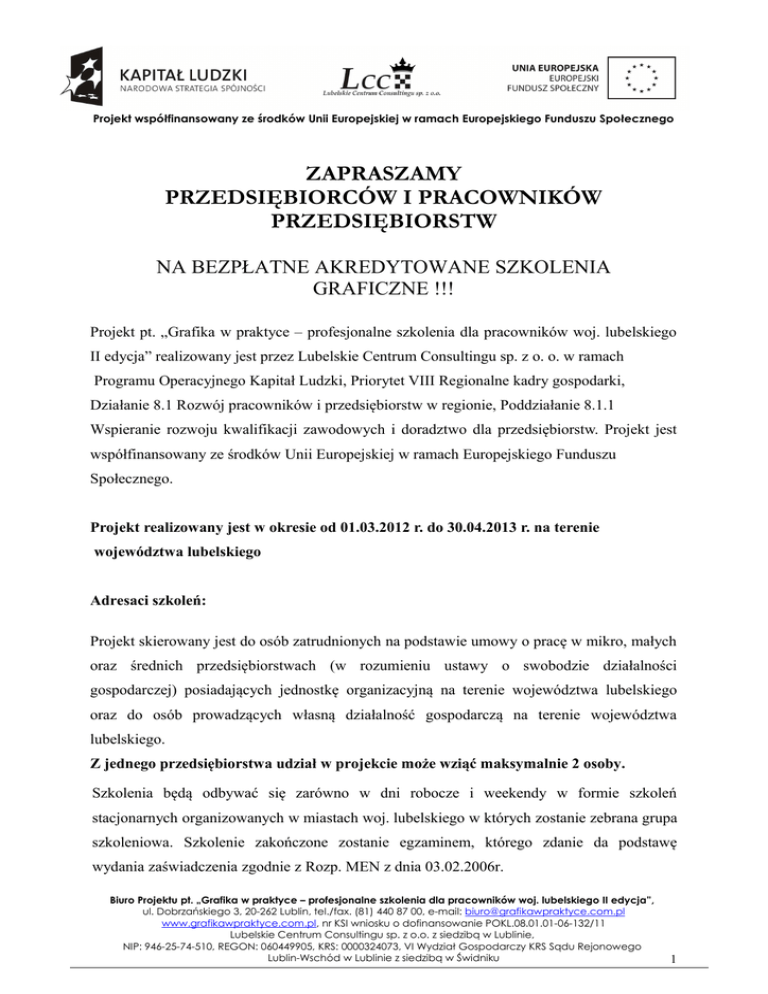 Projekt współfinansowany ze środków Unii Europejskiej w ramach Europejskiego Funduszu Społecznego ZAPRASZAMY PRZEDSIĘBIORCÓW I PRACOWNIKÓW PRZEDSIĘBIORSTW NA BEZPŁATNE AKREDYTOWANE SZKOLENIA GRAFICZNE !!! Projekt pt. „Grafika w praktyce – profesjonalne szkolenia dla pracowników woj. lubelskiego II edycja” realizowany jest przez Lubelskie Centrum Consultingu sp. z o. o. w ramach Programu Operacyjnego Kapitał Ludzki, Priorytet VIII Regionalne kadry gospodarki, Działanie 8.1 Rozwój pracowników i przedsiębiorstw w regionie, Poddziałanie 8.1.1 Wspieranie rozwoju kwalifikacji zawodowych i doradztwo dla przedsiębiorstw. Projekt jest współfinansowany ze środków Unii Europejskiej w ramach Europejskiego Funduszu Społecznego. Projekt realizowany jest w okresie od 01.03.2012 r. do 30.04.2013 r. na terenie województwa lubelskiego Adresaci szkoleń: Projekt skierowany jest do osób zatrudnionych na podstawie umowy o pracę w mikro, małych oraz średnich przedsiębiorstwach (w rozumieniu ustawy o swobodzie działalności gospodarczej) posiadających jednostkę organizacyjną na terenie województwa lubelskiego oraz do osób prowadzących własną działalność gospodarczą na terenie województwa lubelskiego. Z jednego przedsiębiorstwa udział w projekcie może wziąć maksymalnie 2 osoby. Szkolenia będą odbywać się zarówno w dni robocze i weekendy w formie szkoleń stacjonarnych organizowanych w miastach woj. lubelskiego w których zostanie zebrana grupa szkoleniowa. Szkolenie zakończone zostanie egzaminem, którego zdanie da podstawę wydania zaświadczenia zgodnie z Rozp. MEN z dnia 03.02.2006r. Biuro Projektu pt. „Grafika w praktyce – profesjonalne szkolenia dla pracowników woj. lubelskiego II edycja”, ul. Dobrzańskiego 3, 20-262 Lublin, tel./fax. (81) 440 87 00, e-mail: [email protected] www.grafikawpraktyce.com.pl, nr KSI wniosku o dofinansowanie POKL.08.01.01-06-132/11 Lubelskie Centrum Consultingu sp. z o.o. z siedzibą w Lublinie, NIP: 946-25-74-510, REGON: 060449905, KRS: 0000324073, VI Wydział Gospodarczy KRS Sądu Rejonowego Lublin-Wschód w Lublinie z siedzibą w Świdniku 1 Projekt współfinansowany ze środków Unii Europejskiej w ramach Europejskiego Funduszu Społecznego Usługi w ramach projektu: 1. SZKOLENIA MODUŁOWE W ramach zadania przewidziano 3 moduły szkoleniowe. W ramach projektu uczestnicy będą mieli do wyboru udział w jednym z trzech modułów tematycznych szkoleń. Każde szkolenie stanowi zamkniętą całość. Każdy uczestnik projektu skorzysta z 80 godzin szkoleniowych. Moduł I. Szkolenie z zakresu technik graficznych Adobe Photoshop/CorelDRAW ( 80 godzin szkoleniowych) 7 edycji (7 grup * 8 osób) Moduł II. Szkolenie z zakresu technologii multimedialnych Adobe Flash ( 80 godzin szkoleniowych) 4 edycji (4 grupy * 8 osób) Moduł III. Szkolenie z zakresu technik DTP Adobe InDesign ( 80 godzin szkoleniowych)2 edycje (2 grupy * 8 osób) W ramach projektu zapewniamy: - bezpłatne materiały szkoleniowe - ciepły posiłek i poczęstunek - zaświadczenie zgodne z rozporządzeniem MEN z dnia 03.02.2006r. KONTAKT Biuro projektu pt.„Grafika w praktyce – profesjonalne szkolenia dla pracowników woj. lubelskiego II edycja” ul. Dobrzańskiego 3 20-262 Lublin tel. (81) 440 87 00 email: [email protected] strona: www.grafikawpraktyce.com.pl Biuro Projektu czynne: poniedziałek – piątek: od 8:00 do 16:00 Biuro Projektu pt. „Grafika w praktyce – profesjonalne szkolenia dla pracowników woj. lubelskiego II edycja”, ul. Dobrzańskiego 3, 20-262 Lublin, tel./fax. (81) 440 87 00, e-mail: [email protected] www.grafikawpraktyce.com.pl, nr KSI wniosku o dofinansowanie POKL.08.01.01-06-132/11 Lubelskie Centrum Consultingu sp. z o.o. z siedzibą w Lublinie, NIP: 946-25-74-510, REGON: 060449905, KRS: 0000324073, VI Wydział Gospodarczy KRS Sądu Rejonowego Lublin-Wschód w Lublinie z siedzibą w Świdniku 2