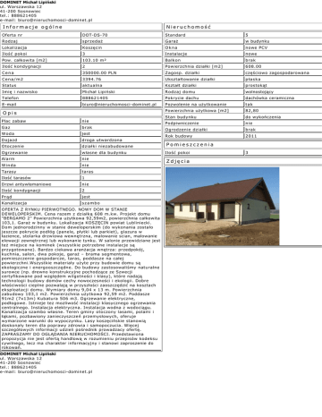 DOMINET Michał Lipiński ul. Warszawska 12 41-200 Sosnowiec tel.: 888621405 e-mail: [email protected] Informacje ogólne Nieruchomość Oferta nr DOT-DS-70 Standard 5 Rodzaj sprzedaż Garaż w budynku Lokalizacja Koszęcin Okna nowe PCV Ilość pokoi 3 Instalacje nowe Pow. całkowita [m2] 103.10 m² Balkon brak Ilość kondygnacji 2 Powierzchnia działki [m2] 608.00 Cena 350000.00 PLN Zagosp. działki częściowo zagospodarowana Cena/m2 3394.76 Ukształtowanie działki płaska Status aktualna Kształt działki prostokąt Imię i nazwisko Michał Lipiński Rodzaj domu wolnostojący Telefon 888621405 Pokrycie dachu dachówka ceramiczna E-mail [email protected] Pozwolenie na użytkowanie tak Powierzchnia użytkowa [m2] 82,80 Stan budynku do wykończenia Podpiwniczenie nie Ogrodzenie działki brak Rok budowy 2011 Opis Plac zabaw nie Gaz brak Woda jest Dojazd droga utwardzona Otoczenie działki niezabudowane Pomieszczenia Ogrzewanie własne dla budynku Ilość pokoi Alarm nie Winda nie Tarasy taras Ilość tarasów 1 Drzwi antywłamaniowe nie Ilość kondygnacji 2 Prąd jest Kanalizacja szambo OFERTA Z RYNKU PIERWOTNEGO. NOWY DOM W STANIE DEWELOPERSKIM. Cena razem z działką 608 m.kw. Projekt domu "BERGAMO 2" Powierzchnia użytkowa 92,59m2, powierzchnia całkowita 103,1. Garaż w budynku. Lokalizacja KOSZĘCIN powiat Lubliniecki. Dom jednorodzinny w stanie deweloperskim (do wykonania zostało jeszcze pokrycie podłóg (panele, płytki lub parkiet), glazura w łazience, stolarka drzwiowa wewnętrzna, malowanie scian, malowanie elewacji zewnętrznej lub wykonanie tynku. W salonie przewidziane jest też miejsce na kominek (wszystkie potrzebne instalacje są przygotowane). Bardzo ciekawa aranżacja wnętrza: przedpokój, kuchnia, salon, dwa pokoje, garaż – brama segmentowa, pomieszczenie gospodarcze, taras, poddasze na całej powierzchni.Wszystkie materiały użyte przy budowie domu są ekologiczne i energooszczędne. Do budowy zastosowaliśmy naturalne surowce (np. drewno konstrukcyjne pochodzące ze Szwecji certyfikowane pod względem wilgotności i klasy), które nadają technologii budowy domów cechy nowoczesności i ekologii. Dobre właściwości cieplne pozwalają w przyszłości zaoszczędzić na kosztach eksploatacji domu. Wymiary domu 9,04 x 13 m. Powierzchnia zabudowy 103,1 m2. Powierzchnia użytkowa 92,59 m2. Poddasze 91m2 (7x13m) Kubatura 506 m3. Ogrzewanie elektryczne, podłogowe. Istnieje tez mozliwość instalacji klasycznego ogrzewania centralnego. Instalacja elektryczna. Instalacja wodna z wodociągu. Kanalizacja szambo własne. Teren gminy otoczony lasami, polami i łąkami, pozbawiony zanieczyszczeń przemysłowych, oferuje wymarzone warunki do wypoczynku. Lasy koszęcińskie stanowią doskonały teren dla poprawy zdrowia i samopoczucia. Więcej szczegółowych informacji udzieli pośrednik prowadzacy ofertę. ZAPRASZAMY DO OGLĄDANIA NIERUCHOMOŚCI. Przedstawiona propozycja nie jest ofertą handlową w rozumieniu przepisów kodeksu cywilnego, lecz ma charakter informacyjny i stanowi zaproszenie do rokowań. DOMINET Michał Lipiński ul. Warszawska 12 41-200 Sosnowiec tel.: 888621405 e-mail: [email protected] Zdjęcia 3