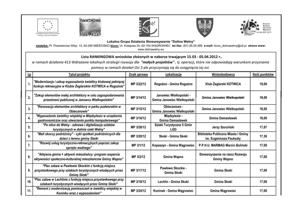 Lokalna Grupa Działania Stowarzyszenie "Dolina Wełny" siedziba: Pl. Powstańców Wlkp. 13, 62-290 MIEŚCISKO biuro: Ul. Kolejowa 24, 62-100 WĄGROWIEC tel./fax: (67) 26-25-489 e-mail: [email protected] strona www: www.dolinawelny.eu Lista RANKINGOWA wniosków złożonych w naborze trwającym 15.03 - 05.04.2012 r., w ramach działania 413 Wdrażanie lokalnych strategii rozwoju dla "małych projektów" , tj. operacji, które nie odpowiadają warunkom przyznania pomocy w ramach działań Osi 3 ale przyczyniają się do osiągnięcia tej osi. Lp Tytuł projektu Znak sprawy Lokalizacja Wnioskodawca Ilość punktów 1. "Modernizacja i zakup wyposaŜenia świetlicy klubowej pełniącej funkcje rekreacyjne w Klubie śeglarskim KOTWICA w Rogoźnie" MP 3/22/12 Rogoźno - Gmina Rogoźno Klub śeglarski KOTWICA 19,00 2. "Zakup elementów małej architektury w celu zagospodarowania zagospodarowania przestrzeni publicznej w Janowcu Wielkopolskim" MP 3/14/12 Janowiec Wielkopolski Gmina Janowiec Wielkopolski Gmina Janowiec Wielkopolski 18,00 Gmina Janowiec Wielkopolski 18,00 Gmina Damasławek 18,00 Jerzy Szociński 17,87 3. 4. 5. 6. 7. 8. "Renowacja elementów architektury w parku podworskim w Obiecanowie" "WyposaŜenie świetlicy wiejskiej w Międzylesiu w urządzenia gastronomiczne oraz utworzenie punktu komputerowego" "Po nitce do Wełny - odnowa i digitelizacja szlaków turystycznych w dolinie rzeki Wełny" "Mali skoccy podróŜnicy" - cykl spotkań podróŜniczych dla dzieci z terenu gminy Skoki "Rozwój usług turystyczno-rekreacyjnych poprzez zakup sprzętu wodnego" "Aktywna gmina = aktywni mieszkańcy: program wsparcia aktywności społeczno-kulturalnej mieszkańców Gminy Wapno" "Plac zabaw w Pawłowie Skockim z funkcją miejsca przystankowego przy szlakach turystycznych wiodących przez Gminę Skoki" "Plac zabaw w Lechlinie z funkcją miejsca przystankowego przy 10. szlakach turystycznych wiodących przez Gminę Skoki" "Remont z modernizacją pomieszczeń w świetlicy wiejskiej w 11. Koninku wraz z wyposaŜeniem" 9. MP 3/15/12 MP 3/16/12 MP 3/26/12 Obiecanowo Gmina Janowiec Wielkopolski Międzylesie Gmina Damasławek Szlaki Turystyczne 5 Gmin LGD MP 3/20/12 Skoki - Gmina Skoki Biblioteka Publiczna Miasta i Gminy im. Eugeniusza Paukszty 17,36 MP 3/1/12 Kopaszyn - Gmina Wągrowiec P.P.H.U. MARMAG Marcin Buliński 17,00 MP 3/2/12 Gmina Wapno Stowarzyszenie na rzecz Rozwoju Gminy Wapno 17,00 MP 3/17/12 Pawłowo Skockie Gmina Skoki Gmina Skoki 17,00 MP 3/18/12 Lechlin - Gmina Skoki Gmina Skoki 17,00 MP 3/24/12 Koninek - Gmina Wągrowiec Gmina Wągrowiec 17,00 "Remont wraz z modernizacją świetlicy wiejskiej w miejscowości Krosno" "Obchody Jubileuszu 25-lecia współpracy między partnerskimi 13. gminami Oirschot w Holandii i Damasławek" "Promocja Gminy Mieścisko kluczem do wzrostu potencjału 14. turystyczno-rekreacyjnego - prezentacja filmowa połączona z zakupem materiałów promocyjnych" 12. 15. 16. 17. 18. "Święto Plonów w miejscowości BliŜyce, gmina Skoki" "Zagospodarowanie terenu przylegającego do MiejskoGminnego Ośrodka Kultury w Janowcu Wielkopolskim" "Niektórzy lubią poezję" - cykl spotkań poetyckich w skockiej bibliotece "Wymiana pokrycia gzymsów przy Kościele Parafialnym" MP 3/25/12 Krosno - Gmina Wągrowiec Gmina Wągrowec 16,86 MP 3/10/12 Damasławek Gmina Damasławek Towarzystwo Współpracy Gminy Damasławek z Zagranicą 16,13 MP 3/11/12 Mieścisko - Gmina Mieścisko Gmina Mieścisko 16,00 MP 3/19/12 MP 3/13/12 MP 3/21/12 MP 3/23/12 Biblioteka Publiczna Miasta i Gminy im. Eugeniusza Paukszty Janowiec Wielkopolski Miejsko-Gminny Ośrodek Kultury w Gmina Janowiec Wielkopolski Janowcu Wielkopolskim Biblioteka Publiczna Miasta i Gminy Skoki - Gmina Skoki im. Eugeniusza Paukszty Parafia Rzymsko-Katolicka p.w. św. Grylewo - Gmina Wągrowiec Katarzyny Aleksandryjskiej w Grylewie Janowiec Wielkopolski Parafia Rzymskokatolicka p.w. św. Gmina Janowiec Wielkopolski Mikołaja BliŜyce - Gmina Skoki 16,00 14,92 14,78 14,47 24. "Odnowienie elewacji kaplicy p.w. św. Barbary w Janowcu Wielkopolskim" "Pobudzenie aktywności mieszkańców wsi Czerlin poprzez zagospodarowanie przestrzeni publicznej na boisko do siatkówki i piłki noŜnej" "Modernizacja świetlicy wiejskiej w Potulinie" "Adaptacja kompleksu rekreacyjnego we wsi Czeszewo poprzez utwardzenie części terenu" "Zakup wyposaŜenia zaplecza kuchennego w świetlicy wiejskiej w KrzyŜankach" "Modernizacja pomieszczeń świetlicy wiejskiej w Smogulcu" 25. "DoposaŜenie placu zabaw we wsi Czesławice" MP 3/4/12 Czesławice - Gmina Gołańcz Miasto i Gmina Gołańcz 11,78 26. "IV Międzynarodowy Przegląd Zespołów Ludowych" MP 3/9/12 Jabłkowo - Gmina Skoki Fundacja Pomoc Dzieciom Wiejskim 10,00 19. 20. 21. 22. 23. MP 3/12/12 14,00 MP 3/3/12 Czerlin - Gmina Gołańcz Miasto i Gmina Gołańcz 13,00 MP 3/8/12 Potulin - Gmina Gołańcz Gołaniecki Ośrodek Kultury 13,00 MP 3/5/12 Czeszewo - Gmina Gołańcz Miasto i Gmina Gołańcz 12,93 MP 3/6/12 KrzyŜanki - Gmina Gołańcz Gołaniecki Ośrodek Kultury 12,00 MP 3/7/12 Smogulec - Gmina Gołańcz Gołaniecki Ośrodek Kultury 12,00 Suma wnioskowanej wartości wsparcia : 474 120,02 zł Limit dostępnych środków: 450 846,00 zł