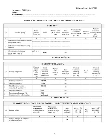 Załącznik nr 1 do SIWZ Nr sprawy: 70/IJ/2013 Nazwa Wykonawcy:………………………………………………………………………………………………… …….................................................................................................................................................... FORMULARZ OFERTOWY NA USŁUGI TELEKOMUNIKACYJNE: I OPŁATY: Lp. 1 1 2 3 Nazwa opłaty Cena jednost. netto (zł) Wartość netto (zł) za 1 m-c [3x4] Ilość Ilość miesięcy realizacji 2 3 4 5 6 Jednorazowy koszt uruchomienia ------------- --------------- ------------------ -------------wszystkich usług Jednorazowy koszt rozbudowy centrali ------------- --------------- ------------------ -------------- Abonament miesięczny za 1 m-c: 4 szt. ISDN PRA 30B+D Wartość Wartość netto w okresie w okresie Stawka realizacji brutto realizacji (zł) VAT (%) (zł) [5x6] [ 7+8 ] 7 8 9 48 WARTOŚĆ OGÓŁEM: II KOSZTY POŁĄCZEŃ: Cena za 1 min. połączenia netto (zł) 3 Ilość szacunkowa czasu połączeń (min/m-c) Wartość netto (zł/m-c) [3x4] Ilość miesięcy realizacji Lp. Rodzaj połączenia 1 1 2 Lokalne i strefowe: 2 Międzymiastowe: 7.000 3 Sieci komórkowe do wszystkich operatorów: 30.000 4 Międzynarodowe: 300 48 6 Pozostałe połączenia (do biura numerów, infolinie itp.) 300 połączeń 48 4 45.000 5 6 48 Wartość w okresie realizacji netto (zł) [5x6] VAT (%) Wartość w okresie realizacji brutto (zł) [ 7+8 ] 7 8 9 48 48 WARTOŚĆ OGÓŁEM: III KOSZTY REALIZACJI USŁUGI DOSTĘPU DO INTERNETU W 3 LOKALIZACJACH: Lp. 1 1 Rodzaj usługi 2 Usługa dostępu do Internetu w 3 lokalizacjach Abonament za 1 miesiąc za 3 lokalizacje netto (zł) 3 Abonament za 1 miesiąc za 3 lokalizacje brutto (zł) 4 Ilość miesięcy realizacji WARTOŚĆ NETTO [3x5] VAT (%) WARTOŚĆ BRUTTO [6+7] 5 6 7 8 48 1 IV KOSZTY DOSTAWY APARATÓW I BRAM BEZPIECZEŃSTWA: Lp. 1 1 2 Przedmiot zamówienia Ilość szt. WARTOŚĆ NETTO (zł) VAT (%) WARTOŚĆ BRUTTO (zł) [4+5] 3 4 5 6 2 Dostawa aparatów telefonicznych – cena płatna w równych 24 ratach miesięcznych 63 Dostawa zintegrowanych bram bezpieczeństwa – cena płatna w równych 24 ratach miesięcznych 3 WARTOŚĆ OGÓŁEM: ------- Wysokość miesięcznej raty brutto 7 PRODUCENT I MODEL ZAOFEROWANYCH APARATÓW I BRAM** 8 --------------------------------------------------- ** - szczegółowy opis można zawrzeć na odrębnym piśmie Wartość netto oferty (I + IV): ……………………………………………………………………… Słownie: …………………………………………………………………………………………….. Wartość brutto oferty (I + IV): ……………………………………………………………………… Słownie: …………………………………………………………………………………………….. Informacyjnie: Aparat systemowy podstawowy – cena za 1 szt. brutto ………………………….…… zł Aparat systemowy zaawansowany – cena za 1 szt. brutto ………………………..……zł Aparat bezprzewodowy analogowy z funkcją CLIP – cena za 1 szt. brutto ……………………..…. zł OŚWIADCZENIE WYKONAWCY 1. Wadium zostało wniesione w dniu ……………………. w formie ……………………………. 2. Oświadczamy, że zapoznaliśmy się ze Specyfikacją Istotnych Warunków Zamówienia i nie wnosimy do niej żadnych zastrzeżeń. Tym samym zobowiązujemy się do spełnienia wszystkich warunków zawartych w SIWZ. 3. Oświadczamy, że akceptujemy projekt umowy. Jednocześnie zobowiązujemy się w przypadku wyboru naszej oferty podpisać umowę bez zastrzeżeń, w terminie i miejscu wyznaczonym przez Zamawiającego. 4. Oświadczamy, że oferowana usługa wraz z wymaganym sprzętem jest zgodna z przedmiotem zamówienia szczegółowo opisanym w SIWZ. 5. Oświadczamy, że cena ofertowa zawiera wszystkie koszty związane z kompleksowym świadczeniem usługi objętych specyfikacją. 6. Oświadczamy, że zamówienie zrealizujemy siłami własnymi/polegając na zasobach (wskazać jakich) innych podmiotów na zasadach określonych w art. 26 ust. 2b ustawy pzp (niepotrzebne skreślić). …………………………… (podpis Wykonawcy) 2 7. Ze strony Wykonawcy osoba upoważniona do kontaktów w sprawie realizacji umowy: ................................................., tel.: ............................................................ 8. Serwis – kontakt tel. ………………………………… mail: ………………………….. Nazwa Banku oraz nr konta Wykonawcy: ............................................................................ ..................................................................................................................................................... …………………….………… podpis Wykonawcy 3 Załącznik nr 2 do SIWZ Nr sprawy: 70/IJ/2013 Opis przedmiotu zamówienia Przedmiotem zamówienia jest świadczenie usług telekomunikacyjnych i dostępu do internetu na potrzeby Szpitala Klinicznego Dzieciątka Jezus w Warszawie przy ul. Lindleya 4 z zachowaniem dotychczasowej numeracji, doposażenie istniejącej centrali telefonicznej, serwis, szkolenie i nadzór techniczny centrali telefonicznej przez cały okres trwania umowy. Zamawiający nie będzie ponosił kosztów związanych z zachowaniem obecnie posiadanej numeracji, jak również kosztów związanych z przeniesieniem numerów telefonicznych. Przeniesienie numerów nie spowoduje przerw w realizacji ciągłości ruchu telefonicznego w Szpitalu – z uwagi na specyficzny charakter działalności Zamawiającego wymagane jest zachowanie ciągłości połączeń/ ruchu telefonicznego. Zamawiający zastrzega: wszystkie instalowane urządzenia związane z realizacją przedmiotu zamówienia muszą być nowe, bezpieczne w użytkowaniu i nie mogą zakłócać pracy prawidłowego działania urządzeń i apar