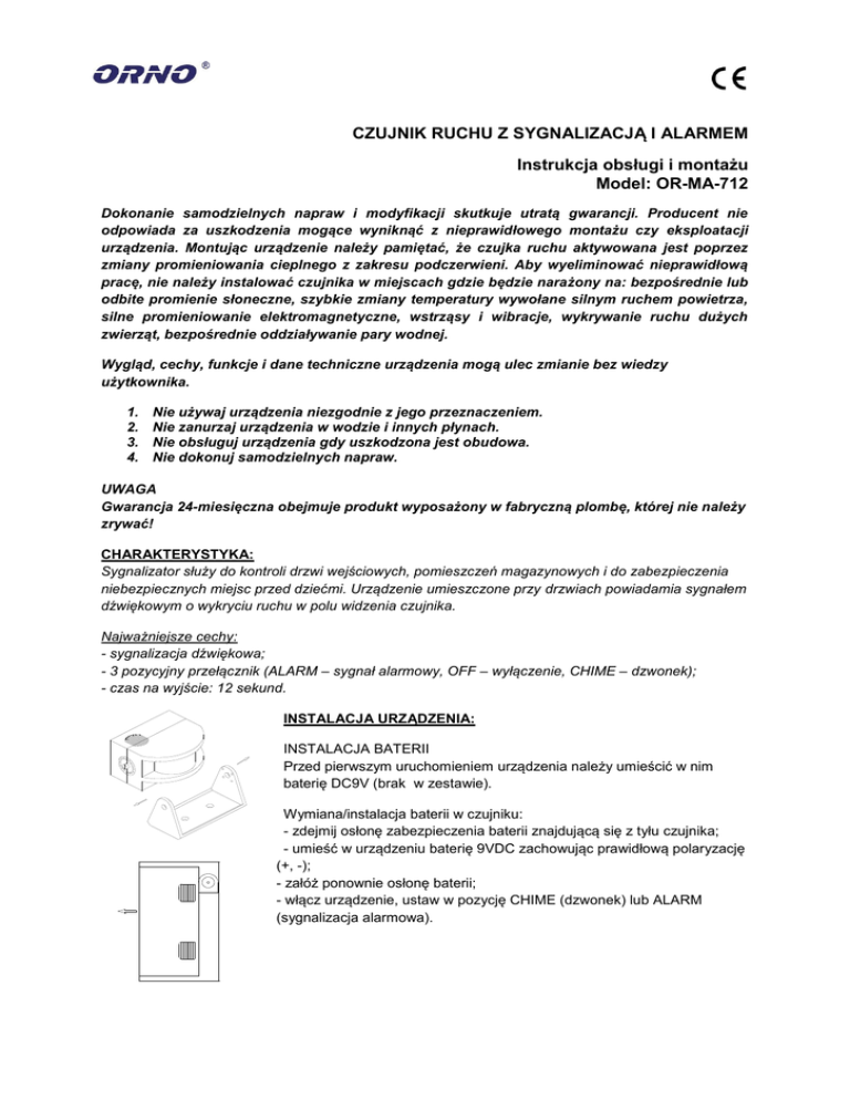 CZUJNIK RUCHU Z SYGNALIZACJĄ I ALARMEM Instrukcja obsługi i montażu Model: OR-MA-712 Dokonanie samodzielnych napraw i modyfikacji skutkuje utratą gwarancji. Producent nie odpowiada za uszkodzenia mogące wyniknąć z nieprawidłowego montażu czy eksploatacji urządzenia. Montując urządzenie należy pamiętać, że czujka ruchu aktywowana jest poprzez zmiany promieniowania cieplnego z zakresu podczerwieni. Aby wyeliminować nieprawidłową pracę, nie należy instalować czujnika w miejscach gdzie będzie narażony na: bezpośrednie lub odbite promienie słoneczne, szybkie zmiany temperatury wywołane silnym ruchem powietrza, silne promieniowanie elektromagnetyczne, wstrząsy i wibracje, wykrywanie ruchu dużych zwierząt, bezpośrednie oddziaływanie pary wodnej. Wygląd, cechy, funkcje i dane techniczne urządzenia mogą ulec zmianie bez wiedzy użytkownika. 1. 2. 3. 4. Nie używaj urządzenia niezgodnie z jego przeznaczeniem. Nie zanurzaj urządzenia w wodzie i innych płynach. Nie obsługuj urządzenia gdy uszkodzona jest obudowa. Nie dokonuj samodzielnych napraw. UWAGA Gwarancja 24-miesięczna obejmuje produkt wyposażony w fabryczną plombę, której nie należy zrywać! CHARAKTERYSTYKA: Sygnalizator służy do kontroli drzwi wejściowych, pomieszczeń magazynowych i do zabezpieczenia niebezpiecznych miejsc przed dziećmi. Urządzenie umieszczone przy drzwiach powiadamia sygnałem dźwiękowym o wykryciu ruchu w polu widzenia czujnika. Najważniejsze cechy: - sygnalizacja dźwiękowa; - 3 pozycyjny przełącznik (ALARM – sygnał alarmowy, OFF – wyłączenie, CHIME – dzwonek); - czas na wyjście: 12 sekund. INSTALACJA URZĄDZENIA: INSTALACJA BATERII Przed pierwszym uruchomieniem urządzenia należy umieścić w nim baterię DC9V (brak w zestawie). Wymiana/instalacja baterii w czujniku: - zdejmij osłonę zabezpieczenia baterii znajdującą się z tyłu czujnika; - umieść w urządzeniu baterię 9VDC zachowując prawidłową polaryzację (+, -); - załóż ponownie osłonę baterii; - włącz urządzenie, ustaw w pozycję CHIME (dzwonek) lub ALARM (sygnalizacja alarmowa). UWAGA Zalecamy używanie baterii alkaicznych. W momencie zamontowania baterii alarm jest nieuzbrojony przez 20 sek. Istnieje możliwość podłączenia do urządzenia zasilacza sieciowego DC9V (brak w zestawie). CHIME OFF ALARM Funkcja ALARM: Przed opuszczeniem „chronionego pomieszczenia” przesuń przełącznik z pozycji OFF na pozycję ALARM. Czujnik przez 12 sekund pozostanie nieaktywny, jest to czas na opuszczenie pomieszczenia. Po wykryciu ruchu urządzenie prze 20 sek. wyda sygnał alarmowy. Po tym czasie przejdzie ponownie w stan czuwania. Funkcja (dzwonka) CHIME Przed opuszczeniem pomieszczenia przesuń przełącznik z pozycji OFF na pozycję CHIME. Po upływie 12 sekund i wykryciu ruchu urządzenie wyda dwukrotnie dźwięk ding-dong i wyłączy się automatycznie. WYŁĄCZENIE URZĄDZENIA: Przesuń przełącznik na pozycję OFF. Zgodnie z przepisami Ustawy z dnia 29 lipca 2005 r. o ZSEiE zabronione jest umieszczanie łącznie z innymi odpadami zużytego sprzętu oznakowanego symbolem przekreślonego kosza. Użytkownik, chcąc pozbyć się sprzętu elektronicznego i elektrycznego, jest zobowiązany do oddania go do punktu zbierania zużytego sprzętu. waga netto: 0,08 kg 10/2015 DANE TECHNICZNE - zasilanie: bateryjne 1x DC9V (brak w zestawie) lub z zasilacza sieciowego 9VDC (brak w zestawie) - zasięg czujnika: max. 8m - głośność alarmu: >50dB - kąt widzenia czujnika: 140° - czas alarmu: 20 sek. - czas na wyjście: 12 sek. - temperatura pracy: -20 ~40°C - prędkość wykrywanego ruchu: 0,6~1,5m/s PRODUCENT ORNO-LOGISTIC Sp. z o.o. ul. Katowicka 134, 43-190 Mikołów, te. 32 43 43 110