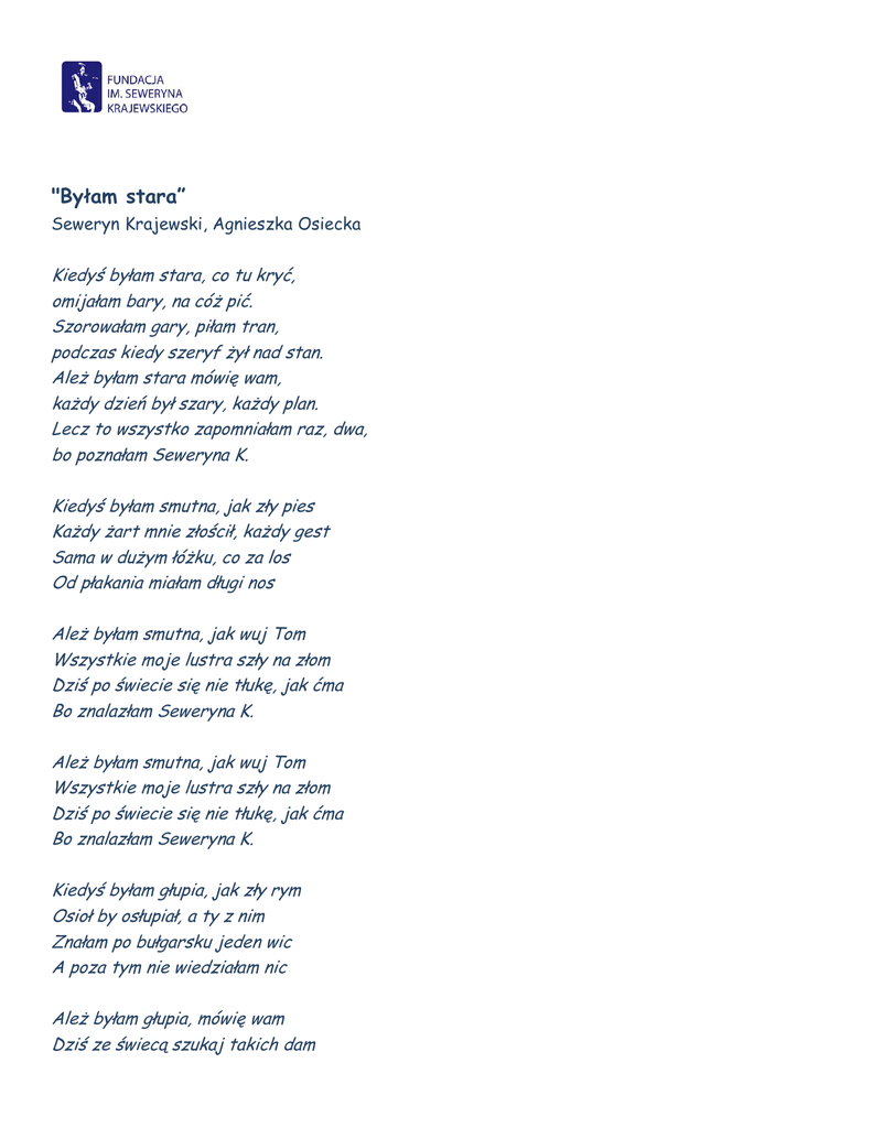 "Byłam stara” Seweryn Krajewski, Agnieszka Osiecka Kiedyś byłam stara, co tu kryć, omijałam bary, na cóż pić. Szorowałam gary, piłam tran, podczas kiedy szeryf żył nad stan. Ależ byłam stara mówię wam, każdy dzień był szary, każdy plan. Lecz to wszystko zapomniałam raz, dwa, bo poznałam Seweryna K. Kiedyś byłam smutna, jak zły pies Każdy żart mnie złościł, każdy gest Sama w dużym łóżku, co za los Od płakania miałam długi nos Ależ byłam smutna, jak wuj Tom Wszystkie moje lustra szły na złom Dziś po świecie się nie tłukę, jak ćma Bo znalazłam Seweryna K. Ależ byłam smutna, jak wuj Tom Wszystkie moje lustra szły na złom Dziś po świecie się nie tłukę, jak ćma Bo znalazłam Seweryna K. Kiedyś byłam głupia, jak zły rym Osioł by osłupiał, a ty z nim Znałam po bułgarsku jeden wic A poza tym nie wiedziałam nic Ależ byłam głupia, mówię wam Dziś ze świecą szukaj takich dam Lecz to wszystko przeminęło raz, dwa Bo mnie lubi, ten Seweryn K. Na dojrzałość szarą mamy czas Zanim przyjdzie, po cóż mówić pas W melancholię czarną wpadać wstyd Lepiej śnieżną chustą witać świt. Nie poganiaj losu, kiedy śpi Za młodością głosuj, w czasie gry A gdy z oczu ci popatrzy dal zła Spróbuj poznać Seweryna K.