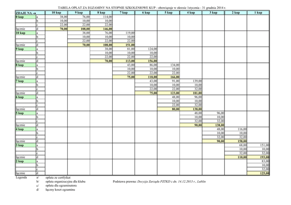 ZDAJE NA → a 0 kup b c łącznie d a 10 kup b c łącznie d a 9 kup b c łącznie d a 8 kup b c łącznie d a 7 kup b c łącznie d a 6 kup b c łącznie d a 5 kup b c łącznie d a 4 kup b c łącznie d a 3 kup b c łącznie d a 2 kup b c łącznie d Legenda a/ b/ c/ d/ TABELA OPŁAT ZA EGZAMINY NA STOPNIE SZKOLENIOWE KUP - obowiązuje w okresie 1stycznia - 31 grudnia 2014 r. 10 kup 9 kup 8 kup 7 kup 6 kup 5 kup 4 kup 3 kup 38,00 76,00 114,00 10,00 10,00 10,00 22,00 22,00 22,00 70,00 108,00 146,00 38,00 76,00 119,00 10,00 10,00 10,00 22,00 22,00 22,00 70,00 108,00 151,00 38,00 81,00 124,00 10,00 10,00 10,00 22,00 22,00 22,00 70,00 113,00 156,00 43,00 86,00 134,00 10,00 10,00 10,00 22,00 22,00 22,00 75,00 118,00 166,00 43,00 91,00 139,00 10,00 10,00 10,00 22,00 22,00 32,00 75,00 123,00 181,00 48,00 96,00 10,00 10,00 22,00 32,00 80,00 138,00 48,00 96,00 10,00 10,00 32,00 32,00 90,00 138,00 48,00 10,00 32,00 90,00 opłata ze certfyikat opłata organizacyjna dla klubu opłata dla egzaminatora łączny koszt egzaminu Podstawa prawna: Decyzja Zarządu PZTKD z dn. 14.12.2013 r., Lublin 2 kup 116,00 10,00 32,00 158,00 68,00 10,00 32,00 110,00 1 kup 151,00 10,00 32,00 193,00 83,00 10,00 32,00 125,00