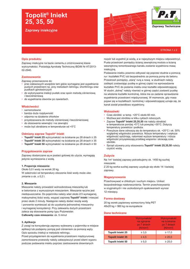 Topolit® Iniekt 25, 35, 50 Zaprawy iniekcyjne STRONA 1 z 2 Opis produktu Zaprawy iniekcyjne na bazie cementu,o zróżnicowanej klasie wytrzymałości. Posiadają Aprobatę Techniczną IBDiM Nr AT/201302-2940. Zastosowanie Zaprawy przeznaczone do: • prac zalewowych wszędzie tam gdzie wymagane jest wypełnienie pustych przestrzeni np. przy metodach reliningu, shortliningu oraz pustkach górotwórczych • do wykonywania iniekcji pustek oraz spoin metodą ciśnieniową i bezciśnieniową • do wypełniania otworów po nawiertach. Właściwości • • • • • • samorozlewne bardzo duża rozpływność odporna na działanie chlorków przystosowana do metody ciśnieniowej i bezciśnieniowej do stosowania wewnątrz i na zewnątrz może być obrabiana w temperaturze od +5°C Odmiany zapraw Topolit® Iniekt • Topolit® Iniekt 25 wytrzymałość na ściskanie po 28 dniach ≥ 25 • Topolit® Iniekt 35 wytrzymałość na ściskanie po 28 dniach ≥ 35 • Topolit® Iniekt 50 wytrzymałość na ściskanie po 28 dniach ≥ 50 Przygotowanie zapraw Zaprawy dostarczane są w postaci gotowej do użycia, wymagają jedynie wymieszania z wodą. 1.Proporcje mieszania: Około 5,0 l wody na worek 20 kg. W zależności od temperatury otoczenia ilość wody może ulec zmianie o ok. ± 0,2 l. 2. Mieszanie Mieszanie należy prowadzić wolnoobrotową mieszarką lub w betoniarce z wymuszonym mieszaniem. Mieszanie ręczne jest niedopuszczalne. Do pojemnika należy wlać około 2/3 wymaganej, maksymalnej ilości wody, wsypać zaprawę Topolit® Iniekt i mieszać przez około 2 minuty. Następnie należy dodać resztę wody i ponownie wymieszać aż do uzyskania jednorodnej mieszaniny i wymaganej konsystencji. Przy zalewaniu dużych przestrzeni zaleca się stosowanie pomp typu Putzmeister. Całkowity czas mieszania: ok. 5 minut 3.Aplikacja Z uwagi na konsystencję zaprawy wylewamy z pojemnika w miejsce aplikacji lub podajemy pompą pod ciśnieniem za pomocą węży. Opis sposobu iniekcji w metodzie reliningu. Przed przystąpieniem do wypełniania przestrzeni międzyrurowej zamontowane przewody należy zabezpieczyć przed siłami wyporu podczas podawania iniektu poprzez zastosowanie drewnianych rozpór lub wypełnić je wodą, a w najwyższym miejscu odpowietrzyć. Pusta przestrzeń pomiędzy ścianą zewnętrzną modułu a ścianą wewnętrzną remontowanego kanału zostanie wypełniona masą iniekcyjną. Podawanie iniektu powinno odbywać się poprzez studnie a pomocą rur i kształtek PVC lub bezpośrednio za pomocą pomp do betonu. Przestrzeń pomiędzy „starą” rurą a nową w studniach należy zaślepić zostawiając pustkę w górnej części na wprowadzenie kształtek PVC do podania iniektu oraz kształtki odpowietrzającej. W studni „dolnej” należy również w górnej części zostawić pustkę na włożenie kształtki kontrolnej, która ma za zadanie sprawdzenie wypełnienia przestrzeni międzyrurowej. W momencie, gdy masa pojawi się w kształtkach: kontrolnej i odpowietrzającej uznaje się, że kanał został prawidłowo wypełniony. Wskazówki • Czas obróbki: w temp. +20°C około 60 min. • Możliwa jest obróbka w kilku cyklach roboczych. • Zapraw Topolit® Iniekt 25,35,50 nie należy obrabiać w temperaturze poniżej +5°C lub powyżej +30°C. Dotyczy temperatury powietrza i podłoża. • Powyższe dane odnoszą się do temperatury ok. +20°C i ok. 50% względnej wilgotności powietrza. Niższe temperatury i większa wilgotność opóźniają, natomiast wyższe temperatury i niższa wilgotność przyspieszają przebieg wiązania i skracają czas obróbki. • Sprzęt używany przy stosowaniu Topolit® Iniekt 25,35,50 należy czyścić wodą. Zużycie Na 1m3 świeżej zaprawy potrzebujemy ok. 1450 kg suchej mieszanki. Z 20 kg worka suchej zaprawy uzyskuje się około 14 l świeżej zaprawy. Magazynowanie Przechowywać w chłodnym i suchym miejscu. Unikać bezpośredniego nasłonecznienia. Termin przechowywania w oryginalnych i nie uszkodzonych opakowaniach wynosi 12 miesięcy. Forma dostawy 20 kg worek papierowy wzmocniony folią PET 48x20 kg = 960 kg na europalecie Dane techniczne Wytrzymałość na zginanie po 7 dniach [N/mm2] Wytrzymałość na ściskanie po 7 dniach [N/mm2] Topolit Iniekt 25 ≥ 3,5 ≥ 17,0 Topolit Iniekt 35 ≥ 4,5 ≥ 20,0 Topolit Iniekt 50 ≥ 5,0 ≥ 25,0 Topolit® Iniekt 25, 35, 50 Zaprawy iniekcyjne STRONA 2 z 2 Wytrzymałość na zginanie po 28 dniach [N/mm2] Wytrzymałość na ściskanie po 28 dniach [N/mm2] Topolit Iniekt 25 ≥ 6,0 ≥ 27,0 Topolit Iniekt 35 ≥ 7,0 ≥ 35,0 Topolit Iniekt 50 ≥ 7,5 ≥ 50,0 Produkt zawiera cement. Należy używać środków ochrony indywidualnej w postaci rękawic i okularów ochronnych. Szczegółowe informacje odnośnie bezpieczeństwa, zdrowia i właściwości niebezpiecznych materiału dostępne są w Karcie Charakterystyki, którą otrzymacie Państwo na życzenie. Utylizacja pustych opakowań leży po stronie końcowego użytkownika i powinna być przeprowadzona zgodnie z obowiązującymi przepisami. Utylizacja pustych opakowań leży po stronie końcowego użytkownika i powinna być przeprowadzona zgodnie z obowiązującymi przepisami. HUFGARD POLSKA Sp. z o.o. 42-209 Częstochowa ul. Rząsawska 40 tel. +48 34 360 46 94 fax +48 34 360 46 98 www.hufgard.pl Podane w karcie technicznej dane i zalecenia wynikają z naszych badań i doświadczeń, jednak nie są zobowiązujące. Należy uwzględnić specyfikę obiektu budowlanego i dostosować odpowiednio dane, a w sytuacjach szczególnych należy przeprowadzić próby. Za prawidłowość powyższych danych odpowiadamy tylko w ramach naszych warunków sprzedaży i dostawy z wyłączeniem ich skutecznego zastosowania. Zalecenia naszych współpracowników odbiegające od danych zawartych w karcie technicznej są dla nas zobowiązujące, jeśli zostaną potwierdzone w formie pisemnej. Wydanie: 08-05-2013 Po ukazaniu się nowego wydania powyższe staję si