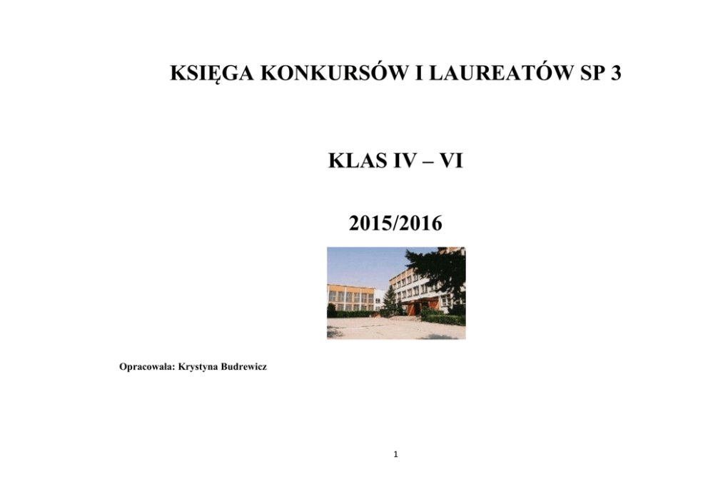 KSIĘGA KONKURSÓW I LAUREATÓW SP 3 KLAS IV – VI 2015/2016 Opracowała: Krystyna Budrewicz 1 Uwaga: konkursy pozaszkolne wytłuszczone czarną czcionką. Konkursy polonistyczne, biblioteczne i interdyscyplinarne: Data: Nazwa konkursu etap szkolny, (ogólnopolski, wojewódzki, międzyszkolny powiatowy, miejski, miejski, międzyszkolny, szkolny) powiatowy wojewódzki, ogólnopolski Szkolny Konkurs rozpoczęcie ,,Książkomania” 2015/2016 październik 2015 zakończenie maj 2016 Nauczyciel Miejsce odpowiedzialny wyróżnienie za konkurs kategoria A.Chorążyczewska I miejsce II miejsce III miejsce Nazwiska laureatów, finalistów Nauczyciel uczący danego ucznia klasa (opiekun ucznia) 1. Paulina LaukOwczarek, 5B , Zofia Kubacka, 5E 2. Klaudia Mańk, 5D, Kamila Mańk, 5D 3. Maria Błaś, 4B , Emilia Kowal, 4C K. Pławska A.Chorążyczewska K. Pławska S.Mechel-Bielak Wyróżnienia: Alicja Kowal, 2A Kamil Zdąbłasz, 5A Klaudia Wawryk, 5B Angelika Szot, 5E Wiktoria Wojtas, 6B Konkurs Zdolny Ślązaczek XIV Międzyszkolny Konkurs Literacki Jan Paweł II Papież - Poeta, 15.10.15/etap szkolny/ Międzyszkolny, Październik 2015 S. Mechel Bielak B. Sajkowska S. Mechel Bielak finalista Wyróżnienia: 2 A.Chorążyczewska K. Pławska A.Chorążyczewska T. Tyralska Bartłomiej Bychawski 6c S.Mechel Bielak Klaudia Mańk-kl. 5d, Karolina Jaworska-kl. 6a, K.PławskaS.Mechel-Bielak- Pielgrzym organizowany przez Gimnazjum nr 4 we Wrocławiu Szkolny Konkurs Recytatorski, przeznaczony dla uczniów klas 4 - 6 18 styczeń 2016 K. Pławska kategoria: Recytacja wiersza ulubionego poety Miejsce I:Urszula Lenartowicz (6B) p. M. Tyralska-Chajbowicz Miejsce II: Michał Kaszowski (6E) p. S. Mechel-Bielak Miejsce III: Natasza Madej (6D) p. M. Tyralska-Chajbowicz Wyróżnienia: Natalia Gadzinowska (5D) p. K. Pławska, Pola Grabowska (4A) p. A. Chorążyczewska, Natasza Kozłowska (6D) p. M. Tyralska-Chajbowicz KATEGORIA: recytacja wiersza wrocławskiego poety Wyróżnienia: Zofia Kubacka (5E) p. A. Chorążyczewska, Klaudia Mańk (5D) p. K. Pławska, Paulina Biernat (6A) p. S. Mechel-Bielak Międzyszkolny konkurs 09.01.16 -finał ZAPOMNIANA SZTUKA KALIGRAFII, którego organizatorem było Gimnazjum nr 12 we Wrocławiu. S.Mechel-Bielak K. Pławska Laureaci MARIA BŁAŚ, kl. 4B KLAUDIA MAŃK, kl. 5d KAMILA MAŃK, kl,5d S.Mechel-Bielak K. Pławska Dolnośląski Konkurs 28.04.16 - finał Dziennikarski ,,Współczesny Dolny Śląsk” p. M. TyralskaChajbowicz Laureaci 1.Natalia Gadzinowska 5d 2. Igor Siestrzeńcewicz-Bohusz 5d K. Pławska kl. 5d GRA MIEJSKA-WROTA PRZESZŁOŚCI – konkurs szkolny Agnieszka Chorążyczewska Sylwia Mechel-Bielak Beata Miniajluk Zosia Kubacka Asia Mysior Ola Rygała Marta Rogowska wych. R. Wajler 6.05.2016 I miejsce - drużyna z kl.5E w składzie: 3 Adam Grygorkiewicz II miejsce - drużyna z kl.5A w składzie: Roksana Rałowska Kinga Skowronek Bartosz Kaczmarczyk Wiktor Potrzebka Gracjan Momot III miejsce - drużyna z kl.5C w składzie: Julia Pirga Klara Marcinowska Adam Wieczorek Wojtek Gorączek Krzysztof Drab wych. A. Wójcik (wych. B. Skonieczna) Konkursy matematyczne i informatyczne, techniczne: XIII Matematyczny Marsz na Orientację. 03.10.2015 Wzięło w nim udział 115 patroli ze szkół podstawowych; z naszej szkoły – 3, są to: Renata Szachowska 1.Bartłomiej Bychawski – 6c, Jakub Rudzik – 6c, Cyryl Szatan – 6c =>II miejsce II miejsce Urszula WojciechowskaDrzazga mgr Renata Szachowska 2.Dawid Dieleńdziak – 5d, Tomasz Gąciarz – 5d, Jan Pezda – 5b => XV miejsce XV miejsce 3.Oliwia Majtyka – 5d, Maja Omelaniuk – 4 mgr Renata 5d, Andrzej Pijanowski – 5d Międzynarodowy Konkurs Matematyczny KANGUR. Konkurs przeznaczony jest dla uczniów klas 2 - 6. 17 marca 2016r Konkurs matematyczny KoMa ogólnopolski 16,17 listopada Justyna 2015 r – Siestrzeńcewicz eliminacje szkole Bohusz 05 grudnia finał XIV Maraton Matematyczny 17 IX 2015, godz. 8-14 ogólnopolski eliminacje dla szkół Barbara Sajkowska Urszula Wojciechowska - Szachowska Laureaci – 2 m-ce (patrol) Bartłomiej Bychawski 6a Jakub Rudzik 6a Cyryl Szatan 6a wyróżniony wyróżniony laureat Wynik bdb wyróżniona Maksymilian Kowalski4d Jan Pezda5b Bartłomiej Bychawski6a Cyryl Szatan6a Anna Kubiak 6b U. Drzazga R. Szachowska U. Drzazga U. Drzazga B. Sajkowska Finalista Finalista Finalista Finalista, laureat I miejsce Finalista Finalista Finalista Finalista Finalista Finalista Cyryl Szatan 6a Jan Pezda 5b Michał Mądrala 6c Bartłomiej Bychawski 6a Anna Kubiak 6b Maciej Pancewicz 6e Jakub Rudzik 6a Maja Omelaniuk 5d Michał Raczkiewicz6d Wiktoria Wojtas 6b Daniel Jankowski 6c Urszula Wojciechowska Drzazga Renata Szachowska Adrian Czekaj Urszula Wojciechowska Drzazga Adrian Czekaj Barbara Sajkowska Urszula Wojciechowska Drzazga Renata Szachowska Justyna Siestrzeńceicz Bohusz Adrian Czekaj Adrian Czekaj Finalista Finalista Finalista Finalista Bartek Bychawski 6a Anna Kubiak 6b Michał Mądrala 6c Jan Pezda 5b Urszula WojciechowskaDrzazga Adrian Czekaj Adrian Czekaj 5 Urszula WojciechowskaDrzazga KONKURS ASY Z SZÓSTEJ KLASY międzyszkolny Ogólnopolski konkurs informatyczny Bóbr wrocławskich 19 IX 2015, godz. 10-24 finały Drzazga Finalista finalista Michał Raczkiewicz 6d Cyryl Szatan 6a Renata Szachowska Justyna Siestrzeńcewicz – Bohusz Urszula WojciechowskaDrzazga 29.01.2016 I etap, 19.03.2016 II etap Barbara Sajkwska Finalistka m.28 w j. angielskim Finalista 4m , wyróżnienie w części humanistycznej Finalista, laureat I miejsce w matematyce Finalista 15 m w części przyrodniczej Finalistka 13m w części humanistycznej Finalista 6 m w części matematycznej Anna Kubiak Aleksandra burgiel - Midał Sylwia Mechel Bielak 15.10.2015 etap powiatowy 12.11.2015-etap ogólnopolski KONKURS – ZDOLNY ŚLĄZACZEK dolnośląski B. Sajkowska Justyna Siestrzeńcewicz Bohusz szkolny/12.11.15 Barbara Sajkowska etap powiatowy Etap powiatowy Etap powiatowy 6b Bychawski Bartłomiej 6a Bychawski Bartłomiej 6a 