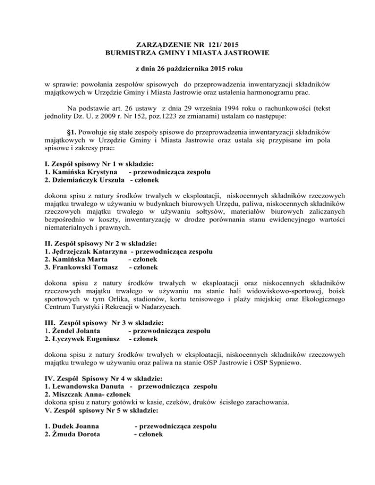 ZARZĄDZENIE NR 121/ 2015 BURMISTRZA GMINY I MIASTA JASTROWIE z dnia 26 października 2015 roku w sprawie: powołania zespołów spisowych do przeprowadzenia inwentaryzacji składników majątkowych w Urzędzie Gminy i Miasta Jastrowie oraz ustalenia harmonogramu prac. Na podstawie art. 26 ustawy z dnia 29 września 1994 roku o rachunkowości (tekst jednolity Dz. U. z 2009 r. Nr 152, poz.1223 ze zmianami) ustalam co następuje: §1. Powołuje się stałe zespoły spisowe do przeprowadzenia inwentaryzacji składników majątkowych w Urzędzie Gminy i Miasta Jastrowie oraz ustala się przypisane im pola spisowe i zakresy prac: I. Zespół spisowy Nr 1 w składzie: 1. Kamińska Krystyna - przewodnicząca zespołu 2. Dziemiańczyk Urszula - członek dokona spisu z natury środków trwałych w eksploatacji, niskocennych składników rzeczowych majątku trwałego w używaniu w budynkach biurowych Urzędu, paliwa, niskocennych składników rzeczowych majątku trwałego w używaniu sołtysów, materiałów biurowych zaliczanych bezpośrednio w koszty, inwentaryzację w drodze porównania stanu ewidencyjnego wartości niematerialnych i prawnych. II. Zespół spisowy Nr 2 w składzie: 1. Jędrzejczak Katarzyna - przewodnicząca zespołu 2. Kamińska Marta - członek 3. Frankowski Tomasz - członek dokona spisu z natury środków trwałych w eksploatacji oraz niskocennych składników rzeczowych majątku trwałego w używaniu na stanie hali widowiskowo-sportowej, boisk sportowych w tym Orlika, stadionów, kortu tenisowego i plaży miejskiej oraz Ekologicznego Centrum Turystyki i Rekreacji w Nadarzycach. III. Zespół spisowy Nr 3 w składzie: 1. Żendel Jolanta - przewodnicząca zespołu 2. Łyczywek Eugeniusz - członek dokona spisu z natury środków trwałych w eksploatacji, niskocennych składników rzeczowych majątku trwałego w używaniu oraz paliwa na stanie OSP Jastrowie i OSP Sypniewo. IV. Zespół Spisowy Nr 4 w składzie: 1. Lewandowska Danuta - przewodnicząca zespołu 2. Miszczak Anna- członek dokona spisu z natury gotówki w kasie, czeków, druków ścisłego zarachowania. V. Zespół spisowy Nr 5 w składzie: 1. Dudek Joanna 2. Żmuda Dorota - przewodnicząca zespołu - członek dokona spisu z natury niskocennych składników rzeczowych majątku trwałego w używaniu w terenie, środków trwałych dzierżawionych obcym, inwentaryzacji w drodze porównania stanu ewidencyjnego gruntów z zakresu obrębu miasta, środków trudno dostępnych. VI. Zespół spisowy Nr 6 w składzie: 1. Piotr Kozłowski - przewodniczący zespołu 2. Piszczek Katarzyna - członek dokona spisu z natury materiałów w magazynie Urzędu, inwentaryzacji w drodze porównania stanu ewidencyjnego gruntów stanowiących mienie komunalne z zakresu obrębu gminy. §2. Pracownicy referatu finansowego, prowadzący ewidencję analityczną należności i zobowiązań przeprowadzą inwentaryzację w drodze uzyskania od kontrahentów pisemnego potwierdzenia należności i zobowiązań za wyjątkiem spornych i wątpliwych dotyczących pracowników oraz publicznoprawnych, powierzonych innych składników majątkowych, środków pieniężnych na rachunkach bankowych oraz kredytów i pożyczek. Pracownicy referatu finansowego przeprowadza również inwentaryzację w drodze porównania stanu ewidencyjnego inwestycji rozpoczętych, należności spornych i wątpliwych, należności i zobowiązań publicznoprawnych, należności i zobowiązań wobec pracowników, rozliczeń między okresowych kosztów, funduszy specjalnych, rezerwy, przychody przyszłych okresów, należności długoterminowych, udziałów w obcych podmiotach gospodarczych. §3. 1. W przypadku zmiany osoby materialnie odpowiedzialnej lub innych okoliczności, spisem z natury bez względu na termin, należy objąć wszystkie składniki majątkowe. 2. W przypadku sytuacji omówionej w pkt 1 inwentaryzacji dokonuje powołany zespół spisowy ze względu na pole spisowe i zakres prac zgodnie z § 1. §4. Ustala się harmonogram prac zespołów spisowych stanowiący załącznik Nr 1 do Zarządzenia, który podlega aktualizacji. §5. Wykonanie Zarządzenia powierza się Przewodniczącemu Komisji Inwentaryzacyjnej. §6. Traci moc Zarządzenie Nr 99/2014 Burmistrza Gminy i Miasta Jastrowie z dnia 27 października 2014r. w sprawie powołania zespołów spisowych do przeprowadzenia inwentaryzacji składników majątkowych gminy i miasta oraz ustalenia harmonogramu prac. §7. Zarządzenie wchodzi w życie z dniem podpisania. Załącznik do Zarządzenia Nr 121/2015 Burmistrza Gminy i Miasta Jastrowie z dnia 26 października 2015r. H ar m o n o g r a m prac zespołów spisowych na 2015 rok 1. Zespół spisowy Nr l w składzie: Kamińska Krystyna – przewodnicząca zespołu Dziemiańczyk Urszula – członek Dokona: 1) spisu z natury w dniach 0 2 – 20.11.2015 roku wg stanu na dzień 31.10 2015r. - środków trwałych w eksploatacji w budynkach biurowych Urzędu, - niskocennych składników rzeczowych majątku trwałego w używaniu w budynkach biurowych Urzędu, - paliwa, - niskocennych składników rzeczowych majątku trwałego w użytkowaniu sołtysów, 2) spisu z. natury w dniach 04 – 05.01.2016 r. wg stanu na dzień 31 12.2015r. materiałów biurowych zaliczanych bezpośrednio w koszty, 3) inwentaryzacji w drodze porównania stanu ewidencyjnego w dniach 04 – 11.01.2016r. wg stanu na dzień 31.12.2015r. wartości niematerialnych i prawnych. 2. Zespół spisowy Nr 2 w składzie: Jędrzejczak Katarzyna – przewodnicząca zespołu Kamińska Marta – członek Frankowski Tomasz – członek Dokona spisu z natury w dniach 0 2 – 27.11.2015 roku wg na 31.10 2015r. - środków trwałych w eksploatacji hali widowiskowo-sportowej, boisk sportowych w tym Orlika, stadionów, kortu tenisowego i plaży miejskiej oraz Ekologicznego Centrum Turystyki i Rekreacji w Nadarzycach, - niskocennych składników rzeczowych majątku trwałego w używaniu na stanie hali widowiskowo-sportowe