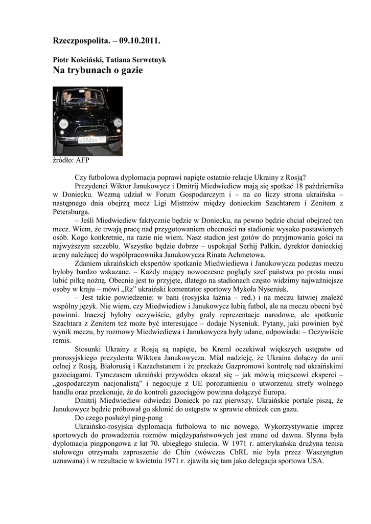 Rzeczpospolita. – 09.10.2011. Piotr Kościński, Tatiana Serwetnyk Na trybunach o gazie źródło: AFP Czy futbolowa dyplomacja poprawi napięte ostatnio relacje Ukrainy z Rosją? Prezydenci Wiktor Janukowycz i Dmitrij Miedwiediew mają się spotkać 18 października w Doniecku. Wezmą udział w Forum Gospodarczym i – na co liczy strona ukraińska – następnego dnia obejrzą mecz Ligi Mistrzów między donieckim Szachtarem i Zenitem z Petersburga. – Jeśli Miedwiediew faktycznie będzie w Doniecku, na pewno będzie chciał obejrzeć ten mecz. Wiem, że trwają pracę nad przygotowaniem obecności na stadionie wysoko postawionych osób. Kogo konkretnie, na razie nie wiem. Nasz stadion jest gotów do przyjmowania gości na najwyższym szczeblu. Wszystko będzie dobrze – uspokajał Serhij Pałkin, dyrektor donieckiej areny należącej do współpracownika Janukowycza Rinata Achmetowa. Zdaniem ukraińskich ekspertów spotkanie Miedwiediewa i Janukowycza podczas meczu byłoby bardzo wskazane. – Każdy mający nowoczesne poglądy szef państwa po prostu musi lubić piłkę nożną. Obecnie jest to przyjęte, dlatego na stadionach często widzimy najważniejsze osoby w kraju – mówi „Rz” ukraiński komentator sportowy Mykoła Nyseniuk. – Jest takie powiedzenie: w bani (rosyjska łaźnia – red.) i na meczu łatwiej znaleźć wspólny język. Nie wiem, czy Miedwiediew i Janukowycz lubią futbol, ale na meczu obecni być powinni. Inaczej byłoby oczywiście, gdyby grały reprezentacje narodowe, ale spotkanie Szachtara z Zenitem też może być interesujące – dodaje Nyseniuk. Pytany, jaki powinien być wynik meczu, by rozmowy Miedwiediewa i Janukowycza były udane, odpowiada: – Oczywiście remis. Stosunki Ukrainy z Rosją są napięte, bo Kreml oczekiwał większych ustępstw od prorosyjskiego prezydenta Wiktora Janukowycza. Miał nadzieję, że Ukraina dołączy do unii celnej z Rosją, Białorusią i Kazachstanem i że przekaże Gazpromowi kontrolę nad ukraińskimi gazociągami. Tymczasem ukraiński przywódca okazał się – jak mówią miejscowi eksperci – „gospodarczym nacjonalistą” i negocjuje z UE porozumieniu o utworzeniu strefy wolnego handlu oraz przekonuje, że do kontroli gazociągów powinna dołączyć Europa. Dmitrij Miedwiediew odwiedzi Donieck po raz pierwszy. Ukraińskie portale piszą, że Janukowycz będzie próbował go skłonić do ustępstw w sprawie obniżek cen gazu. Do czego posłużył ping-pong Ukraińsko-rosyjska dyplomacja futbolowa to nic nowego. Wykorzystywanie imprez sportowych do prowadzenia rozmów międzypaństwowych jest znane od dawna. Słynna była dyplomacja pingpongowa z lat 70. ubiegłego stulecia. W 1971 r. amerykańska drużyna tenisa stołowego otrzymała zaproszenie do Chin (wówczas ChRL nie była przez Waszyngton uznawana) i w rezultacie w kwietniu 1971 r. zjawiła się tam jako delegacja sportowa USA. Efektem tego spotkania i innych intensywnych działań dyplomatycznych była w lutym 1972 r. sensacyjna wizyta w Pekinie prezydenta USA Richarda Nixona i absolutny przełom w stosunkach amerykańsko-chińskich. W ostatnim czasie najbardziej wymownym przykładem podobnych działań była tureckoarmeńska dyplomacja futbolowa. Oba te kraje od lat są w jak najgorszych stosunkach. Główny powód jest historyczny: Erewan obciąża Turków winą za rzeź Ormian podczas I wojny światowej, a Ankara dowodzi, że takie zbrodnie nie miały miejsca. Innym powodem jest ormiańsko-azerbejdżański spór o Górski Karabach, w którym Turcja popiera Azerów. W 2008 r. prezydent Turcji Abdullah Gül jako pierwszy szef tego państwa odwiedził Armenię, przyjeżdżając do Erewanu na mecz kwalifikacyjny do piłkarskich mistrzostw świata 2010 r. (oczywiście Ormianie grali z Turkami). Obejrzał go wspólnie z armeńskim prezydentem Serżem Sarksjanem. A wkrótce potem zaczęły się rozmowy w sprawie normalizacji stosunków, zakończone podpisaniem stosownego porozumienia przez szefów dyplomacji obu krajów w 2009 r. w szwajcarskim Zurychu. Tyle że to porozumienie nie zostało ratyfikowane i ostatecznie nie weszło w życie. Zupełnie niedawno doszło do kolejnej próby prowadzenia futbolowej dyplomacji, tym razem między Kambodżą i Tajlandią. We wrześniu w Phnom Penh grali w piłkę politycy obu krajów, kierowani z jednej strony przez kambodżańskiego premiera Hun Sena, a z drugiej – przez byłego szefa tajlandzkiego rządu Somchaia Wongsawata. Obserwowało ich 50 tys. widzów. Jak podkreślił Hun Sen, „koszmarna era” fatalnych stosunków między oboma krajami się zakończyła, a ten mecz tylko potwierdza zmianę. Kambodżańczycy wygrali 10:7.