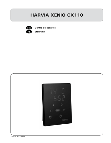 harvia XENIO CX110 Centre de contrôle Sterownik 18022016/ZVR-871 Ces instructions d’installation et d’utilisation s’adressent aux propriétaires de saunas, poêles et centres de contrôle, aux personnes responsables de saunas, poêles et centres de contrôle, et aux électriciens chargés d’installer les poêles et centres de contrôle. Une fois le centre de contrôle installée, ces instructions d’installation et d’utilisation seront remises au propriétaire des saunas, poêles et centre de contrôle, ou à la personne chargée de leur maintenance. Centre de contrôle HARVIA XENIO (CX110) Fonction du centre de contrôle : le centre de contrôle sert à contrôler les fonctions du poêle. Il ne doit en aucun cas être utilisé pour tout autre objet. Poni¿sza instrukcja instalacji i obs³ugi sterownika Xenio skierowana jest do osób posiadaj±cych saunê (piec i sterownik), osób odpowiedzialnych za funkcjonowanie sauny (pieca i sterownika) jak i dla monterów oraz elektryków. Instrukcja ta powinna byæ przekazana w³a¶cicielowi sauny (pieca i sterownika) lub osobie odpowiedzialnej za prawid³owe funkcjonowanie sauny (pieca i sterownika). STEROWNIK HARVIA XENIO (CX110) Sterownik ten jest przeznaczony do sterowania i kontrolowania elektrycznych pieców do saun. Nie powinien byæ u¿ywany do innych celów. Gratulujemy dokonania znakomitego wyboru! Félicitations pour cet excellent choix ! Table des matiérs SPIS TRE¦CI 1. HARVIA Xenio............................................................ 3 1.1. Généralités.......................................................... 3 1.2. Données techniques............................................. 3 1.3. Dépannage.......................................................... 4 1. HARVIA Xenio...........................................................................3 1.1. Ogólnie.............................................................................3 1.2. Dane techniczne...............................................................3 1.3. Problemy (errors)..............................................................4 2. MODE D’EMPLOI.......................................................... 5 2.1. Utiliser le poêle.................................................... 5 2.1.1. Poêle allumés.............................................. 5 2.1.2. Poêle éteint................................................. 6 2.2. Changement des réglages..................................... 6 2.3. Utilisation d’accessoires........................................ 6 2.3.1. Allumage.................................................... 6 2. INSTRUKCJA OBS£UGI...............................................................5 2.1. Przed w³±czeniem pieca...................................................5 2.1.1. W³±czanie pieca......................................................5 2.1.2. Wy³±czanie pieca....................................................6 2.2. Zmiana ustawieñ..............................................................6 2.3. Inne funkcje......................................................................6 2.3.1. O¶wietlenie.............................................................6 3. INSTRUCTIONS D’INSTALLATION.................................. 9 3.1. Installer le tableau de commande............................ 9 3.2. Installer le bloc d’alimentation.............................. 10 3.2.1. Raccordement électrique............................. 10 3.2.2. Défaillances du fusible du bloc d’alimentation.10 3.2.3. Bloc d'alimentation supplémentaire LTY17 (en option)............................................................... 12 3.3. Installer le capteur de température........................ 12 3.3.1. Installer le capteur de température WX232.... 12 3.4. Réinitialisation de la sécurité surchauffe................ 14 3. INSTRUKCJA MONTA¯U............................................................9 3.1. Instalacja panela steruj±cego..........................................9 3.2. Instalacja skrzynki elektrycznej.....................................10 3.2.1. Pod³±czenia elektryczne.......................................10 3.2.2. Uszkodzenia bezpieczników w skrzynce.............10 3.2.3. Modu³ zwiêkszenia mocy LTY17 (opcja)...............12 3.3. Instalacja czujnika temperatury....................................12 3.3.1. Instalacja czujnika temperatury WX232..............12 3.4. Restart bezpiecznika termicznego................................14 4. PIÈCES DÉTACHÉES................................................... 14 4. CZʦCI ZAMIENNE...................................................................14 FR PL 1. HARVIA Xenio 1. HARVIA Xenio 1.1. Généralités 1.1. Ogólnie 1.2. Données techniques 1.2. Dane techniczne Le centre de contrôle Harvia Xenio sert à contrôler un poêle électrique avec une puissance de sortie de 2,3–11 kW. Le centre de contrôle se compose d’un panneau de commande, d’un bloc d’alimentation et d’un capteur de température. Voir figure 1. Le centre de contrôle régule la température dans le sauna en fonction des informations transmises par les capteurs. Le capteur de température et la sécurité-surchauffe se trouvent dans le boîtier capteur de température. La température est détectée par une thermistance NTC et la sécurité de surchauffe peut-être réinitialisée ( 3.4.). Le centre de contrôle peut servir à pré-programmer le démarrage du poêle (durée de pré-programmation). Voir figure 3a. Przewód Câble de commandes Panel steruj±cy Bloc d’alimentation Skrzynka elektryczna Panel steruj±cy: • Zakres temperatury: 40–110 °C • Czas pracy: sauny rodzinne 1–6 h, sauny publiczne 1–12 h. W celu wyd³u¿enia czasu pracy proszê skontaktowaæ siê z importerem lub producentem. • Mo¿liwo¶æ programowania czasu w³±czenia pieca: 0–12 h. • W³±cznik o¶wietlenia. • Wymiary: 85 mm x 24 mm x 110 mm • D³ugo¶æ przewodu: 5 m
