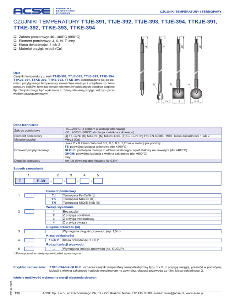 CZUJNIKI TEMPERATURY I TERMOPARY Lp Lp Zakres pomiarowy:-40...400°C (600°C) Element pomiarowy: J, K, N, T, inny Klasa dokładności: 1 lub 2 Materiał przylgi: miedź (Cu) Lp Lp CZUJNIKI TEMPERATURY TTJE-391, TTJE-392, TTJE-393, TTJE-394, TTKJE-391, TTKE-392, TTKE-393, TTKE-394 Opis Czujniki temperatury z serii TTJE-391, TTJE-392, TTJE-393, TTJE-394, TTKJE-391, TTKE-392, TTKE-393, TTKE-394 przeznaczone są do pomiaru przylgowego temperatury elementów maszyn i urządzeń np. temperatury bloków, form lub innych elementów poddanych obróbce cieplnej itp. Czujniki mogą być wykonane z różną odmianą przylgi i różnym przewodem przyłączeniowym. ∅4.2 Dane techniczne 12 ∅12 -50...260°C (z kablem w izolacji teflonowej) -50...400°C (600°C) (izolacja z włókna szklanego) [J] Fe-CuNi, [K] NiCr-Ni, [N] NiCrSi-NiSi, [T] Cu-CuNi wg PN‑EN 60584: 1997, klasa dokładności 1 lub 2 Miedź (Cu) Linka 2 x 0.22mm2 lub drut 0,2, 0,5, 0,8, 1,2mm w izolacji jak poniżej: TT: podwójna izolacja teflonowa (do +260°C) GLGLP: podwójna izolacja z włókna szklanego i oplot stalowy na zewnątrz (do +400°C) GHGH: podwójna izolacja z włókna szklanego (do +600°C) Inny 1m lub dowolna stopniowana co 0,5m Zakres pomiarowy Element pomiarowy Materiał przylgi Przewód przyłączeniowy Długość przewodu Sposób zamawiania 1 T 2 E-39 - 3 - 4 - 5 - Element pomiarowy 1 TJ TK TN Termopara Fe-CuNi (J) Termopara NiCr-Ni (K) Termopara NiCrSi-NiSi (N) Wersja wykonania 2 1 2 3 4 Bez przylgi Z przylgą i oczkiem Z przylgą kwadratową Z przylgą okrągłą Długość przewodu [m] 3 ... Wymagana długość przewodu (np. 1,5m) Klasa dokładności 4 1 lub 2 Klasa dokładności 1 lub 2 Rodzaj izolacji przewodu 5 ... Wymagana izolacja przewodu (np. GLGLP) *) Pola opcjonalne należy wypełnić jeżeli są wymagane Przykład zamawiania: TTKE-394-3-2-GLGLP: oznacza czujnik temperatury termoelektryczny typu 1 x K, z przylgą okrągłą, przewód w podwójnej izolacji z włókna szklanego i oplocie metalowycm na zewnatrz, długość przewodu Lp=3m, klasa dokładności 2. DATA: 22.12.2015 Istnieje możliwość wykonania wersji niestandardowych. 130 ACSE Sp. z o.o., ul. Pachońskiego 2A, 31 - 223 Kraków, tel/fax +12 415 05 09, e-mail: [email protected], www.acse.pl