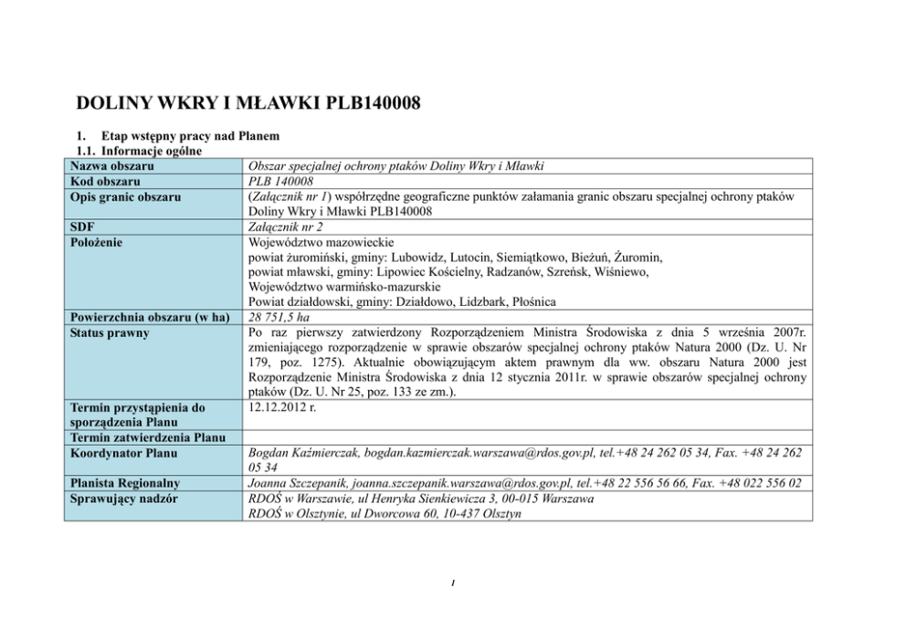 DOLINY WKRY I MŁAWKI PLB140008 1. Etap wstępny pracy nad Planem 1.1. Informacje ogólne Obszar specjalnej ochrony ptaków Doliny Wkry i Mławki Nazwa obszaru PLB 140008 Kod obszaru (Załącznik nr 1) współrzędne geograficzne punktów załamania granic obszaru specjalnej ochrony ptaków Opis granic obszaru Doliny Wkry i Mławki PLB140008 Załącznik nr 2 SDF Województwo mazowieckie Położenie powiat żuromiński, gminy: Lubowidz, Lutocin, Siemiątkowo, Bieżuń, Żuromin, powiat mławski, gminy: Lipowiec Kościelny, Radzanów, Szreńsk, Wiśniewo, Województwo warmińsko-mazurskie Powiat działdowski, gminy: Działdowo, Lidzbark, Płośnica Powierzchnia obszaru (w ha) 28 751,5 ha Po raz pierwszy zatwierdzony Rozporządzeniem Ministra Środowiska z dnia 5 września 2007r. Status prawny zmieniającego rozporządzenie w sprawie obszarów specjalnej ochrony ptaków Natura 2000 (Dz. U. Nr 179, poz. 1275). Aktualnie obowiązującym aktem prawnym dla ww. obszaru Natura 2000 jest Rozporządzenie Ministra Środowiska z dnia 12 stycznia 2011r. w sprawie obszarów specjalnej ochrony ptaków (Dz. U. Nr 25, poz. 133 ze zm.). 12.12.2012 r. Termin przystąpienia do sporządzenia Planu Termin zatwierdzenia Planu Bogdan Kaźmierczak, [email protected], tel.+48 24 262 05 34, Fax. +48 24 262 Koordynator Planu 05 34 Joanna Szczepanik, [email protected], tel.+48 22 556 56 66, Fax. +48 022 556 02 Planista Regionalny RDOŚ w Warszawie, ul Henryka Sienkiewicza 3, 00-015 Warszawa Sprawujący nadzór RDOŚ w Olsztynie, ul Dworcowa 60, 10-437 Olsztyn 1 1.2. Ustalenie terenu objętego Planem L.p. Nazwa krajowej formy ochrony przyrodylub nadleśnictwa, pokrywającej/go się z obszarem, która/e może powodować wyłączenie części terenu ze sporządzania Planu 1. Rezerwat Gołuska Kępa Dokument planistyczny brak 2. Rezerwat Dolina Mławki brak 3. Rezerwat Olszyny Rumockie brak 5. Nadleśnictwo Lidzbark 6. Nadleśnictwo Dwukoły Plan urządzenia lasu na lata 20092018 zatwierdzony decyzją Ministra Środowiska DL-lpn-61113/15021/10/jł z dn. 24 marca 2010 r. Plan urządzenia lasu sporządzony dla na lata 2004-2013 zatwierdzony decyzją Ministra Środowiska DL-lpn-611-53/05 z dn. 24 sierpnia 2005r. Teren objęty PZO to cały obszar Natura 2000 powierzchni 28 751,5 [ha] 2 Uzasadnienie wyłączenia Powierzchniakrajowej części terenu formy ochrony przyrody zesporządzania PZO lub nadleśnictwa pokrywająca się z obszarem [ha] Nie zachodzą przesłanki określone w art. 28 ust. 11 ustawy o ochronie przyrody Nie zachodzą przesłanki określone w art. 28 ust. 11 ustawy o ochronie przyrody Nie zachodzą przesłanki określone w art. 28 ust. 11 ustawy o ochronie przyrody Nie zachodzą przesłanki określone w art. 28 ust. 11 ustawy o ochronie przyrody Nie zachodzą przesłanki określone w art. 28 ust. 11 ustawy o ochronie przyrody 9,9 147,4 149,5 584,72 866 1.3. Mapa obszaru Natura 2000 Mapę obszaru Natura 2000 zamieszczono w Załączniku nr 3 Skala ..........., format........... 1.4. Opis założeń do sporządzenia Planu Obszar Natura 2000 PLB140008 Doliny Wkry i Mławki (zwany dalej „obszarem Natura 2000”) o powierzchni 28 751,5 ha, został po raz pierwszy zatwierdzony Rozporządzeniem Ministra Środowiska z dnia 5 września 2007r. zmieniającego rozporządzenie w sprawie obszarów specjalnej ochrony ptaków Natura 2000 (Dz. U. Nr 179, poz. 1275). Aktualnie obowiązującym aktem prawnym dla ww. obszaru Natura 2000 jest Rozporządzenie Ministra Środowiska z dnia 12 stycznia 2011r. w sprawie obszarów specjalnej ochrony ptaków (Dz. U. Nr 25, poz. 133 ze zm.). Obszar leży w kompleksie leśnym Pomiechówek, po obu stronach przełomu rzeki Wkry. Obejmuje pradolinę Wkry wraz z przyległymi łęgami oraz z wysoczyzną i jej stromym stokiem z grądami zboczowymi. Geobotanicznie obszar należy do okręgu Warszawskiego w Pasie Wielkich Dolin. Szczególnie licznie w rezerwacie występują łęgi. Pokrywa zielna jest w nich na ogół mało zmieniona. Występują tu gleby typu mad i torfów niskich, miejscami czarnych ziem. Jedyny starszy drzewostan położony jest w pradolinie strumienia bez nazwy wpadającego do Wkry. Panują tu 65-85 letnie drzewostany olszowo-jesionowe z domieszką wiązu szypułkowego i świerka. Najcenniejszym krajobrazowo jest ok. 70-letni drzewostan z panującym jesionem. Drugim zbiorowiskiem są potencjalne lasy grądowe Tilio – Carpinetum w odmianach typowej, zboczowej i niskiej. Skład drzewostanowy grądów jest zdominowany przez sztuczne odnowienia sosnowe z domieszką dębu.. Obszar obejmuje przełomowy odcinek Wkry z rzeką o naturalnym, roztokowym charakterze. Rosną tu pozostałości, nieco przekształconych, lasów łęgowych i grądów - rodzajów siedlisk z Załącznika I Dyrektywy Rady 92/43/EWG, które zajmują ponad 60% obszaru. Stwierdzono obecność bobra Castor fiber i wydry Lutra lutra. W rzece występują podwodne, przybrzeżne zbiorowiska rdestnicowe i dość bogata ichtiofauna (jednak bez gatunków z Załącznika II). Bogata jest również awifauna. W ostoi stwierdzono występowanie co najmniej 24 gatunków ptaków z Załącznika I Dyrektywy Ptasiej. Liczebności 2 gatunków (błotniaka łąkowego i derkacza) spełniają kryteria wyznaczania ostoi ptaków wprowadzone przez BirdLife International. Ponadto 10 gatunków zostało zamieszczonych na liście zagrożonych ptaków w Polskiej czerwonej księdze zwierząt. Ostoja jest jednym z 10 najważniejszych w Polsce lęgowisk błotniaka łąkowego, jak tez ważnym legowiskiem derkacza. Przedmiotem ochrony na obszarze są następujące gatunki ptaków: A084 błotniak łąkowy (Circus pygargus) A122 derkacz (Crex crex) A272 podróżniczek (Luscinia svecica) A153 kszyk (Gallinago gallinago) A160 kulik wielki (Numenius arquata) Lista przedmiotów ochrony może ulec weryfikacji w toku prac. 3 Plan zadań ochronnych Założeniem do opracowania projektu planu zadań ochronnych jest utrzymanie lub odtworzenie właściwego stanu 