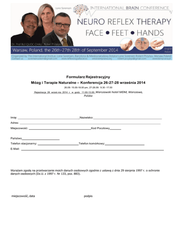 Formularz Rejestracyjny Mózg i Terapie Naturalne – Konferencja 26-27-28 września 2014 26.09: 15.00-18.00 pm, 27-28.09: 9.30 -17.00 Rejestracja 26 wrześ nia 2014 r. w godz. 11.00-13.00: Warszawski hotel MDM, Warszawa, Polska Imię: _Nazwisko: Adres: Miejscowość: Kod Pocztowy Państwo Telefon stacjonarny: Telefon komórkowy: E-Mail: Wyrażam zgodę na przetwarzanie moich danych osobowych zgodnie z ustawą z dnia 29 sierpnia 1997 r. o ochronie danych osobowych (Dz.U. z 1997 r. Nr 133, poz. 883). miejscowość, data podpis Opłata rejestracyjna za udział w konferencji w tym: 2 noclegi w pokojach dwuosobowych (26/27 i 27/28 września 2014) oraz śniadanie i lunch 27-28 września 2014 r. Rejestracja najpóźniej, 15 września 2014.....………………..………….………………………………… € 380 Członkowie Global Network, przed 15 września 2014…………………………………………………… € 320 Dodatkowa opłata za pojedynczy pokój hotelowy, 30 Sierpień 2014....................……….…….………...€ 55 Opłata rejestracyjna bez noclegów i śniadań, w cenie lunch 27-28 września 2014 Rejestracja najpóźniej 15 września 2014..………………..…………………………………………………€ 230 Opłata rejestracyjna za kolację 27 września 2014 (sobotni wieczór): Rejestracja najpóźniej 15 września 2014 ....………………..………………………………….……….….€ 50 Przelew bankowy Płatność przez www.lonesorensen.com Proszę wydrukować, wypełnić i wraz z potwierdzeniem przelewu przesłać na adres: IRFI de Lone Sorensen SL, Amistad 17-19, 08005, Barcelona, Spain - 0034-932655700 Bądź na adres e-mail: [email protected] Nazwa banku: BBVA Banco Bilbao Vizcaya Argentaria, S.A. ADRESSE of the bank: GUIZPUSCOA 110, 08020 BARCELONA, SPAIN IBAN: ES88 0182 1029 6102 0851 5694 SWIFT: BBVAESMMXXX Właściciel rachunku: IRFI de Lone Sorensen SL