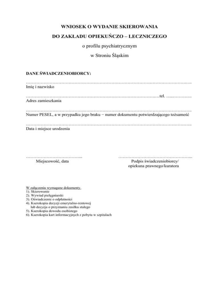 WNIOSEK O WYDANIE SKIEROWANIA DO ZAKŁADU OPIEKUŃCZO – LECZNICZEGO o profilu psychiatrycznym w Stroniu Śląskim DANE ŚWIADCZENIOBIORCY: ……………………………………………………………………………………………….…. Imię i nazwisko …………………………………………………………………………….…tel. …..…………. Adres zamieszkania ………………………………………………………………………………………………….. Numer PESEL, a w przypadku jego braku − numer dokumentu potwierdzającego tożsamość ………………………………………………………………………………………………….. Data i miejsce urodzenia ………………………………... Miejscowość, data W załączeniu wymagane dokumenty. 1). Skierowanie 2). Wywiad pielęgniarski 3). Oświadczenie o odpłatności 4). Kserokopia decyzji emerytalno-rentowej lub decyzja o przyznaniu zasiłku stałego 5). Kserokopia dowodu osobistego 6). Kserokopia kart informacyjnych z pobytu w szpitalach …………………………………………... Podpis świadczeniobiorcy/ opiekuna prawnego/kuratora ...................................................................... miejscowość, data SKIEROWANIE DO ZAKŁADU OPIEKUŃCZO-LECZNICZEGO o profilu psychiatrycznym WOJEWÓDZKIEGO CENTRUM PSYCHIATRII DŁUGOTERMINOWEJ ul. Morawka 1, 57-550 Stronie Śląskie Kieruję Pana/Panią .……………………………………………………………………………… imiona rodziców ……......………………………. ur........................... w ............................................ miejsce zamieszkania ............................................................................................................................. 1. Stan cywilny: 1) panna/kawaler 4) rozwiedziona(y) 2) zamężna/żonaty 5) brak danych 3) wdowa/wdowiec 2. Zatrudnienie: 1) czynna(y) zawodowo 4) bezrobotna(y) 2) emeryt(ka)/rencista(ka) 5) utrzymuje się z innych źródeł 3) na utrzymaniu innych osób 6) brak danych 3. Wykształcenie: 1) podstawowe 4) wyższe 2) zawodowe 5) inne/niepełne 3) średnie 6) brak danych 4. Rodzaj i nr dokumentu stwierdzającego tożsamość osoby badanej lub inny dowód .....................................…………………………………………………………………..………….… 5. Osoba badana jest / nie jest ubezwłasnowolniona częściowo lub całkowicie (właściwe podkreślić) …………………………………………………………………………………………..……….……. 6. Wywiad od osoby badanej ................................................................................................................. …............................................................................................................................................................ …............................................................................................................................................................ 7. Wywiad od rodziny i innych osób ..................................................................................................... …............................................................................................................................................................ …............................................................................................................................................................ ………………………………………………………………………………………………………... 8. Ocena stanu fizycznego ..................................................................................................................... ……….................................................................................................................................................... ……….................................................................................................................................................... ………………………………………………………………………………………………………… 9. Ocena stanu psychicznego ................................................................................................................ ……........................................................................................................................................................ ……........................................................................................................................................................ ………………………………………………………………………………………………………… 10. Przypadek nagły, wynikający ze zdarzeń losowych i uzasadniony stanem zdrowia (tak/nie)* …………………………………………………………………………………………………………………………… 11. Rozpoznanie ………............................ ....................................................... ICD 10 ..................... 12. Schorzenia współistniejące: (właściwe podkreślić) a). choroba zakaźna tak / nie, jeśli tak to jaka? ……………...…………………………….… b). gruźlica tak /nie, jeśli tak, to czy w stadium zakaźnym tak / nie c). narkomania tak /nie d). inne ……………………....…………………………………………………………….…. 13). Stwierdza się, że osoba wyżej wymieniona wymaga: (właściwe podkreślić) całodobowej opieki, pielęgnacji, rehabilitacji i w chwili badania nie wymaga hospitalizacji. *niepotrzebne skreślić ..................................................... podpis i pieczęć lekarza …………………………………………………….…………………........ (