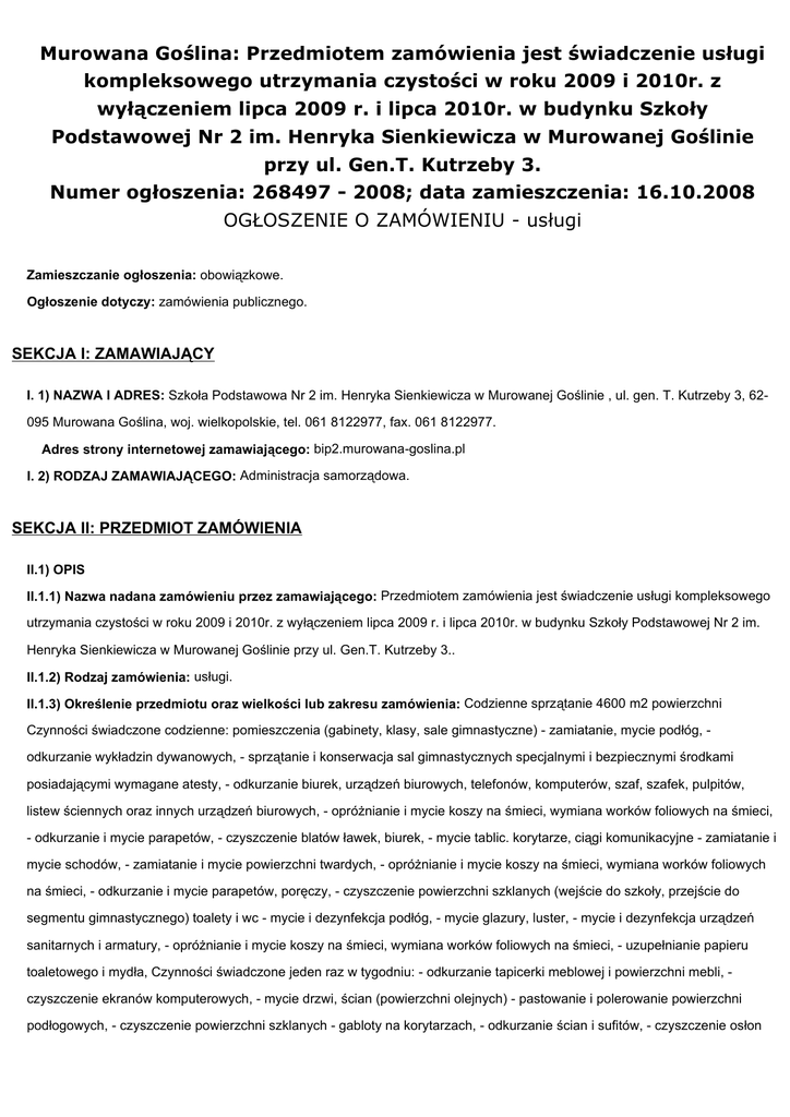 Murowana Goślina: Przedmiotem zamówienia jest świadczenie usługi kompleksowego utrzymania czystości w roku 2009 i 2010r. z wyłączeniem lipca 2009 r. i lipca 2010r. w budynku Szkoły Podstawowej Nr 2 im. Henryka Sienkiewicza w Murowanej Goślinie przy ul. Gen.T. Kutrzeby 3. Numer ogłoszenia: 268497 - 2008; data zamieszczenia: 16.10.2008 OGŁOSZENIE O ZAMÓWIENIU - usługi Zamieszczanie ogłoszenia: obowiązkowe. Ogłoszenie dotyczy: zamówienia publicznego. SEKCJA I: ZAMAWIAJĄCY I. 1) NAZWA I ADRES: Szkoła Podstawowa Nr 2 im. Henryka Sienkiewicza w Murowanej Goślinie , ul. gen. T. Kutrzeby 3, 62095 Murowana Goślina, woj. wielkopolskie, tel. 061 8122977, fax. 061 8122977. Adres strony internetowej zamawiającego: bip2.murowana-goslina.pl I. 2) RODZAJ ZAMAWIAJĄCEGO: Administracja samorządowa. SEKCJA II: PRZEDMIOT ZAMÓWIENIA II.1) OPIS II.1.1) Nazwa nadana zamówieniu przez zamawiającego: Przedmiotem zamówienia jest świadczenie usługi kompleksowego utrzymania czystości w roku 2009 i 2010r. z wyłączeniem lipca 2009 r. i lipca 2010r. w budynku Szkoły Podstawowej Nr 2 im. Henryka Sienkiewicza w Murowanej Goślinie przy ul. Gen.T. Kutrzeby 3.. II.1.2) Rodzaj zamówienia: usługi. II.1.3) Określenie przedmiotu oraz wielkości lub zakresu zamówienia: Codzienne sprzątanie 4600 m2 powierzchni Czynności świadczone codzienne: pomieszczenia (gabinety, klasy, sale gimnastyczne) - zamiatanie, mycie podłóg, odkurzanie wykładzin dywanowych, - sprzątanie i konserwacja sal gimnastycznych specjalnymi i bezpiecznymi środkami posiadającymi wymagane atesty, - odkurzanie biurek, urządzeń biurowych, telefonów, komputerów, szaf, szafek, pulpitów, listew ściennych oraz innych urządzeń biurowych, - opróŜnianie i mycie koszy na śmieci, wymiana worków foliowych na śmieci, - odkurzanie i mycie parapetów, - czyszczenie blatów ławek, biurek, - mycie tablic. korytarze, ciągi komunikacyjne - zamiatanie i mycie schodów, - zamiatanie i mycie powierzchni twardych, - opróŜnianie i mycie koszy na śmieci, wymiana worków foliowych na śmieci, - odkurzanie i mycie parapetów, poręczy, - czyszczenie powierzchni szklanych (wejście do szkoły, przejście do segmentu gimnastycznego) toalety i wc - mycie i dezynfekcja podłóg, - mycie glazury, luster, - mycie i dezynfekcja urządzeń sanitarnych i armatury, - opróŜnianie i mycie koszy na śmieci, wymiana worków foliowych na śmieci, - uzupełnianie papieru toaletowego i mydła, Czynności świadczone jeden raz w tygodniu: - odkurzanie tapicerki meblowej i powierzchni mebli, czyszczenie ekranów komputerowych, - mycie drzwi, ścian (powierzchni olejnych) - pastowanie i polerowanie powierzchni podłogowych, - czyszczenie powierzchni szklanych - gabloty na korytarzach, - odkurzanie ścian i sufitów, - czyszczenie osłon grzejnikowych. Czynności świadczone okresowo: - odkurzanie i mycie trudnodostępnych części mebli, kaloryferów - 1 raz w miesiącu, - doczyszczanie płytek ściennych i podłogowych w toaletach - 1 raz w miesiącu, - mycie wykładzin dywanowych (405 m2 ) - 1 raz na 2 miesiące, - mycie okien (szyb, ram okiennych od wewnątrz i zewnątrz, polegające na tym, Ŝe technika mycia powinna być dostosowana do rodzaju okien) wraz z parapetami o łącznej powierzchni 940 m2 - 2 razy w roku po uzgodnieniu terminu z Zamawiającym, - pranie firan, zasłon oraz pranie Ŝaluzji - 2 razy w roku po uzgodnieniu terminu z Zamawiającym, Powierzchnie przeznaczone do czyszczenia: - powierzchnia kamienna - 1308 m2 - powierzchnia PCV - płytki - 2047 m2 powierzchnia PCV - marmoleum - 216 m2 - powierzchnia PCV - polyflor - 491 m2 - powierzchnia dywanowa - 405 m2 powierzchnia parkietowa - 133 m2 - sanitariaty: umywalki - 51 szt., pisuary - 5 szt., miski ustępowe - 21 szt., natryski - 6 szt., Sprzątanie w ściśle określonym czasie i w określonych warunkach: usługa będzie świadczona codziennie od poniedziałku do piątku w godz. 15:30 do 21:00, w sytuacjach szczególnych (konkursy, turnieje, imprezy szkolne, środowiskowe itp.) takŜe w soboty i niedziele po uprzednim powiadomieniu wykonawcy przez zamawiającego w ramach tej samej umowy (z uwagi na specyfikę szkoły liczba sobót i niedziel nie prowadzi do przekroczenia średniej liczby 22 dni roboczych w miesiącu), usługa będzie świadczona przez okres 11 miesięcy - z wyłączeniem miesiąca lipca, w dni zebrań z rodzicami sprzątnięcie sal lekcyjnych i korytarzy przed zebraniami i po zebraniach, bieŜące utrzymanie czystości w szkole podczas zajęć lekcyjnych w godz. od 10:00 do 14:00 oraz bieŜące utrzymanie czystości w czasie konkursów, zawodów, imprez sportowych o określonych doraźnie godzinach.. II.1.4) Wspólny Słownik Zamówień (CPV): 90.91.93.00-5. II.1.5) Czy dopuszcza się złoŜenie oferty częściowej: Nie. II.1.6) Czy dopuszcza się złoŜenie oferty wariantowej: Nie. II.2) CZAS TRWANIA ZAMÓWIENIA LUB TERMIN WYKONANIA: Okres w miesiącach: 24. SEKCJA III: INFORMACJE O CHARAKTERZE PRAWNYM, EKONOMICZNYM, FINANSOWYM I TECHNICZNYM III.1) WARUNKI DOTYCZĄCE ZAMÓWIENIA Informacja na temat wadium: III.2) WARUNKI UDZIAŁU Opis warunków udziału w postępowaniu oraz opis sposobu dokonywania oceny spełniania tych warunków: O udzielenie zamówienia mogą ubiegać się wykonawcy, którzy a) spełniają warunki określone w art. 22 ust. 1 ustawy PZP, b) nie podlegają wykluczeniu na podstawie art. 24 ustawy PZP, c) wykonali w okresie ostatnich trzech lat tj. od 16 października 2005 do 16 października 2008r., a jeŜeli okres prowadzenia działalności jest krótszy - w okresie prowadzenia działalności co najmniej dwie usługi odpowiadające swoją wartością i rodzajem (tj. o wartości nie mniejszej niŜ 50 000, 00 zł. kaŜda) usłudze stanowiącej przedmiot niniejszego zamówienia. 5.2 Zamawiający oceni, czy Wykonawca spełnia te warunki na podstawie złoŜonego wraz z ofertą oświadczenia o spełnieniu warunków udziału w postępowaniu i na