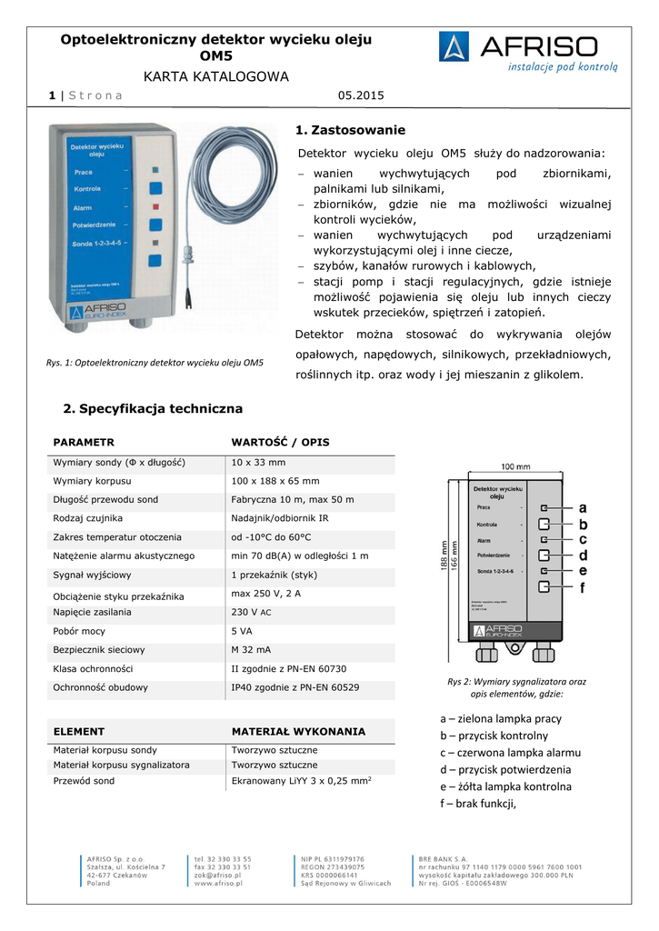 Optoelektroniczny detektor wycieku oleju OM5 KARTA KATALOGOWA 1|Strona 05.2015 1. Zastosowanie Detektor wycieku oleju OM5 służy do nadzorowania: wanien wychwytujących pod zbiornikami, palnikami lub silnikami, zbiorników, gdzie nie ma możliwości wizualnej kontroli wycieków, wanien wychwytujących pod urządzeniami wykorzystującymi olej i inne ciecze, szybów, kanałów rurowych i kablowych, stacji pomp i stacji regulacyjnych, gdzie istnieje możliwość pojawienia się oleju lub innych cieczy wskutek przecieków, spiętrzeń i zatopień. Detektor Rys. 1: Optoelektroniczny detektor wycieku oleju OM5 można stosować do wykrywania olejów opałowych, napędowych, silnikowych, przekładniowych, roślinnych itp. oraz wody i jej mieszanin z glikolem. 2. Specyfikacja techniczna PARAMETR WARTOŚĆ / OPIS Wymiary sondy (Φ x długość) 10 x 33 mm Wymiary korpusu 100 x 188 x 65 mm Długość przewodu sond Fabryczna 10 m, max 50 m Rodzaj czujnika Nadajnik/odbiornik IR Zakres temperatur otoczenia od -10°C do 60°C Natężenie alarmu akustycznego min 70 dB(A) w odległości 1 m Sygnał wyjściowy 1 przekaźnik (styk) Obciążenie styku przekaźnika max 250 V, 2 A Napięcie zasilania 230 V AC Pobór mocy 5 VA Bezpiecznik sieciowy M 32 mA Klasa ochronności II zgodnie z PN-EN 60730 Ochronność obudowy IP40 zgodnie z PN-EN 60529 ELEMENT MATERIAŁ WYKONANIA Materiał korpusu sondy Tworzywo sztuczne Materiał korpusu sygnalizatora Tworzywo sztuczne Przewód sond Ekranowany LiYY 3 x 0,25 mm2 Rys 2: Wymiary sygnalizatora oraz opis elementów, gdzie: a – zielona lampka pracy b – przycisk kontrolny c – czerwona lampka alarmu d – przycisk potwierdzenia e – żółta lampka kontrolna f – brak funkcji, Optoelektroniczny detektor wycieku oleju OM5 KARTA KATALOGOWA 2|Strona 05.2015 3. Budowa oraz zasada działania detektora wycieku oleju OM5 Detektor wycieków oleju OM5 składa się z jednego sygnalizatora (Rys. 2) i maksymalnie pięciu sond – Art.-Nr 44 503 (Rys. 3). Sygnalizator i sondy połączone są za pomocą trzyżyłowego przewodu. 1 – przewód trzyżyłowy 2 – nadajnik IR 3 – odbiornik IR Rys. 3: Elementy sondy Sonda zawiera nadajnik i odbiornik promieni podczerwonych, które umieszczone są naprzeciwko siebie. Sonda rozpoznaje czy pomiędzy czujnikami znajduje się powietrze czy ciecz. Jeśli sonda zostanie zanurzona w cieczy, przepływ wiązki podczerwieni zostaje zakłócony, następuje optyczna i akustyczna sygnalizacja wycieku. W czasie trwania alarmu sygnał akustyczny może zostać wyciszony, poprzez naciśnięcie przycisku „Potwierdzenie” (Rys. 2). Alarm uruchamiany jest w momencie wykrycia warstwy cieczy o grubości około 4 mm. O gotowości urządzenia do pracy informuje zielona lampka na obudowie sygnalizatora (Rys. 2). Wskazanie, która sonda została zalana następuje przez żółtą lampkę (Rys. 2) poprzez odpowiednią sekwencję błysków, powtarzaną co około 3 sekundy. 4. Przykładowy schemat aplikacyjny Rys. 4: Schemat aplikacyjny 5. Dopuszczenia, certyfikaty i deklaracje zgodności Detektor wycieku oleju OM 5 jest zgodny z dyrektywą dotyczącą kompatybilności elektromagnetycznej EMC (2004/108/WE) oraz dyrektywą dotyczącą sprzętu elektrycznego niskiego napięcia LVD (2006/95/WE). Posiada także dopuszczenie numer Z-65.40-214 wydane przez Niemiecki Instytut Techniki Budowlanej.