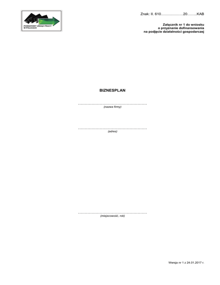 Znak: II. 610………………20……..KAB Załącznik nr 1 do wniosku o przyznanie dofinansowania na podjęcie działalności gospodarczej BIZNESPLAN …………………………………………… (nazwa firmy) …………………………………………… (adres) …………………………………………… (miejscowość, rok) Wersja nr 1 z 24.01.2017 r. Spis treści 1. Opis przedsięwzięcia 1.1 Nazwa przedsiębiorstwa 1.2 Adres, siedziba firmy 1.3 Lokalizacja działalności gospodarczej 1.4 Planowany termin rozpoczęcia działalności gospodarczej 1.5 Charakterystyka działalności gospodarczej 1.6 PKD 2. Analiza rynku, branży i konkurencji 2.1 Lokalizacja rynku 2.2 Branża 2.3 Konkurencja 2.4 Segmentacja 2.5 Innowacyjność rynkowa pomysłu 2.6 Analiza wykonalności pomysłu 3. Analiza marketingowa 3.1 Strategia produktu 3.2 Strategia cenowa 3.3 Strategia promocyjna 3.4 Strategia dystrybucji 4. Analiza zaplecza technicznego 4.1 Opis posiadanych zasobów własnych (sprzętu, środków transport, towaru, środków finansowych itp.) niezbędnych do prowadzenia planowanej działalności 4.2 Status prawny i opis lokalu lub pomieszczeń, w których prowadzona będzie działalność 4.3 Opis przyszłych źródeł zaopatrzenia firmy 4.4 Dodatkowe wymagania prawne i administracyjne związane z zainicjowaniem działalności gospodarczej 4.5 Korzystanie z usług podmiotów zewnętrznych 4.6 Czy planowana działalność gospodarcza zakłada współpracę na zasadach franczyzy? 5. Potencjał i wykształcenie Wnioskodawcy 6. Analiza SWOT 7. Analiza finansowa 7.1 Miesięczna kalkulacja przychodów i kosztów uzyskanych ze sprzedaży usług, towarów, produktów 7.2 Rachunek wyników na pierwsze 12 miesięcy działalności gospodarczej 8. Charakterystyka planowanych zakupów 8.1 Szczegółowa specyfikacja i harmonogram zakupów w okresie od dnia zawarcia umowy z PUP w Policach do 30. dnia od daty podjęcia działalności gospodarczej 8.2 Uzasadnienie dla planowanych zakupów 2 1. Opis przedsięwzięcia 1.1 Nazwa planowanej działalności gospodarczej 1.2 Adres, siedziba firmy 1.3 Lokalizacja działalności gospodarczej (teren działania) 1.4 Planowany termin rozpoczęcia działalności gospodarczej 1.5 Charakterystyka działalności gospodarczej Krótka charakterystyka, (przedmiot i zakres) 1.6 Numer i charakterystyka PKD planowanej działalności gospodarczej (według Polskiej Klasyfikacji Działalności zgodnie z Rozporządzeniem Rady Ministrów z dnia 24.12.2007r. ( Dz. U. Nr 251 poz.1885 z późn. zm.) 3 2. Analiza rynku, branży i konkurencji 2.1 Lokalizacja rynku Na jakim terenie działać będzie firma, jakie są cechy charakterystyczne danej miejscowości, jej populacja, znaczące ośrodki handlowe, pracodawcy, istotny jest opis rynku pod kątem czynników mogących korzystnie wpłynąć na planowane przedsięwzięcie. 2.2 Branża Jakie są tendencje rozwojowe wybranej branży, przewidywania dotyczące jej przyszłości (czy branża znajduje się w fazie wzrostu, dojrzałości czy schyłkowej). 2.3 Konkurencja Identyfikacja przedsiębiorstw działających w branży oraz głównych konkurentów (kto obecnie zajmuje wiodące miejsce na tym rynku, jakie są silne i słabe strony firmy konkurencyjnej, ile jest firm na rynku o identycznym lub zbliżonym profilu działalności?). 4 2.4 Segmentacja Do kogo będzie adresowana działalność firmy (kto będzie kupował jej produkty – profil klienta: jego wiek, płeć, zainteresowania, dochody, na jak dużą bazę klientów może liczyć na danym terenie – jakie jest miejscowe zapotrzebowanie na produkt). Analiza klientów powinna opierać się na tzw. Kliencie typowym, a więc dotyczyć pewnej grupy klientów o takich samych lub zbliżonych cechach(wiek, płeć, zainteresowania, dochody, styl życia itp.). Klientów należy podzielić na osoby fizyczne oraz podmioty gospodarcze, a jeśli oferta dotyczy obu grup dokonać odrębnej oceny. 2.5 Innowacyjność rynkowa pomysłu W jakim zakresie planowana działalność wprowadza innowacyjne rozwiązania, czym różni się od istniejącej konkurencji. 2.6 Analiza wykonalności pomysłu Identyfikacja ograniczeń i barier związanych z realizacją przedsięwzięcia. Należy wskazać i opisać czynniki mogące negatywnie wpłynąć na sukces przedsięwzięcia oraz wskazać sposoby ich ograniczenia. 5 3. Analiza marketingowa 3.1 Strategia produktu Opis produktu znajdującego się w ofercie firmy, jego modeli, sposobu wykonania, wyglądu, opakowania, jakości, gwarancji, jakie zostaną udzielone klientowi, usług dodatkowych. Opis wykonany zostać może w zestawieniu z produktami konkurencji, przy czym nacisk położony powinien zostać na te punkty, w których produkt firmy jest lepszy od konkurencyjnych (potencjalne źródło sukcesu) lub też jest od nich gorszy (cechy mogące wpłynąć na niepowodzenie i które powinny zostać zniwelowane lub całkiem wyeliminowane). Należy zaznaczyć, że pojęcie ,,produkt” w ujęciu marketingowym nie oznacza efektu procesu produkcyjnego ale ma znaczenie o wiele szersze. Produkt obejmuje bowiem całokształt oferty rynkowej firmy, a więc wszystko to co oferuje ona do sprzedaży. W tym znaczeniu produktem jest np. usługa oferowana przez firmę usługową, towar handlowy oferowany przez firmę handlową jak również wyrób gotowy sprzedawany przez firmę handlową jak również wyrób gotowy sprzedawany przez firmę produkcyjną. 3.2 Strategia cenowa W jaki sposób ustalane będą ceny, jaka będzie relacja wobec cen na podobne produkty firm konkurencyjnych; czy zostaną przewidziane rabaty (jeśli tak, to co będzie decydowało przy udzielaniu rabatów: typ klienta, wartość zamówienia, długość współpracy z odbiorcą i inne). 6 3.3 Strategia promocyjna W jaki sposób klienci informowani zostaną o produktach firmy, do kogo będzie skierowana promocja, ile będzie kosztowała, jak długo będzie trwać, co będzie podkreślane w rekl