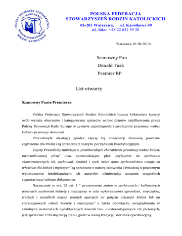 POLSKA FEDERACJA STOWARZYSZEŃ RODZIN KATOLICKICH 01-203 Warszawa, ul. Karolkowa 49 tel./faks: +48 22 631 59 38 Warszawa, 01.06.2012r. Szanowny Pan Donald Tusk Premier RP List otwarty Szanowny Panie Premierze Polska Federacja Stowarzyszeń Rodzin Katolickich licząca kilkanaście tysięcy osób wyraża oburzenie i kategoryczny sprzeciw wobec planów ratyfikowania przez Polskę Konwencji Rady Europy w sprawie zapobiegania i zwalczania przemocy wobec kobiet i przemocy domowej. Przeniknięte ideologią gender zapisy tej Konwencji stanowią poważne zagrożenie dla Polski i są sprzeczne z naszym porządkiem konstytucyjnym. Zapisy Preambuły mówiące o „strukturalnym charakterze przemocy wobec kobiet, uwarunkowanej płcią” oraz sprowadzające płeć „wyłącznie do społecznie skonstruowanych ról, zachowań, działań i cech, które dane społeczeństwo uznaje za właściwe dla kobiet i mężczyzn” są sprzeczne z naturą człowieka i świadczą o poważnym wynaturzeniu intelektualnym ich autorów, ośmieszając zarazem wszystkich sygnatariuszy takiego dokumentu. Narzucanie w art. 12 ust. 1 ” promowania zmian w społecznych i kulturowych wzorcach zachowań kobiety i mężczyzny w celu wykorzenienia uprzedzeń, zwyczajów, tradycji i wszelkich innych praktyk opartych na pojęciu niższości kobiet lub na stereotypowych rolach kobiety i mężczyzny” a także obowiązku uwzględnienia w szkolnych materiałach dydaktycznych kwestii tzw. niestereotypowych ról płciowych, jest sprzeczne z Polską Racją Stanu, godzi w naszą tradycję i dorobek cywilizacyjny, wymusza uwzględnianie i stosowanie postulatów, krzykliwej i ciągle będącej w mniejszości, grupy orędowników ideologii gender. Wprowadza „od kuchni” ideologię gender, na którą nie ma społecznego przyzwolenia, a która jest krzykliwa za sprawą wsparcia jej orędowników przez poprawne politycznie media i swoiste libertyńskie „autorytety”. Skandaliczny jest również zapis art. 12 ust 5, w którym zapisano, iż „strony czuwają nad tym, by kultura, zwyczaj, religia, tradycja lub tzw. ‘honor’ nie były wykorzystywane jako usprawiedliwienie dla żadnych ataków przemocy objętych zakresem niniejszej Konwencji”. Ten zapis jest sprzeczny z podstawowymi prawami demokracji i stanowi próbę narzucenia rozwiązań charakterystycznych dla systemów totalitarnych i dyktatorskich. Na to nie ma zgody! Napór fali „równouprawnienia płci” i „ideologii gender”, dążących do wyeliminowania różnic miedzy kobietą i mężczyzną za pomocą przymusowej inżynierii społecznej nakazanej przez państwo (!) jest per se przyczyną narastania przemocy wobec kobiet, a nie jej ograniczaniem (choćby przypomnieć plakaty o przesolonej zupie). Dla każdego normalnego mężczyzny hańbą jest stosowanie przemocy wobec kobiet, a jednym z powodów nienormalnych zachowań mężczyzn jest wymuszanie innych niż naturalne ról i deprecjonowanie naturalnych ról mężczyzny. Jedynym sposobem na ograniczenie przemocy wobec kobiet jest wsparcie tradycyjnych wartości i wychowania w tym zakresie. Właśnie wśród tych wartości na czołowym miejscu znajduje się szacunek dla kobiet i bezwzględny nakaz ich ochrony. dr n. med. Kazimierz Kapera prezydent Polskiej Federacji Stowarzyszeń Rodzin Katolickich
