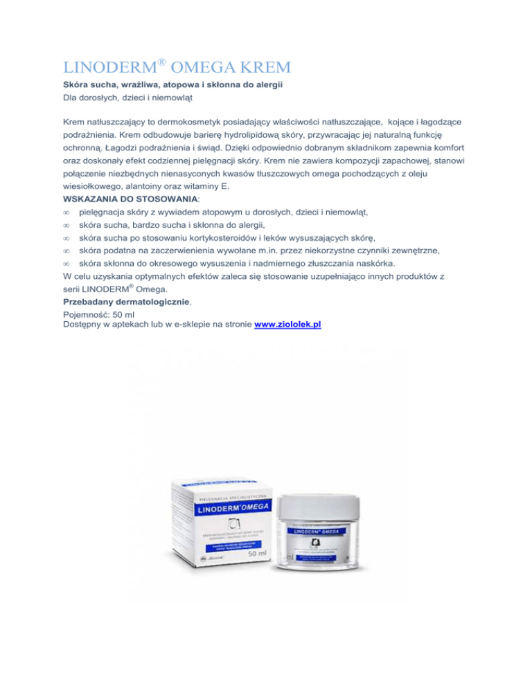 LINODERM® OMEGA KREM Skóra sucha, wrażliwa, atopowa i skłonna do alergii Dla dorosłych, dzieci i niemowląt Krem natłuszczający to dermokosmetyk posiadający właściwości natłuszczające, kojące i łagodzące podrażnienia. Krem odbudowuje barierę hydrolipidową skóry, przywracając jej naturalną funkcję ochronną. Łagodzi podrażnienia i świąd. Dzięki odpowiednio dobranym składnikom zapewnia komfort oraz doskonały efekt codziennej pielęgnacji skóry. Krem nie zawiera kompozycji zapachowej, stanowi połączenie niezbędnych nienasyconych kwasów tłuszczowych omega pochodzących z oleju wiesiołkowego, alantoiny oraz witaminy E. WSKAZANIA DO STOSOWANIA: • pielęgnacja skóry z wywiadem atopowym u dorosłych, dzieci i niemowląt, • skóra sucha, bardzo sucha i skłonna do alergii, • skóra sucha po stosowaniu kortykosteroidów i leków wysuszających skórę, • skóra podatna na zaczerwienienia wywołane m.in. przez niekorzystne czynniki zewnętrzne, • skóra skłonna do okresowego wysuszenia i nadmiernego złuszczania naskórka. W celu uzyskania optymalnych efektów zaleca się stosowanie uzupełniająco innych produktów z ® serii LINODERM Omega. Przebadany dermatologicznie. Pojemność: 50 ml Dostępny w aptekach lub w e-sklepie na stronie www.ziololek.pl