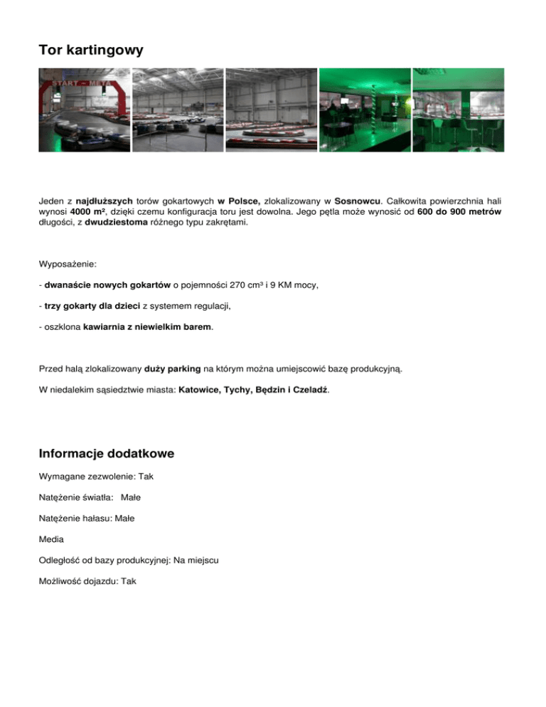 Tor kartingowy Jeden z najdłuższych torów gokartowych w Polsce, zlokalizowany w Sosnowcu. Całkowita powierzchnia hali wynosi 4000 m², dzięki czemu konfiguracja toru jest dowolna. Jego pętla może wynosić od 600 do 900 metrów długości, z dwudziestoma różnego typu zakrętami. Wyposażenie: - dwanaście nowych gokartów o pojemności 270 cm³ i 9 KM mocy, - trzy gokarty dla dzieci z systemem regulacji, - oszklona kawiarnia z niewielkim barem. Przed halą zlokalizowany duży parking na którym można umiejscowić bazę produkcyjną. W niedalekim sąsiedztwie miasta: Katowice, Tychy, Będzin i Czeladź. Informacje dodatkowe Wymagane zezwolenie: Tak Natężenie światła: Małe Natężenie hałasu: Małe Media Odległość od bazy produkcyjnej: Na miejscu Możliwość dojazdu: Tak Powered by TCPDF (www.tcpdf.org)