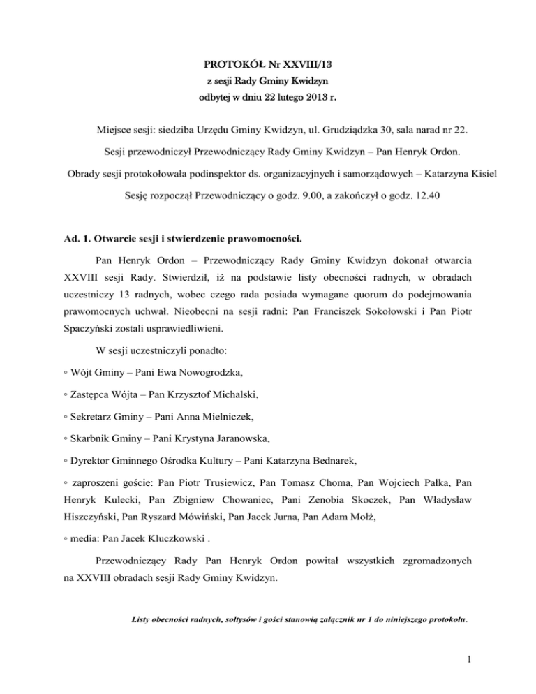 PROTOKÓŁ Nr XXVIII/13 z sesji Rady Gminy Kwidzyn odbytej w dniu 22 lutego 2013 r. Miejsce sesji: siedziba Urzędu Gminy Kwidzyn, ul. Grudziądzka 30, sala narad nr 22. Sesji przewodniczył Przewodniczący Rady Gminy Kwidzyn – Pan Henryk Ordon. Obrady sesji protokołowała podinspektor ds. organizacyjnych i samorządowych – Katarzyna Kisiel Sesję rozpoczął Przewodniczący o godz. 9.00, a zakończył o godz. 12.40 Ad. 1. Otwarcie sesji i stwierdzenie prawomocności. Pan Henryk Ordon – Przewodniczący Rady Gminy Kwidzyn dokonał otwarcia XXVIII sesji Rady. Stwierdził, iż na podstawie listy obecności radnych, w obradach uczestniczy 13 radnych, wobec czego rada posiada wymagane quorum do podejmowania prawomocnych uchwał. Nieobecni na sesji radni: Pan Franciszek Sokołowski i Pan Piotr Spaczyński zostali usprawiedliwieni. W sesji uczestniczyli ponadto: ◦ Wójt Gminy – Pani Ewa Nowogrodzka, ◦ Zastępca Wójta – Pan Krzysztof Michalski, ◦ Sekretarz Gminy – Pani Anna Mielniczek, ◦ Skarbnik Gminy – Pani Krystyna Jaranowska, ◦ Dyrektor Gminnego Ośrodka Kultury – Pani Katarzyna Bednarek, ◦ zaproszeni goście: Pan Piotr Trusiewicz, Pan Tomasz Choma, Pan Wojciech Pałka, Pan Henryk Kulecki, Pan Zbigniew Chowaniec, Pani Zenobia Skoczek, Pan Władysław Hiszczyński, Pan Ryszard Mówiński, Pan Jacek Jurna, Pan Adam Mołż, ◦ media: Pan Jacek Kluczkowski . Przewodniczący Rady Pan Henryk Ordon powitał wszystkich zgromadzonych na XXVIII obradach sesji Rady Gminy Kwidzyn. Listy obecności radnych, sołtysów i gości stanowią załącznik nr 1 do niniejszego protokołu. 1 Ad. 2. Przedłożenie porządku sesji do zatwierdzenia. Przewodniczący Rady odczytał proponowany porządek sesji, który radni i sołtysi otrzymali wraz z zawiadomieniami o zwołaniu sesji. Nie zgłoszono żadnych wniosków, w związku, z czym poddał pod głosowanie proponowany porządek sesji, który został przyjęty jednogłośnie, w następującym brzmieniu: 1. Otwarcie sesji i stwierdzenie prawomocności. 2. Przedłożenie porządku obrad do zatwierdzenia. 3. Przyjęcie protokołu z XXVII sesji Rady Gminy. 4. Interpelacje i zapytania. 5. Sprawozdanie Wójta z działalności między sesjami. 6. Wystąpienia zaproszonych gości. 7. Podjęcie uchwał: 1) zmieniająca uchwałę w sprawie uchwalenia budżetu Gminy Kwidzyn na 2013 rok, 2) zmieniająca uchwałę w sprawie przyjęcia wieloletniej prognozy finansowej Gminy Kwidzyn, 3) w sprawie zaciągnięcia długoterminowego kredytu na pokrycie deficytu budżetowego w roku 2013, 4) w sprawie funduszu sołeckiego na rok budżetowy 2014, 5) w sprawie zmian w Statucie Gminnego Ośrodka Kultury w Kwidzynie. 6) w sprawie przyjęcia sprawozdań z działalności komisji stałych Rady Gminy Kwidzyn za rok 2012, 8. Odpowiedzi na interpelacje i zapytania z XXVII sesji Rady Gminy. 9. Wolne wnioski. 10. Zamknięcie obrad sesji. Ad. 3. Przyjęcie protokołu z XXVII sesji Rady Gminy. Przewodniczący oświadczył, iż protokół z XXVII sesji był wyłożony do wglądu w budynku Urzędu Gminy, w biurze rady (pokój nr 19). Zwrócił się z pytaniem do radnych, czy wnoszą do protokołu uwagi. W związku z brakiem uwag uznał, iż protokół z XXVII sesji RG został przyjęty. 2 Ad. 4. Interpelacje i zapytania. Nie podjęto. Ad. 5. Sprawozdanie Wójta z działalności między sesjami. Pani Wójt ustnie przedłożyła sprawozdanie z działalności za okres od 26 stycznia 2013r. do 21 lutego 2013r. Poinformowała o spotkaniach i wydarzeniach, które odbyły się w okresie między sesyjnym. Dnia 4 lutego 2013 roku Pani Wójt uczestniczyła w spotkaniu z Wicemarszałkiem Ryszardem Świlskim w gminie Sadlinki. Prowadzono wówczas rozmowy na temat drogi wojewódzkiej DW521, ciągów pieszo – rowerowych oraz włączeniu dużej obwodnicy do projektu. Następnie w dniu 7.02.2013r. odbyła się narada z sołtysami podczas której rozdano nakazy płatnicze oraz przekazano deklaracje o wysokości opłaty za gospodarowanie odpadami komunalnymi do rozdania wszystkim mieszkańcom w sołectwach. Z kolei 8 lutego b.r w Bronisławowie odbyło się podsumowanie gali „supersołtys”. Pani Wójt poinformowała, że sołtys sołectwa Tychnowy Pan Wiesław Namiak zajął II miejsce w powiecie. Następnie podziękowała sołtysowi za zaangażowanie w realizacji swoich obowiązków i pogratulowała. Dnia 9 lutego Pani Wójt wraz z Przewodniczącym Rady uczestniczyła w Walnym Zebraniu Ochotniczych Straży Pożarnych w Pastwie. Pani Ewa Nowogrodzka przekazała, że 11.02.2013r. trwały eliminacje do Wojewódzkiego Turnieju Gospodyń Wiejskich i podzieliła się informacją, że Koło Gospodyń Wiejskich z Tychnów otrzymało nagrodę Grand Prix. Tego samego dnia odbyło się także spotkanie Ochotniczej Straży Pożarnej w Podzamczu. Kolejne spotkanie miało miejsce 12.02.2013r. – Pani Wójt uczestniczyła w walnym zgromadzeniu udziałowców w Kwidzyńskim Parku Przemysłowo – Technologicznym w Górkach. Dnia 13 lutego 2013 roku odbyło się wspólne posiedzenie komisji stałych Rady Gminy, na którym opiniowano projekty uchwał, a także przedstawiona została bieżąca sytuacja finansowa Gminnego Ośrodka Pomocy Społecznej. Następnie dnia 14 lutego 2013r. odbyło się spotkanie starosty z sołtysami, na którym omawiano program naprawy dróg powiatowych. Pani Wójt uczestniczyła także w walnym zgromadzeniu Powislańskiej Lokalnej Grupy Działania dnia 21.02.2013 roku. Ad. 6. Wystąpienia zaproszonych gości. Pan Piotr Trusiewicz – Komendant Powiatowy Policji w Kwidzynie. Pan Trusiewicz przekazał informację na temat utrzymania porządku i bezpieczeństwa publicznego na terenie gminy Kwidzyn w roku 2012. Przedstawił analizę wykrywalności 3 przestępczości kryminalnej, przemocy domowej, a także przestępczość nieletnich w powiecie kwidzyńskim. Komendant przekazał również informację na temat bezpieczeństwa w ruchu drogowym, ilość wypadków i kolizji odnotow