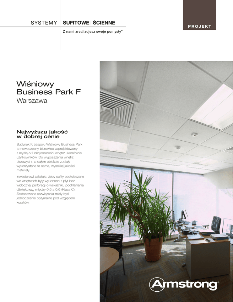 PROJEKT Wiśniowy Business Park F Warszawa Najwyższa jakość w dobrej cenie Budynek F, zespołu Wiśniowy Business Park to nowoczesny biurowiec zaprojektowany z myślą o funkcjonalności wnętrz i komforcie użytkowników. Do wyposażenia wnętrz biurowych na całym obiekcie zostały wykorzystane te same, wysokiej jakości materiały. Inwestorowi zależało, żeby sufity podwieszane we wnętrzach były wykonane z płyt bez widocznej perforacji o wskaźniku pochłaniania dźwięku αw między 0,5 a 0,6 (Klasa C). Zastosowane rozwiązania miały być jednocześnie optymalne pod względem kosztów. Więcej znajdziesz w Galerii Projektów Właściciel Knight Frank sp.z o.o. Architekt AukettFitzoroyRobinson sp.z o.o. Generalny Wykonawca Hochtieff Polska Sp.z o.o. Firma wykonawcza FHU TEMEX, INTERESTA Powierzchnia 16300 m2 Produkt CIRRUS Tegular & MicroLook BE Armstrong Building Products BV Sp. z o.o. Oddział w Polsce ul. Domaniewska 37 02-672 Warszawa Polska Tel. (+48) 22 337 86 10/11 Fax (+48) 22 337 86 12 [email protected] www.armstrong.pl/sufity www.armstrong.eu 09/2011 - PX1112 © Grigori Rassinier - VEL VET ex pér ien c e - Armstrong Building Products - RCS Besançon B 784 131 575 Zaproponowane zostały modułowe sufity podwieszane z płyt CIRRUS o unikalnej fakturze i klasycznym formacie 600 x 600mm. Płyty CIRRUS posiadają delikatną, prawie gładką powierzchnię i zapewniają odpowiednie właściwości akustyczne. To produkt najlepiej spełniający wymaganie inwestora - dobra jakość w dobrej cenie.