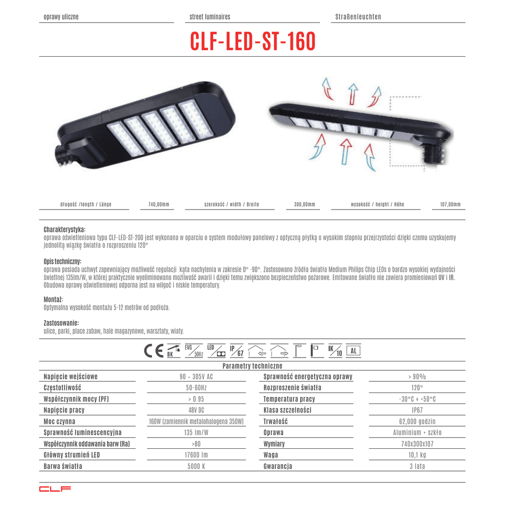 oprawy uliczne street luminaires Straßenleuchten CLF-LED-ST-160 długość /length / Länge 740,00mm szerokość / width / Breite 300,00mm wysokość / height / Höhe 107,00mm Charakterystyka: oprawa oświetleniowa typu CLF-LED-ST-200 jest wykonana w oparciu o system modułowy panelowy z optyczną płytką o wysokim stopniu przejrzystości dzięki czemu uzyskujemy jednolitą wiązkę światła o rozproszeniu 120° Opis techniczny: oprawa posiada uchwyt zapewniający możliwość regulacji kąta nachylenia w zakresie 0° -90°. Zastosowano źródła światła Medium Philips Chip LEDs o bardzo wysokiej wydajności świetlnej 135lm/W, w której praktycznie wyeliminowano możliwość awarii i dzięki temu zwiększono bezpieczeństwo pożarowe. Emitowane światło nie zawiera promieniowań UV i IR. Obudowa oprawy oświetleniowej odporna jest na wilgoć i niskie temperatury. Montaż: Optymalna wysokość montażu 5-12 metrów od podłoża. Zastosowanie: ulice, parki, place zabaw, hale magazynowe, warsztaty, wiaty. Parametry techniczne Napięcie wejściowe Częstotliwość Współczynnik mocy (PF) Napięcie pracy Moc czynna Sprawność luminescencyjna Współczynnik oddawania barw (Ra) Główny strumień LED Barwa światła Clf 90 – 305V AC 50-60Hz Sprawność energetyczna oprawy Rozproszenie światła > 0.95 Temperatura pracy 48V DC Klasa szczelności 160W (zamiennik metalohalogena 350W) Trwałość > 90% 120° -30°C ÷ +50°C IP67 62,000 godzin 135 lm/W Oprawa Aluminium + szkło >80 Wymiary 740x300x107 17600 lm 5000 K Waga 10,1 kg Gwarancja 3 lata oprawy przemysłowe industrial fittings industriebeleuchtung CLF-LED-ST-160 follow the light CLF
