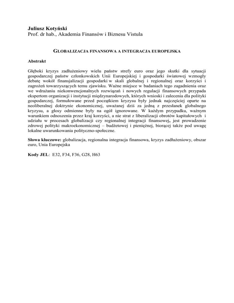 Juliusz Kotyński Prof. dr hab., Akademia Finansów i Biznesu Vistula GLOBALIZACJA FINANSOWA A INTEGRACJA EUROPEJSKA Abstrakt Głęboki kryzys zadłużeniowy wielu państw strefy euro oraz jego skutki dla sytuacji gospodarczej państw członkowskich Unii Europejskiej i gospodarki światowej wzmogły debatę wokół finansjalizacji gospodarki w skali globalnej i regionalnej oraz korzyści i zagrożeń towarzyszących temu zjawisku. Ważne miejsce w badaniach tego zagadnienia oraz we wdrażaniu niekonwencjonalnych rozwiązań i nowych regulacji finansowych przypada ekspertom organizacji i instytucji międzynarodowych, których wnioski i zalecenia dla polityki gospodarczej, formułowane przed początkiem kryzysu były jednak najczęściej oparte na neoliberalnej doktrynie ekonomicznej, uważanej dziś za jedną z przesłanek globalnego kryzysu, a głosy odmienne były na ogół ignorowane. W każdym przypadku, ważnym warunkiem odnoszenia przez kraj korzyści, a nie strat z liberalizacji obrotów kapitałowych i udziału w procesach globalizacji czy regionalnej integracji finansowej, jest prowadzenie zdrowej polityki makroekonomicznej – budżetowej i pieniężnej, biorącej także pod uwagę lokalne uwarunkowania polityczno-społeczne. Słowa kluczowe: globalizacja, regionalna integracja finansowa, kryzys zadłużeniowy, obszar euro, Unia Europejska Kody JEL: E32, F34, F36, G28, H63