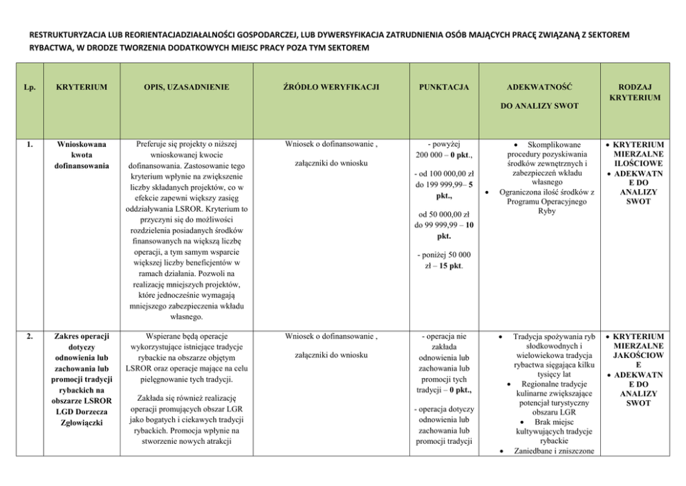 RESTRUKTURYZACJA LUB REORIENTACJADZIAŁALNOŚCI GOSPODARCZEJ, LUB DYWERSYFIKACJA ZATRUDNIENIA OSÓB MAJĄCYCH PRACĘ ZWIĄZANĄ Z SEKTOREM RYBACTWA, W DRODZE TWORZENIA DODATKOWYCH MIEJSC PRACY POZA TYM SEKTOREM Lp. KRYTERIUM OPIS, UZASADNIENIE ŹRÓDŁO WERYFIKACJI ADEKWATNOŚĆ PUNKTACJA RODZAJ KRYTERIUM DO ANALIZY SWOT 1. 2. Wnioskowana kwota dofinansowania Zakres operacji dotyczy odnowienia lub zachowania lub promocji tradycji rybackich na obszarze LSROR LGD Dorzecza Zgłowiączki Preferuje się projekty o niższej wnioskowanej kwocie dofinansowania. Zastosowanie tego kryterium wpłynie na zwiększenie liczby składanych projektów, co w efekcie zapewni większy zasięg oddziaływania LSROR. Kryterium to przyczyni się do możliwości rozdzielenia posiadanych środków finansowanych na większą liczbę operacji, a tym samym wsparcie większej liczby beneficjentów w ramach działania. Pozwoli na realizację mniejszych projektów, które jednocześnie wymagają mniejszego zabezpieczenia wkładu własnego. Wniosek o dofinansowanie , Wspierane będą operacje wykorzystujące istniejące tradycje rybackie na obszarze objętym LSROR oraz operacje mające na celu pielęgnowanie tych tradycji. Wniosek o dofinansowanie , Zakłada się również realizację operacji promujących obszar LGR jako bogatych i ciekawych tradycji rybackich. Promocja wpłynie na stworzenie nowych atrakcji załączniki do wniosku - powyżej 200 000 – 0 pkt., - od 100 000,00 zł do 199 999,99– 5 pkt., od 50 000,00 zł do 99 999,99 – 10 pkt. Skomplikowane procedury pozyskiwania środków zewnętrznych i zabezpieczeń wkładu własnego Ograniczona ilość środków z Programu Operacyjnego Ryby KRYTERIUM MIERZALNE ILOŚCIOWE ADEKWATN E DO ANALIZY SWOT KRYTERIUM MIERZALNE JAKOŚCIOW E ADEKWATN E DO ANALIZY SWOT - poniżej 50 000 zł – 15 pkt. załączniki do wniosku - operacja nie zakłada odnowienia lub zachowania lub promocji tych tradycji – 0 pkt., - operacja dotyczy odnowienia lub zachowania lub promocji tradycji Tradycja spożywania ryb słodkowodnych i wielowiekowa tradycja rybactwa sięgająca kilku tysięcy lat Regionalne tradycje kulinarne zwiększające potencjał turystyczny obszaru LGR Brak miejsc kultywujących tradycje rybackie Zaniedbane i zniszczone rybackich – 5 pkt. turystycznych i kulturowych, zwiększenie spożycia ryb, a także wyrobienie dobrych nawyków proekologicznych wśród mieszkańców i turystów. Przykładowe typy operacji: tworzenie, modernizacja, wyposażenie skansenów, muzeów; utworzenie tematycznej „Wioski Rybackiej”; warsztaty kulinarne promujące spożycie ryb; wydawanie publikacji, folderów promujących tradycje rybackie obszaru objętego LSROR, rozwijanie działalności gospodarczej związanej z historią i tradycjami rybackimi, np. lokale użytkowe stylizowane na wzór nawiązujący do tradycji rybackich, etc. 3. Operacja ma charakter innowacyjny Wspierane będą operacje przyczyniające się do wzrostu konkurencyjności obszaru objętego LSROR dzięki wprowadzeniu lub promowaniu innowacyjności technologicznej, procesowej (współpraca między podmiotami lokalnymi), edukacyjnej. Kryterium będzie spełnione, jeśli wnioskodawca Wniosek o dofinansowanie , załączniki do wniosku - brak innowacyjności – 0 pkt., - operacja innowacyjna w skali wnioskodawcy (autorski pomysł zabytki regionu. Moda na ekologiczny styl życia, w tym na produkty pochodzące z ekologicznych upraw oraz produkty tradycyjne jako szansa rozwoju ekologicznego rolnictwa na terenie LGR Promocja regionu, produktów lokalnych, usług i walorów przyrodniczokulturowych związanych z rybactwem i wędkarstwem. projekt utworzenia tematycznej „Wioski Rybackiej” szansą na wykreowanie silnego markowego produktu turystycznego w skali regionu, kraju i nie tylko Odchodzenie społeczeństwa od kultywowania tradycji Kujaw – zatracenie dorobku kulturalnego Słaby system promocji ryb i produktów rybnych Bogata historia ziem objętych LSROR od czasów Neolitu (4000 l.p.n.e) do teraźniejszości Niski poziom innowacyjnych rozwiązań Innowacyjny projekt utworzenia tematycznej „Wioski Rybackiej” szansą na wykreowanie silnego markowego produktu turystycznego w skali regionu, kraju i nie tylko Wzrastające zainteresowanie KRYTERIUM MIERZALNE JAKOŚCIOW E ADEKWAT NE DO ANALIZY SWOT zastosuje rozwiązania i pomysły dotychczas nie stosowane na obszarze LGR, gminy lub innowacyjne dla danego wnioskodawcy, np. jako jego pomysł autorski. Typy operacji uznawane za innowacyjne: rozwój nowych funkcji obszaru, wykorzystanie nowoczesnych technik teleinformatycznych, nowy sposób angażowania, integracji społeczności lokalnych, nowatorski, kreatywny sposób edukacji, nowatorski sposób wykorzystania lokalnych zasobów, realizacja działań proekologicznych itp. 4. 5. wnioskodawcy) – 2 pkt., - operacja innowacyjna w skali gminy, na terenie której będzie realizowana – 5 pkt., - operacja innowacyjna na terenie obszaru objętego LSROR – 10 pkt, Wnioskodawca nie ma doświadczenia w realizacji projektów ze środków UE Preferuje się wnioskodawców, którzy nie posiadają doświadczenie w realizacji inwestycji projektów dofinansowanych ze środków UE, tzn. zrealizowali i rozliczyli inwestycje. Zastosowanie tego kryterium przyczyni się do pobudzenia i zachęcenia nowych podmiotów do realizacji inwestycji. Kryterium to będzie zapobiegało również udzielaniu dofinansowania tym samym beneficjentom. Oświadczenie wnioskodawcy o zrealizowaniu i rozliczeniu inwestycji – wzór określony w Rozdziale 8 Opis procedur oceny operacji przez Komitet. Wnioskodawca spełnia warunki, o których mowa w §2, ust. 1 rozporządzenia Ministra Rolnictwa i Rozwoju Wsi z dnia 29 września Wspierane będą operacje składane przez podmioty uprawnione do rybactwa, określone w §2, ust. 1 rozporządzenia Ministra Rolnictwa i Rozwoju Wsi z dnia 29 września 2009r. lub wnioskodawca jest zatrudniony przez taki podmiot. Wniosek