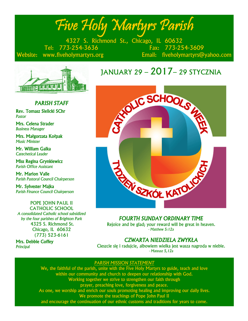 Five Holy Martyrs Parish 4327 S. Richmond St., Chicago, IL 60632 Tel: 773-254-3636 Fax: 773-254-3609 Website: www.fiveholymartyrs.org Email: [email protected] JANUARY 29 – 2017– 29 STYCZNIA PARISH STAFF Rev. Tomasz Sielicki SChr Pastor Mrs. Celena Strader Business Manager Mrs. Małgorzata Kołpak Music Minister Mr. William Galka Catechetical Leader Miss Regina Grynkiewicz Parish Office Assistant Mr. Marion Valle Parish Pastoral Council Chairperson Mr. Sylvester Majka Parish Finance Council Chairperson POPE JOHN PAUL II CATHOLIC SCHOOL A consolidated Catholic school subsidized by the four parishes of Brighton Park 4325 S. Richmond St. Chicago, IL 60632 (773) 523-6161 Mrs. Debbie Coffey Principal FOURTH SUNDAY ORDINARY TIME Rejoice and be glad; your reward will be great in heaven. - Matthew 5:12a CZWARTA NIEDZIELA ZWYKŁA Cieszcie się i radujcie, albowiem wielka jest wasza nagroda w niebie. - Mateusz 5,12a PARISH MISSION STATEMENT We, the faithful of the parish, unite with the Five Holy Martyrs to guide, teach and love within our community and church to deepen our relationship with God. Working together we strive to strengthen our faith through prayer, preaching love, forgiveness and peace. As one, we worship and enrich our souls promoting healing and improving our daily lives. We promote the teachings of Pope John Paul II and encourage the continuation of our ethnic customs and traditions for years to come. Five Holy Martyrs Parish Page 2 January 29, 2017 Mass Intention and Devotion Schedule 4TH SUNDAY ORDINARY TIME 4. NIEDZIELA ZWYKŁA Vigil - Saturday - January 28, 2017 4:00 pm-EN - Health & blessings upon Regina Grynkiewicz on the occasion of her birthday Sunday - January 29, 2017 7:30 am-PL † Jan Obrochta 9:00 am-EN - For the staff, students & parents of Pope John Paul II Catholic School † Rudolph Schurko † Edward Mas (7th anniv.) (req. by B. Waisnis) †† Teofil, Mary & Marie V. Zywert 11:00 am-PL - O zdrowie i błogosławieństwo Boże dla Ruth Panek † Krystyna Gumienny † Eugeniusz Mika (30 dni po śm.) † Franciszek Kopeć (prosi siostra, Helena z rodziną) †† Bronisława Wojdyła i wszyscy zmarli z rodziny Wojdyłów i Pałków Monday - January 30 - poniedziałek 6:30 pm-PL † Eugeniusz Mika Tuesday - January 31 - wtorek St. John Bosco - św. Jana Bosko 8:00 am-EN † Pearl Vaile (req. R. & D. Sebek) 8:30 am - Adoration of the Blessed Sacrament Adoracja Najświętszego Sakramentu 5:00 - 5:45 pm - Confessions / Spowiedź św. 6:00 pm - Nabożeństwo - Błog. Najśw. Sakramentem Wednesday - February 1 - środa 6:30 pm-PL †† Stanisława Popielarz i wszyscy zmarli z rodziny Thursday - February 2 - czwartek Feast of the Presentation of the Lord Święto Ofiarowanie Pańskie World Day for Consecrated Life Światowy Dzień Życia Konsekrowanego 8:00 am-EN - For parishioners & benefactors 6:30 pm-PL † Maria Szczerba (roczn. śm.) First Saturday - February 4 - Pierwsza Sobota 8:00 am-EN †† Deceased members of the Joseph & Clara Stelmachowski family 3:00 - 3:45 pm - Confessions / Spowiedź św. 6:00 pm-PL - Msza św. Rodziny Radia Maryja: Wynagradzająca Niepokalanemu Sercu Maryi za pięć rodzajów zniewag którymi obraża się Niepokalane Serce Maryi 5TH SUNDAY ORDINARY TIME 5. NIEDZIELA ZWYKŁA Vigil - Saturday - February 4, 2017 4:00 pm-EN †† Charles & Veronica Wozniak Sunday - February 5, 2017 7:30 am-PL † Ewa Grzegorczyk 9:00 am-EN - Barbara & † Joseph Ficner (62nd wedding anniv. remembrance) † Rudolph Schurko † William Galka, Sr. (birthday remembrance) † Bolesław „Bill” Filipiak (req. by Biskupski family) 11:00 am-PL - O zdrowie i błogosławieństwo Boże w dniu urodzin dla Pawła Staron i całej rodziny - O dalsze błogosławieństwo Boże i zdrowie z okazji 60. roczn. ślubu Elzbiety i Kazimierza Łapczyńskich † Kazimierz Skorusa † Franciszek Kopeć (prosi chrześniak, Mirek z rodziną) † Maria Staszel Liturgical Ministry Saturday, February 4, 2017 4:00 pm L&C: L. Kulik & R. Grynkiewicz Sunday, February 5, 2017 9:00 am L&C: J. Valle & M. Valle L&C stands for Lector & Commentator EMHE stands for Extraordinary Minister of the Holy Eucharist; scheduling of EMHE’s will resume on Easter Sunday. My heartfelt and deserving thanks to... Mr. & Mrs. J. Zapolski for their donation of $10 - First Friday - February 3 - Pierwszy Piątek toward the renovation and conservation of the Papal Altar. God bless you all for contributing so generously to this cause. Fr. Tomasz 6:30 pm-PL/EN - Health & blessings upon Dolores Wozniak on the occasion of her birthday Na szczególne podziękowanie zasługują... PP. J. i J. Zapolscy za ofiarę $10 - na odnowienie i konserwacje Ołtarza Papieskiego przy naszej parafii. Bóg zapłać wszystkim członkom, parafianom i dobrodziejom. ks. Tomasz St. Blaise - św. Błażeja 5:00 - 5:45 pm - Confessions / Spowiedź św. 6:00 pm - Nabożeństwo do Najśw. Serca Pana Jezusa January 29, 2017 PIERWSZE CZYTANIE Parafia Pięciu Braci Męczenników (So 2,3; 3,12-13) Szukajcie pokory Szukajcie Pana, wszyscy pokorni ziemi, którzy pełnicie Jego nakazy; szukajcie sprawiedliwości, szukajcie pokory, może się ukryjecie w dzień gniewu Pana. Zostawię pośród ciebie lud pokorny i biedny, a szukać będą schronienia w imieniu Pana. Reszta Izraela nie będzie czynić nieprawości ani mówić kłamstwa. I nie znajdzie się w ich ustach zwodniczy język, gdy paść się będą i wylegiwać, a nie będzie nikogo, kto by ich przestraszył. PSALM RESPONSORYJNY (Ps 146,6c-7.8-9a.9bc-10) Refren: Ubodzy duchem mają wstęp do nieba Bóg wiary dochowuje na wieki, * uciśnionym wymierza sprawiedliwość, chlebem karmi głodnych, * wypuszcza na wolność uwięzionych. Ubodzy duchem mają wstęp do nieba. przywraca wzrok ociemniałym, * dźwiga poniżonych; kocha sprawiedliwych, * strzeże przybyszów. Ubodzy duchem mają wstęp do nieba. Ochrania sierotę i wdowę, * lecz występnych kieruje na bezdroża. Pan króluje na wieki