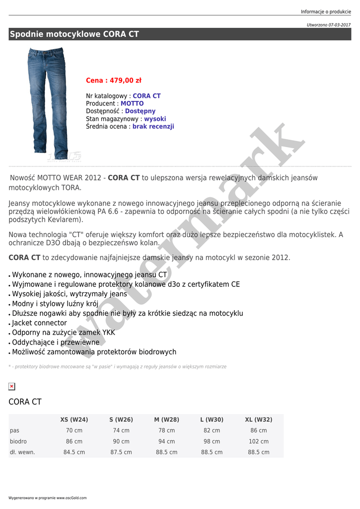 Informacje o produkcie Utworzono 07-03-2017 Spodnie motocyklowe CORA CT Cena : 479,00 zł er m ar k Nr katalogowy : CORA CT Producent : MOTTO Dostępność : Dostępny Stan magazynowy : wysoki Średnia ocena : brak recenzji Nowość MOTTO WEAR 2012 - CORA CT to ulepszona wersja rewelacyjnych damskich jeansów motocyklowych TORA. Jeansy motocyklowe wykonane z nowego innowacyjnego jeansu przeplecionego odporną na ścieranie przędzą wielowłókienkową PA 6.6 - zapewnia to odporność na ścieranie całych spodni (a nie tylko części podszytych Kevlarem). Nowa technologia "CT" oferuje większy komfort oraz dużo lepsze bezpieczeństwo dla motocyklistek. A ochranicze D3O dbają o bezpieczeńswo kolan. CORA CT to zdecydowanie najfajniejsze damskie jeansy na motocykl w sezonie 2012. ● ● ● ● ● ● ● at ● Wykonane z nowego, innowacyjnego jeansu CT Wyjmowane i regulowane protektory kolanowe d3o z certyfikatem CE Wysokiej jakości, wytrzymały jeans Modny i stylowy luźny krój Dłuższe nogawki aby spodnie nie były za krótkie siedząc na motocyklu Jacket connector Odporny na zużycie zamek YKK Oddychające i przewiewne Możliwość zamontowania protektorów biodrowych w ● * - protektory biodrowe mocowane są "w pasie" i wymagają z reguły jeansów o większym rozmiarze CORA CT XS (W24) S (W26) M (W28) L (W30) XL (W32) pas 70 cm 74 cm 78 cm 82 cm 86 cm biodro 86 cm 90 cm 94 cm 98 cm 102 cm 84.5 cm 87.5 cm 88.5 cm 88.5 cm 88.5 cm dł. wewn. Wygenerowano w programie www.oscGold.com Dostępne opcje Spodnie motocyklowe CORA CT w at er m ar k Rozmiary: XS, S, M, L, XL.