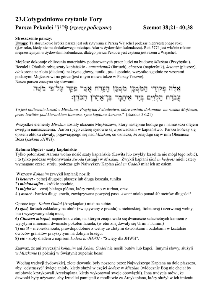 Parsza Pekudei ( פְּקוּדֵיrzeczy policzone)
