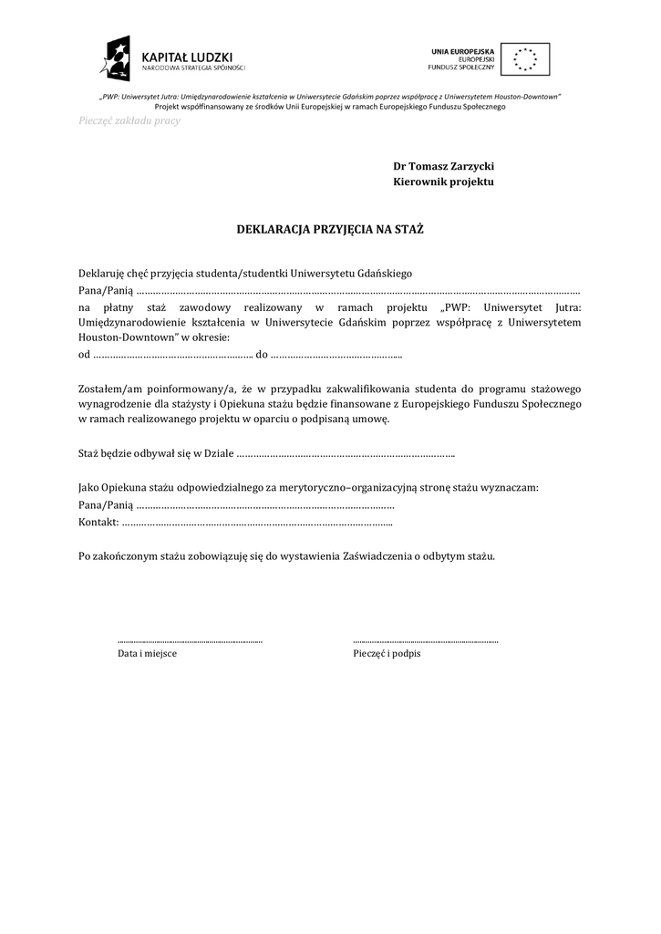 „PWP: Uniwersytet Jutra: Umiędzynarodowienie kształcenia w Uniwersytecie Gdańskim poprzez współpracę z Uniwersytetem Houston-Downtown” Projekt współfinansowany ze środków Unii Europejskiej w ramach Europejskiego Funduszu Społecznego Pieczęć zakładu pracy Dr Tomasz Zarzycki Kierownik projektu DEKLARACJA PRZYJĘCIA NA STAŻ Deklaruję chęć przyjęcia studenta/studentki Uniwersytetu Gdańskiego Pana/Panią ……………………………………………………………………………………………………………………………………………. na płatny staż zawodowy realizowany w ramach projektu „PWP: Uniwersytet Jutra: Umiędzynarodowienie kształcenia w Uniwersytecie Gdańskim poprzez współpracę z Uniwersytetem Houston-Downtown” w okresie: od …………………………………………………. do ………………………………………... Zostałem/am poinformowany/a, że w przypadku zakwalifikowania studenta do programu stażowego wynagrodzenie dla stażysty i Opiekuna stażu będzie finansowane z Europejskiego Funduszu Społecznego w ramach realizowanego projektu w oparciu o podpisaną umowę. Staż będzie odbywał się w Dziale ……………………………………………………………………. Jako Opiekuna stażu odpowiedzialnego za merytoryczno–organizacyjną stronę stażu wyznaczam: Pana/Panią ………………………………………………………………………………… Kontakt: …………………………………………………………………………………….. Po zakończonym stażu zobowiązuję się do wystawienia Zaświadczenia o odbytym stażu. ....................................................................... Data i miejsce ....................................................................... Pieczęć i podpis