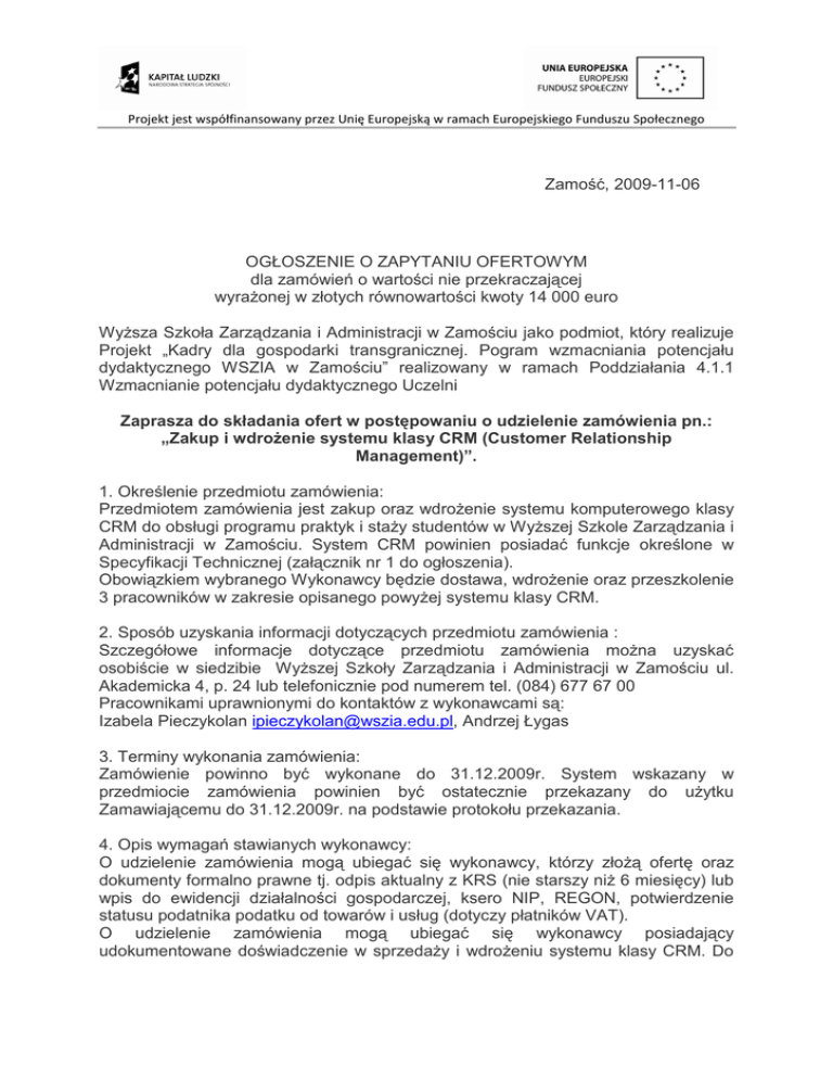 Projekt jest współfinansowany przez Unię Europejską w ramach Europejskiego Funduszu Społecznego Zamość, 2009-11-06 OGŁOSZENIE O ZAPYTANIU OFERTOWYM dla zamówień o wartości nie przekraczającej wyraŜonej w złotych równowartości kwoty 14 000 euro WyŜsza Szkoła Zarządzania i Administracji w Zamościu jako podmiot, który realizuje Projekt „Kadry dla gospodarki transgranicznej. Pogram wzmacniania potencjału dydaktycznego WSZIA w Zamościu” realizowany w ramach Poddziałania 4.1.1 Wzmacnianie potencjału dydaktycznego Uczelni Zaprasza do składania ofert w postępowaniu o udzielenie zamówienia pn.: „Zakup i wdroŜenie systemu klasy CRM (Customer Relationship Management)”. 1. Określenie przedmiotu zamówienia: Przedmiotem zamówienia jest zakup oraz wdroŜenie systemu komputerowego klasy CRM do obsługi programu praktyk i staŜy studentów w WyŜszej Szkole Zarządzania i Administracji w Zamościu. System CRM powinien posiadać funkcje określone w Specyfikacji Technicznej (załącznik nr 1 do ogłoszenia). Obowiązkiem wybranego Wykonawcy będzie dostawa, wdroŜenie oraz przeszkolenie 3 pracowników w zakresie opisanego powyŜej systemu klasy CRM. 2. Sposób uzyskania informacji dotyczących przedmiotu zamówienia : Szczegółowe informacje dotyczące przedmiotu zamówienia moŜna uzyskać osobiście w siedzibie WyŜszej Szkoły Zarządzania i Administracji w Zamościu ul. Akademicka 4, p. 24 lub telefonicznie pod numerem tel. (084) 677 67 00 Pracownikami uprawnionymi do kontaktów z wykonawcami są: Izabela Pieczykolan [email protected], Andrzej Łygas 3. Terminy wykonania zamówienia: Zamówienie powinno być wykonane do 31.12.2009r. System wskazany w przedmiocie zamówienia powinien być ostatecznie przekazany do uŜytku Zamawiającemu do 31.12.2009r. na podstawie protokołu przekazania. 4. Opis wymagań stawianych wykonawcy: O udzielenie zamówienia mogą ubiegać się wykonawcy, którzy złoŜą ofertę oraz dokumenty formalno prawne tj. odpis aktualny z KRS (nie starszy niŜ 6 miesięcy) lub wpis do ewidencji działalności gospodarczej, ksero NIP, REGON, potwierdzenie statusu podatnika podatku od towarów i usług (dotyczy płatników VAT). O udzielenie zamówienia mogą ubiegać się wykonawcy posiadający udokumentowane doświadczenie w sprzedaŜy i wdroŜeniu systemu klasy CRM. Do Projekt jest współfinansowany przez Unię Europejską w ramach Europejskiego Funduszu Społecznego oferty naleŜy dołączyć stosowne oświadczenie w tym zakresie (wzór załącznik nr 3 do ogłoszenia). 5. Kryteria wyboru oferty Zawarte w ofercie informacje powinny umoŜliwić jej ocenę pod kątem następujących kryteriów: - łączna cena za sprzedaŜ, wdroŜenie systemu klasy CRM - cena 100 %, Maksymalna liczba punktów do uzyskania: 100. 6. Opis sposobu wyboru oferty najkorzystniejszej Na wstępie zostaną odrzucone oferty: - z ceną przekraczającą kwotę zaplanowaną w budŜecie projektu, - nie spełniające wymagań wskazanych w ogłoszeniu i zaproszeniu. 7. Miejsce i termin składania ofert: Oferty naleŜy składać osobiście bądź pocztą w siedzibie WyŜszej Szkoły Zarządzania i Administracji w Zamościu ul. Akademicka 4, pok. nr 24, w terminie do dnia 13.11.2009 r. do godz. 15.30. Oferta winna być sporządzona na „Formularzu oferty cenowej” - druk do pobrania na stronie internetowej www.wszia.edu.pl. 8. Informacja o wyborze najkorzystniejszej oferty: Informacja o wyborze najkorzystniejszej oferty zawierająca: nazwę (firmę), siedzibę i adres wykonawcy, którego ofertę wybrano zostanie opublikowana na stronie internetowej www.wszia.edu.pl. 9. Informacja o terminie i miejscu podpisania umowy: Informacja o terminie i miejscu podpisania umowy zostanie przekazana wykonawcy, którego ofertę wybrano. 10. Niniejsze zamówienie nie jest realizowane w oparciu o ustawę z dnia 29 stycznia 2004 Prawo zamówień publicznych ale w oparciu o zasadę konkurencyjności w projekcie. Rektor WyŜszej Szkoły Zarządzania i Administracji w Zamościu Projekt jest współfinansowany przez Unię Europejską w ramach Europejskiego Funduszu Społecznego Załącznik nr 1 Specyfikacja Systemu klasy CRM do obsługi programu praktyk studenckich i staŜy w ramach Projektu „Kadry dla gospodarki transgranicznej. Pogram wzmacniania potencjału dydaktycznego WSZIA w Zamościu” SPECYFIKACJA SYSTEMU \ Zamość, 2009-10-19 Spis treści: Ogólny opis systemu............................................................................................................................ 4 UŜytkownicy systemu (role) ................................................................................................................ 5 Podstawowe czynności realizowane w systemie związane z rolami............................................ 5 Opis podstawowych funkcji systemu ................................................................................................. 6 Dodatkowe wymagania........................................................................................................................ 8 Projekt jest współfinansowany przez Unię Europejską w ramach Europejskiego Funduszu Społecznego Ogólny opis systemu Celem działania System klasy CRM do obsługi programu praktyk studenckich i staŜy (dalej zwanego systemem) jest wspomaganie procesu obsługi praktyk i staŜy studentów oraz absolwentów WSZiA w Zamościu. Aplikacja wspomagać będzie pracę działu Centrum Praktyk Studenckich zgodnie z procedurą PQ 05.04 Organizacja praktyk zawodowych studentów procesu P 05 - Obsługa procesu dydaktycznego Systemu Zarządzania Jakością WSZiA, zgodnego ze standardem ISO 9001:2000. System powinien być oparty na technologii CMS (ang. Content Management System – system zarządzania treścią). Powinien umoŜliwiać uŜytkownikowi tworzenie, edycję i zarządzanie treścią oraz plikami w nim zamieszczonymi przy pomocy prostych interfejsów graficznych. Powinien zawierać czę