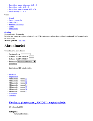 Przejdź do menu głównego ALT + 0 Przejdź do treści ALT + 1 Przejdź do wyszukiwarki ALT + W Mapa strony ALT + 2 Close Urząd Sport i turystyka Gospodarka Kultura i edukacja Gmina Aktualności do góry Strona Gminy Konopiska http://www.konopiska.pl/urzad/aktualnosci/Z-koleda-na-wesolo-w-Konopiskach-Aleksandrii-i-Czestochowie/ st:14/printpdf Drukuj grafikę : tak / nie Aktualności wyszukiwarka aktualności Szukana fraza Data od (RRRR-MM-DD) Data do (RRRR-MM-DD) Kategorie wszystkie kategorie ... ▼ Szukaj Znaleziono 460 wiadomości. Pierwsza Poprzednia Aktualności - strona 11 Aktualności - strona 12 Aktualności - strona 13 Aktualności - strona 14 Aktualności - strona 15 Aktualności - strona 16 Aktualności - strona 17 Następna Ostatnia Konkurs plastyczny „ANIOŁ” - czytaj całość 27 listopada 2016 kategoria: Kultura i Edukacja Zapraszamy do udziału w konkursie plastycznym „ANIOŁ” zorganizowanym przez Gminne Centrum Kultury i Rekreacji w Konopiskach. Konkurs został objęty patronatem przez Ks. Sławomira Kaczmarka Proboszcza Parafii w Konopiskach, Jerzego Żurka Wójta Gminy Konopiska i Andrzeja Kwapisza Starosty Częstochowskiego Prace można przesyłać do 9 grudnia 2016r. Konkurs plastyczny „ANIOŁ” Konkurs plastyczny „ANIOŁ” - czytaj całość Zakończyły się zmagania Polskiej Ligi Bocci - czytaj całość 26 listopada 2016 kategoria: Sport i Turystyka Finał VII Mistrzostw Polski w Bocci 2016 w Drzonkowie/Zielonej Górze 17 - 20 listopada 2016 i kolejne dwa miejsca na podium zawodników "Prometeusa w kategorii BC- 5, drugie miejsce wywalczył RAFAŁ STASIAK, a ŁUKASZ SUDOŁ uplasował się na miejscu trzecim. Zakończyły się zmagania Polskiej Ligi Bocci Zakończyły się zmagania Polskiej Ligi Bocci - czytaj całość „Cybernauci – kompleksowy projekt kształtowania bezpiecznych zachowań w sieci” - czytaj całość 26 listopada 2016 kategoria: Kultura i Edukacja W bieżącym roku szkolnym w Zespole Szkolno-Przedszkolnym w Rększowicach przystąpiliśmy do realizacji projektu „Cybernauci – kompleksowy projekt kształtowania bezpiecznych zachowań w sieci”. Projekt realizowany jest pod honorowym patronatem Ministerstwa Cyfryzacji, Rzecznika Praw Dziecka i Ośrodka Rozwoju Edukacji. „Cybernauci – kompleksowy projekt kształtowan „Cybernauci – kompleksowy projekt kształtowania bezpiecznych zachowań w sieci” - czytaj całość Święty Mikołaj z Polakami na Wileńszczyźnie - czytaj całość 26 listopada 2016 kategoria: Kultura i Edukacja Stowarzyszenie Patriotyczne” Kresy” w Częstochowie organizuje akcję charytatywną dla Polaków mieszkających na Wileńszczyźnie. Akcja oparta na idei charytatywnej i patriotycznej. Polegać będzie na zbiórce artykułów żywnościowych, zabawek i maskotek oraz na zbiórce słodyczy. Święty Mikołaj z Polakami na Wileńszczyźnie Święty Mikołaj z Polakami na Wileńszczyźnie - czytaj całość I miejsce dla „AFERY i AFERKI” - czytaj całość 24 listopada 2016 kategoria: Kultura i Edukacja Zespoły taneczne „AFERKA” i „AFERA” z Gminnego Centrum Kultury i Rekreacji mają na swoim koncie kolejny sukces. Oba zespoły zajęły I miejsce na Przeglądzie Młodzieżowych Zespołów Tanecznych Powiatu Częstochowskiego, który odbył się 15 listopada w Klubie „Politechnik” w Częstochowie. I miejsce dla „AFERY i AFERKI” I miejsce dla „AFERY i AFERKI” - czytaj całość Przekazanie samochodu ratowniczo-gaśniczego dla OSP w Rększowicach - czytaj całość 23 listopada 2016 kategoria: Kultura i Edukacja 20 listopada 2016r. władze wojewódzkie i samorządowe oficjalnie przekazały średni samochód ratowniczo-gaśniczy MAN TGM 13.290 Ochotniczej Straży Pożarnej w Rększowicach. Po uroczystej Mszy Świętej odprawionej przez proboszcza Ks. Sebastiana Ciastek w Kościele Parafialnym pojazd został poświęcony a następnie na placu przy remizie odbyły się oficjalne uroczystości przekazania wozu bojowego druhnom i druhom z Rększowic. Przekazanie samochodu ratowniczo-gaśniczego dla O Przekazanie samochodu ratowniczo-gaśniczego dla OSP w Rększowicach - czytaj całość Podsumowanie rocznej działalności PZHGP w Konopiskach czytaj całość 22 listopada 2016 kategoria: Kultura i Edukacja W sobotę 19 listopada 2016r. odbyła się uroczystość podsumowująca roczne osiągnięcia Polskiego Związku Hodowców Gołębi Pocztowych Oddział w Konopiskach. Imprezę otworzył Prezes PZHGP p. Krzysztof Szymanek witając serdecznie Wójta Gminy Konopiska Jerzego Żurka i przybyłych gości. Podsumowanie rocznej działalności PZHGP w Konopi Podsumowanie rocznej działalności PZHGP w Konopiskach - czytaj całość Zaproszenie na warsztaty fotograficzne - czytaj całość 21 listopada 2016 kategoria: Kultura i Edukacja Regionalny Ośrodek Kultury w Częstochowie i galeria Gallery ART FOTO zaprasza 27 listopada 2016r. na godzinę 10.00 na Fotowarsztaty studyjne w ramach projektu: „Mobilnego Uniwersytetu Kultury i Sztuki” - "OKO W OKO CZYLI TAJEMNICE UDANEGO PORTRETU" - Beata Mendrek i Antoni Kreis. Zaproszenie na warsztaty fotograficzne Zaproszenie na warsztaty fotograficzne - czytaj całość List od Królowej Elżbiety II dla uczniów z ZSP w Kopalni czytaj całość 18 listopada 2016 kategoria: Kultura i Edukacja W kwietniu Królowa Elżbieta II obchodziła swoje 90. urodziny. Z tej okazji uczniowie Zespołu Szkolno-Przedszkolnego im. Jana Pawła II w Kopalni w ramach koła języka angielskiego napisali list oraz wykonali piękne kartki z życzeniami. Prace zostały wysłane do Pałacu Buckingham w Londynie, oficjalnej rezydencji królowej. List od Królowej Elżbiety II dla uczniów z ZSP List od Królowej Elżbiety II dla uczniów z ZSP w Kopalni - czytaj całość DZIEŃ OTWARTY NOTARIATU 2016 - czytaj całość 17 listopada 2016 kategoria: Kultura i Edukacja 26 listopada 2016r. w godzinach od 10.00 do 16.00, w Muzeum Częstochowskim - Ratuszu przy Al. NMP 4
