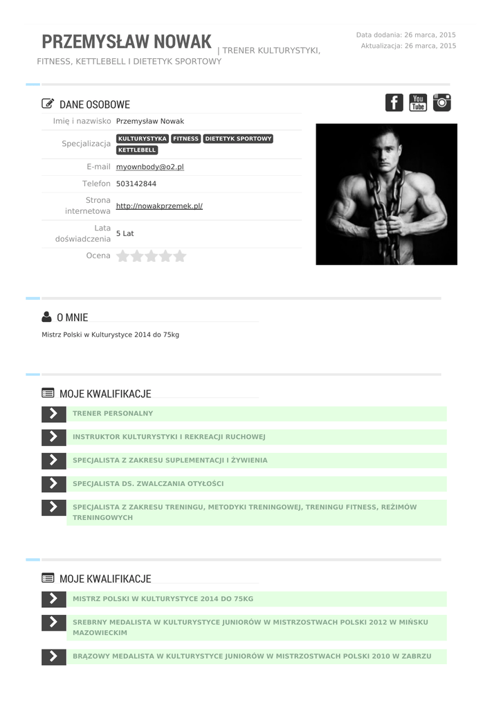 PRZEMYSŁAW NOWAK | TRENER KULTURYSTYKI, FITNESS, KETTLEBELL I DIETETYK SPORTOWY Data dodania: 26 marca, 2015 Aktualizacja: 26 marca, 2015 DANE OSOBOWE Imię i nazwisko Przemysław Nowak Specjalizacja KULTURYSTYKA FITNESS DIETETYK SPORTOWY KETTLEBELL E-mail [email protected] Telefon 503142844 Strona http://nowakprzemek.pl/ internetowa Lata 5 Lat doświadczenia Ocena O MNIE Mistrz Polski w Kulturystyce 2014 do 75kg MOJE KWALIFIKACJE TRENER PERSONALNY INSTRUKTOR KULTURYSTYKI I REKREACJI RUCHOWEJ SPECJALISTA Z ZAKRESU SUPLEMENTACJI I ŻYWIENIA SPECJALISTA DS. ZWALCZANIA OTYŁOŚCI SPECJALISTA Z ZAKRESU TRENINGU, METODYKI TRENINGOWEJ, TRENINGU FITNESS, REŻIMÓW TRENINGOWYCH MOJE KWALIFIKACJE MISTRZ POLSKI W KULTURYSTYCE 2014 DO 75KG SREBRNY MEDALISTA W KULTURYSTYCE JUNIORÓW W MISTRZOSTWACH POLSKI 2012 W MIŃSKU MAZOWIECKIM BRĄZOWY MEDALISTA W KULTURYSTYCE JUNIORÓW W MISTRZOSTWACH POLSKI 2010 W ZABRZU JAK WYGLĄDA PIERWSZE SPOTKANIE Rozmowa MIEJSCE ZAJĘĆ Trener prowadzi zajęcia ON-LINE Miejsca w których trener prowadzi zajęcia stacjonarne: Adres Warszawa PREFEROWANE DNI I GODZINY ZAJĘĆ 7 dni w tygodniu konsultacje. Pracuję od godziny 5 rano do 22-23, także zapraszam poprzez kontakt mailowy. Jeśli chodzi o telefoniczne konsultacje prosiłbym o rozsądek. GALERIA Link do profilu: http://przemyslaw-nowak.kulturysta.com/