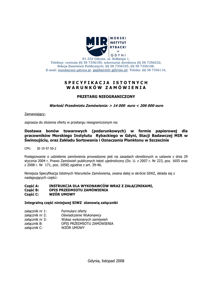 81-332 Gdynia, ul. Kołłątaja 1, Telefony: centrala (0) 58 7356100, sekretariat dyrektora (0) 58 7356232; Sekcja Zamówień Publicznych: (0) 58 7356105, (0) 58 7356108, E-mail: [email protected], [email protected]; Telefax: (0) 58 7356110, SPECYFIKACJA ISTOTNYCH WARUNKÓW ZAMÓWIENIA PRZETARG NIEOGRANICZONY Wartość Przedmiotu Zamówienia: > 14 000 euro < 206 000 euro Zamawiający: zaprasza do złoŜenia oferty w przetargu nieograniczonym na: Dostawa bonów towarowych (podarunkowych) w formie papierowej dla pracowników Morskiego Instytutu Rybackiego w Gdyni, Stacji Badawczej MIR w Świnoujściu, oraz Zakładu Sortowania i Oznaczania Planktonu w Szczecinie CPV: 30 19 97 50-2 Postępowanie o udzielenie zamówienia prowadzone jest na zasadach określonych w ustawie z dnia 29 stycznia 2004 r. Prawo Zamówień publicznych tekst ujednolicony (Dz. U. z 2007 r. Nr 223, poz. 1655 oraz z 2008 r. Nr 171, poz. 1058) zgodnie z art. 39-46. Niniejsza Specyfikacja Istotnych Warunków Zamówienia, zwana dalej w skrócie SIWZ, składa się z następujących części: Część A: Część B: Część C: INSTRUKCJA DLA WYKONAWCÓW WRAZ Z ZAŁĄCZNIKAMI, OPIS PRZEDMIOTU ZAMÓWIENIA WZÓR UMOWY Integralną część niniejszej SIWZ stanowią załączniki załącznik załącznik załącznik załącznik załącznik nr 1: nr 2: nr 3: B: C: Formularz oferty Oświadczenie Wykonawcy Wykaz wykonanych zamówień OPIS PRZEDMIOTU ZAMÓWIENIA WZÓR UMOWY Gdynia, listopad 2008 Składane oferta oraz dokumenty stanowiące załączniki w ofercie winny być ułoŜone w kolejności przedstawionej na stronie 1- szej SIWZ oraz w opisie Rozdz. VI CZĘŚĆ A: INSTRUKCJA DLA WYKONAWCÓW Rozdział I Informacje ogólne 1. Wykonawca przedstawi ofertę zgodną z postanowieniami SIWZ. 2. Niniejszą SIWZ moŜna wykorzystać wyłącznie zgodnie z jej przeznaczeniem, nie moŜna udostępniać jej osobom trzecim. 3. KaŜdy Wykonawca złoŜy tylko jedną ofertę (wypełniony Formularz oferty wraz z wymaganymi przez SIWZ dokumentami). 4. ZłoŜenie większej liczby ofert spowoduje odrzucenie wszystkich ofert złoŜonych przez danego Wykonawcę. 5. Wykonawca poniesie wszelkie koszty związane z przygotowaniem i złoŜeniem oferty. Rozdział II Opis sposobu przygotowania ofert Składane dokumenty wyszczególnione w Rozdz. VI winny być ułoŜone w ofercie w kolejności przedstawionej w opisie. 1. Ofertę sporządza się w języku polskim. 2. Ofertę składa się, pod rygorem niewaŜności, w formie pisemnej. Zamawiający nie wyraŜa zgody na złoŜenie oferty w postaci elektronicznej. 3. Oferta winna być napisana na maszynie do pisania lub ręcznie długopisem albo nieścieralnym atramentem - oferta moŜe mieć takŜe postać wydruku komputerowego. Oferty nieczytelne nie będą rozpatrywane - zostaną odrzucone. 4. Zaleca się aby oferta była zszyta lub spięta trwale (np. zbindowana) i posiadała ponumerowane strony. 5. Oferta (wypełniony Formularz oferty wraz z wymaganymi przez SIWZ dokumentami) zostanie podpisana przez osobę/osoby upowaŜnioną/e do reprezentowania Wykonawcy. 6. Pełnomocnictwo do podpisania oferty winno być dołączone do oferty, o ile nie wynika z innych dokumentów załączonych do oferty (np. z odpisu z KRS, zaświadczenia o wpisie do ewidencji działalności gospodarczej). Pełnomocnictwo winno być dołączone w oryginale lub kopii poświadczonej notarialnie, bądź przez jego wystawcę. 7. Podpisy, złoŜone przez Wykonawcę w Formularzu oferty oraz innych formularzach zawartych w SIWZ, powinny być opatrzone czytelnym imieniem i nazwiskiem oraz pieczęcią imienną. 8. Wszystkie miejsca, w których Wykonawca naniósł zmiany winny być parafowane przez osobę /osoby/ podpisującą ofertę. 2 9. Wszystkie formularze zawarte w niniejszej specyfikacji, a w szczególności formularz oferty Wykonawca wypełni ściśle według wskazówek zawartych w SIWZ. W przypadku, gdy jakakolwiek część dokumentów nie dotyczy Wykonawcy - wpisuje "nie dotyczy". 10. Wykonawca moŜe złoŜyć ofertę na własnych formularzach, których treść i układ graficzny muszą być zgodne z formularzami załączonymi do SIWZ. 11. Wykonawca umieści ofertę w kopercie, które będzie zaadresowana: /nazwa i adres Zamawiającego/ oraz będzie posiadać następujące oznaczenie: „Dostawa bonów towarowych (podarunkowych) w formie papierowej dla pracowników Morskiego Instytutu Rybackiego w Gdyni, Stacji Badawczej MIR w Świnoujściu, oraz Zakładu Sortowania i Oznaczania Planktonu w Szczecinie” nie otwierać do dnia 28.11.2008 r. do godz. 09:30. Wykonawca umieści na kopercie takŜe swoją nazwę (firmę) oraz adres. 12. Zamawiający nie ponosi odpowiedzialności za przypadkowe otwarcie oferty przetargowej w sytuacji niezgodnego z powyŜszym sposobem opisania oferty. 13. Koperta winna być szczelnie zamknięta w sposób uniemoŜliwiający zapoznanie się z treścią oferty. 14. Wykonawca moŜe wprowadzić zmiany lub wycofać złoŜoną ofertę przed upływem terminu składania ofert. 15. W celu dokonania zmiany lub wycofania oferty, Wykonawca złoŜy Zamawiającemu kolejną zamkniętą kopertę, oznaczoną jak w punkcie 11 i 12, z dodaniem słowa: "Zmiana" lub "Wycofanie". 16. Wykonawca nie moŜe wycofać oferty ani wprowadzić jakichkolwiek zmian w treści oferty po upływie terminu składania ofert. 17. Oferta jest jawna od chwili jej otwarcia, z wyjątkiem informacji stanowiących tajemnicę przedsiębiorstwa w rozumieniu przepisów o zwalczaniu nieuczciwej konkurencji, jeŜeli Wykonawca nie później niŜ w terminie składania ofert zastrzegł, Ŝe nie mogą one być udostępniane. 18. Przez tajemnicę przedsiębiorstwa rozumie się nie ujawnione do wiadomości publicznej informacje techniczne, technologiczne, organizacyjne przedsiębiorstwa lub inne informacje posiadające wartość gospodarczą, co do których przedsiębiorca podjął niezbędne działania w celu zachowania ich poufności. Wykonawca nie moŜe zastrzec swojej nazw