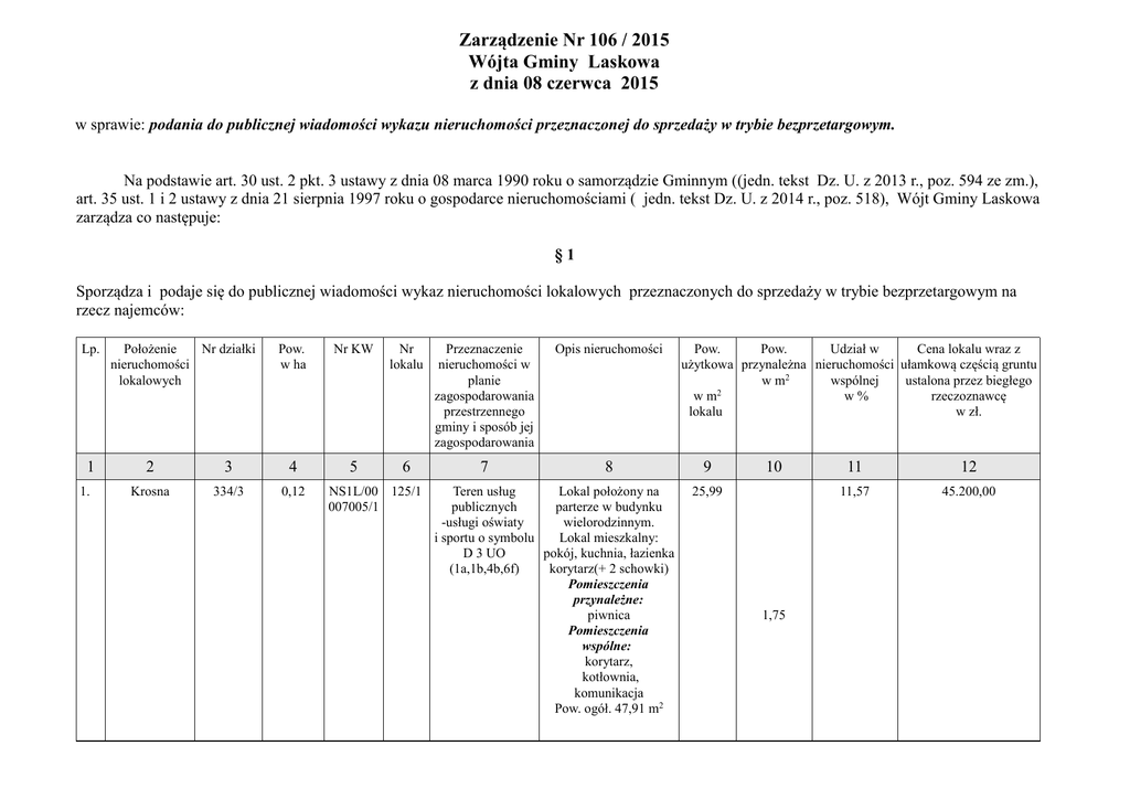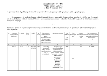 Zarządzenie Nr 106 / 2015 Wójta Gminy Laskowa z dnia 08 czerwca 2015 w sprawie: podania do publicznej wiadomości wykazu nieruchomości przeznaczonej do sprzedaży w trybie bezprzetargowym. Na podstawie art. 30 ust. 2 pkt. 3 ustawy z dnia 08 marca 1990 roku o samorządzie Gminnym ((jedn. tekst Dz. U. z 2013 r., poz. 594 ze zm.), art. 35 ust. 1 i 2 ustawy z dnia 21 sierpnia 1997 roku o gospodarce nieruchomościami ( jedn. tekst Dz. U. z 2014 r., poz. 518), Wójt Gminy Laskowa zarządza co następuje: §1 Sporządza i podaje się do publicznej wiadomości wykaz nieruchomości lokalowych przeznaczonych do sprzedaży w trybie bezprzetargowym na rzecz najemców: Lp. 1 1. Położenie Nr działki nieruchomości lokalowych Pow. w ha Nr KW Nr lokalu Przeznaczenie nieruchomości w planie zagospodarowania przestrzennego gminy i sposób jej zagospodarowania Opis nieruchomości 5 6 7 8 2 3 4 Krosna 334/3 0,12 NS1L/00 125/1 007005/1 Teren usług Lokal położony na publicznych parterze w budynku -usługi oświaty wielorodzinnym. i sportu o symbolu Lokal mieszkalny: D 3 UO pokój, kuchnia, łazienka (1a,1b,4b,6f) korytarz(+ 2 schowki) Pomieszczenia przynależne: piwnica Pomieszczenia wspólne: korytarz, kotłownia, komunikacja Pow. ogół. 47,91 m2 Pow. Pow. Udział w Cena lokalu wraz z użytkowa przynależna nieruchomości ułamkową częścią gruntu w m2 wspólnej ustalona przez biegłego 2 wm w% rzeczoznawcę lokalu w zł. 9 10 25,99 1,75 11 12 11,57 45.200,00 2. 3. Krosna Krosna 334/3 334/3 0,12 0,12 NS1L/00 125/2 007005/1 NS1L/00 125/3 007005/1 Teren usług publicznych -usługi oświaty i sportu o symbolu D 3 UO (1a,1b,4b,6f) Teren usług publicznych -usługi oświaty i sportu o symbolu D 3 UO (1a,1b,4b,6f) Lokal położony na parterze w budynku wielorodzinnym. Lokal mieszkalny: 2 pokoje, kuchnia, łazienka, korytarz Pomieszczenia przynależne: piwnica Pomieszczenia wspólne: korytarz, kotłownia, komunikacja Pow. ogół. 47,91 m2 35,10 Lokal położony na parterze w budynku wielorodzinnym. Lokal mieszkalny: 2 pokoje, kuchnia, łazienka korytarz(+ 2 schowki) Pomieszczenia przynależne: piwnica Pomieszczenia wspólne: korytarz, kotłownia, komunikacja Pow. ogół. 47,91 m2 47,74 15,82 59.590,00 22,07 81.710,00 2,81 5,15 4. 5. Krosna Krosna 334/3 334/3 0,12 0,12 NS1L/00 125/4 007005/1 NS1L/00 125/5 007005/1 Teren usług publicznych -usługi oświaty i sportu o symbolu D 3 UO (1a,1b,4b,6f) Teren usług publicznych -usługi oświaty i sportu o symbolu D 3 UO (1a,1b,4b,6f) Lokal położony na piętrze w budynku wielorodzinnym. Lokal mieszkalny: 2 pokoje, kuchnia, łazienka korytarz, w.c, Pomieszczenia przynależne: piwnica Pomieszczenia wspólne: korytarz, kotłownia, komunikacja Pow. ogół. 47,91 m2 62,18 Lokal położony na piętrze w budynku wielorodzinnym. Lokal mieszkalny:2 pokoje, kuchnia, łazienka korytarz(+ 2 schowki) Pomieszczenia przynależne: piwnica Pomieszczenia wspólne: korytarz, kotłownia, komunikacja Pow. ogół. 47,91 m2 47,67 28,30 105.280,00 22,24 81.590,00 5,64 5,64 Osobom, którym przysługuje pierwszeństwo w nabyciu w/w nieruchomości lokalowej wyznacza się 6 tygodniowy termin do złożenia wniosku o nabycie, który przypada od dnia 10 czerwca 2015 r. do dnia 22 lipca 2015 r.( art. 34 ust.1 ustawy z dnia 21 sierpnia 1997 roku o gospodarce nieruchomościami ( jedn. tekst Dz. U. z 2014 r., poz. 518 ) W/w nieruchomość lokalowa nie podlega opodatkowaniu podatkiem od towarów i usług. Wykaz podaje się do publicznej wiadomości poprzez wywieszenie na tablicy ogłoszeń i umieszczenie na stronie internetowej Urzędu Gminy Laskowa na 21 dni tj. od 10 czerwca 2015 r. do dnia 30 czerwca 2015 r. oraz w prasie lokalnej. §2 Wykonanie Zarządzenia zleca się Kierownikowi Referatu Gospodarki Nieruchomościami zagospodarowania Przestrzennego, Inwestycji, Rolnictwa, Leśnictwa i Ochrony Środowiska. §3 Zarządzenie wchodzi w życie z dniem podpisania i podlega ogłoszeniu poprzez wywieszenie na tablicy ogłoszeń w budynku Urzędu Gminny przez okres 21 dni jak również na stronie internetowej gminy oraz podanie informacji w prasie lokalnej.