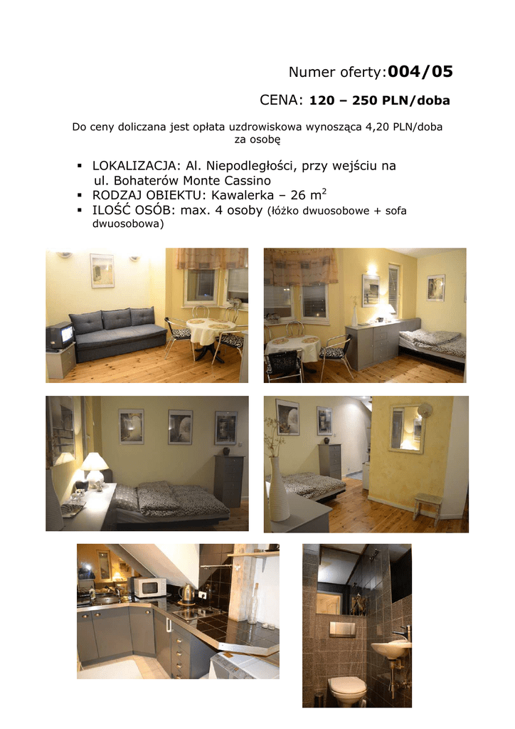 Numer oferty:004/05 CENA: 120 – 250 PLN/doba Do ceny doliczana jest opłata uzdrowiskowa wynosząca 4,20 PLN/doba za osobę LOKALIZACJA: Al. Niepodległości, przy wejściu na ul. Bohaterów Monte Cassino RODZAJ OBIEKTU: Kawalerka – 26 m2 ILOŚĆ OSÓB: max. 4 osoby (łóżko dwuosobowe + sofa dwuosobowa) Numer oferty: 004/05 LOKALIZACJA: al. Niepodległości Lp. PRZEDMIOT OCENY UWAGI 1. Nowe/stare budownictwo 2. Nowe/stare meble 3. Parking na posesji/Garaż Stara kamienica, mieszkanie po remoncie, otwarty aneks kuchenny Mebelki proste, nowoczesne, łóżko dwuosobowe i sofa rozsuwana, stolik + 2 krzesła Miejsce parkingowe w podwórzu 4. Balkon / taras / ogródek Nie 5. Telewizor (Kablówka, TV Sat), Radio TV Kablowa, Radio 6. Dostęp do telefonu przy dłuższym wynajmie możliwość podłączenia telefonu 7. Dostęp do internetu Nie Kuchnia Otwarty aneks kuchenny, kuchnia elektryczna z piekarnikiem, lodówka, mikrofala, pralka, czajnik, pełne wyposażenie w garnki, naczynia i sztućce 8. 9. Łazienka Łazienka – brodzik z prysznicem i WC w jednym pomieszczeniu 10. Pościel, ręczniki Dostępne na miejscu 11. Dostęp do szafy / półek Duża szafa w przedpokoju i małe szafki w pokoiku 12. Pobyt ze zwierzątkiem Tak, ale duże zwierzątka po negocjacji 14. Niepełnosprawni (winda, podjazd) III piętro, strome ale szerokie schody 16. Lokalizacja • Centrum – Dworzec PKP • Plaża, park • Dzielnica • Komunikacja miejska 17. Osoby palące Centrum, 7 minut od dworca PKP, 700 m w linii prostej ulicą Boh. Monte Cassino do molo i plaży, pod domem przystanek autobusowy (S, 21, 181, 187, 185, 09) oraz PKS i Polski Express, niedaleko przystanek autobusowy linii 143, 122, 117 /okna mieszkania wychodzą na podwórze. W pobliżu restauracje. Tak 19. Faktura VAT lub Rachunek Rachunek